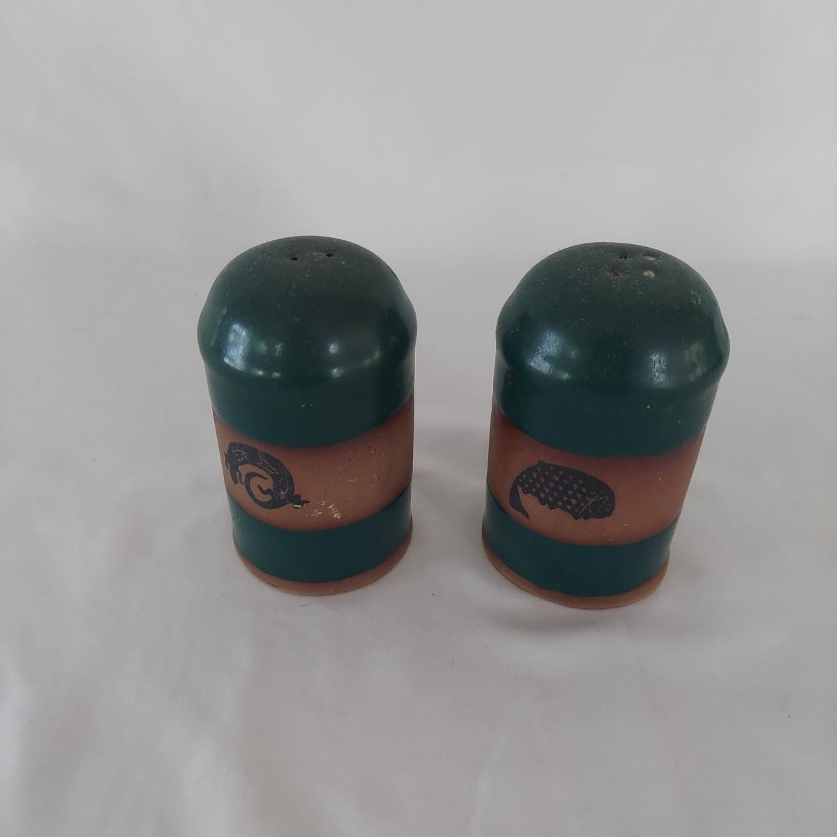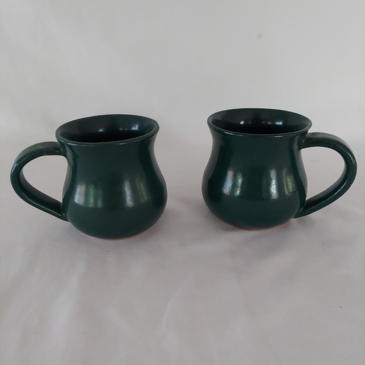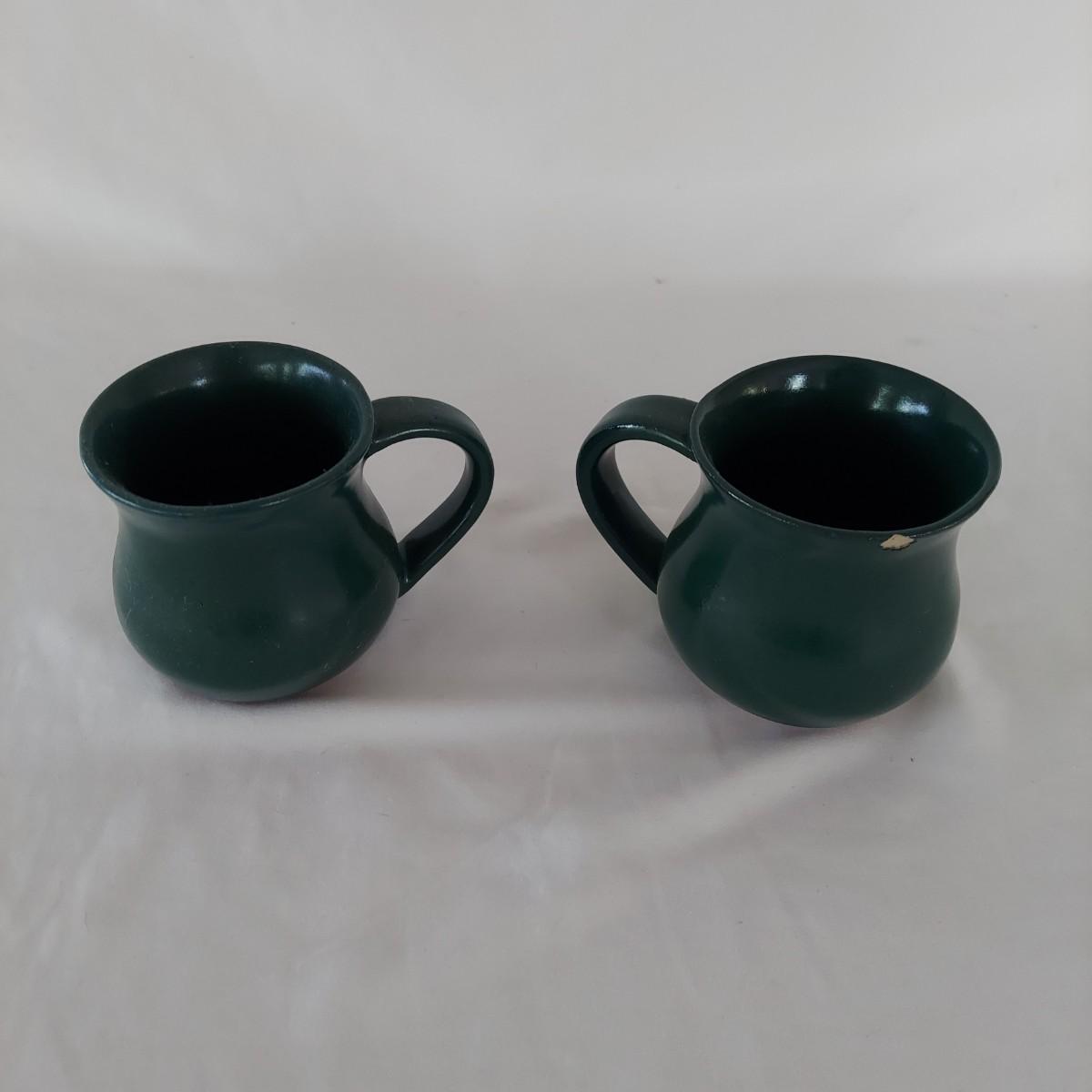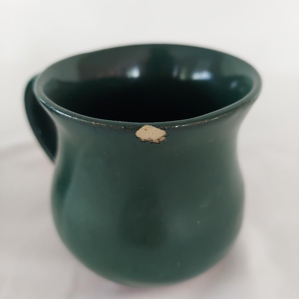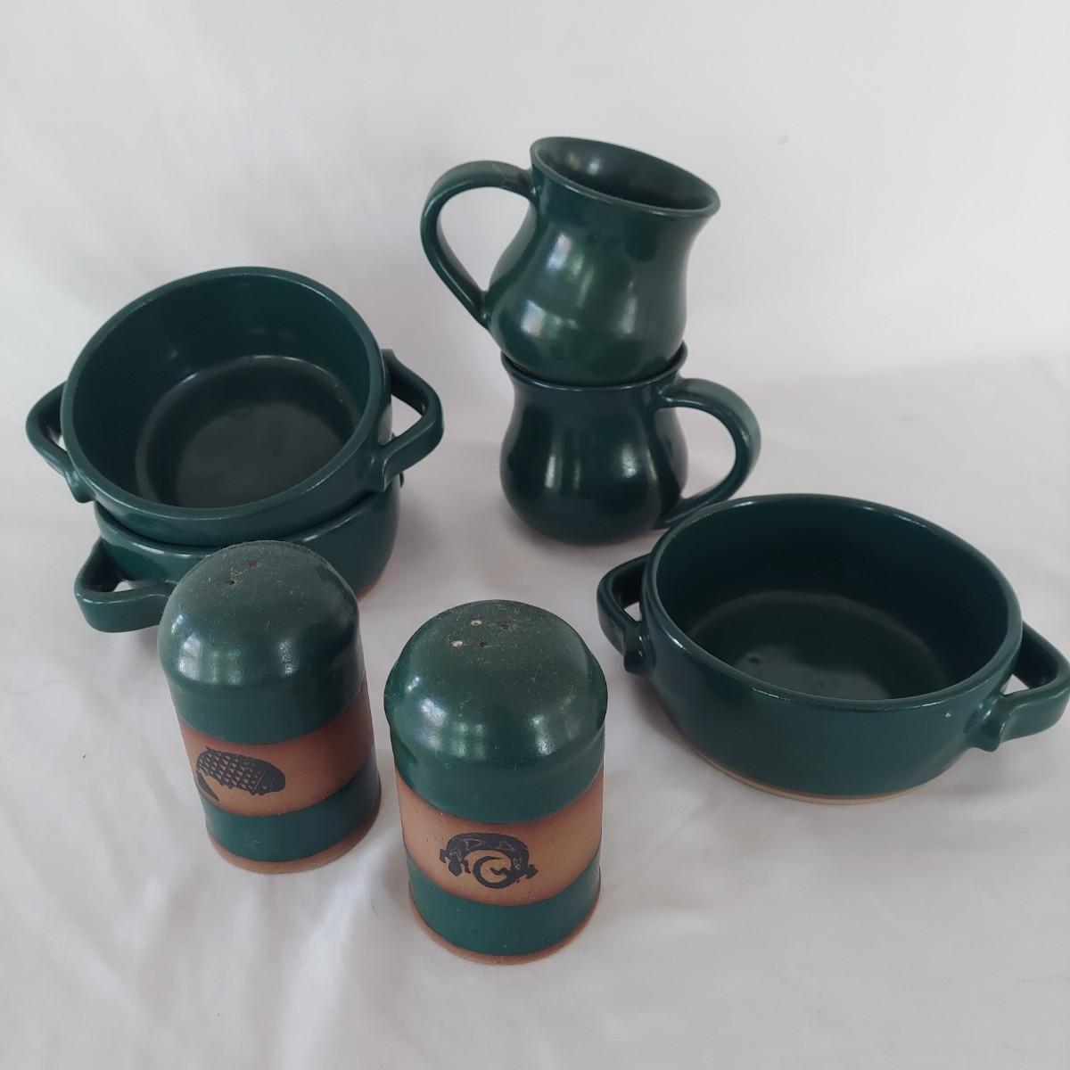 Always Azul Pottery from Village Grove, CO. Stone ware dishes with green glaze. There are two mugs, three soup bowls as well as salt and pepper shakers. The bowls are 2" deep and 5" across. The mugs are 3.5" tall. There is a chip on one of the mugs. Please see photos. Shipping available