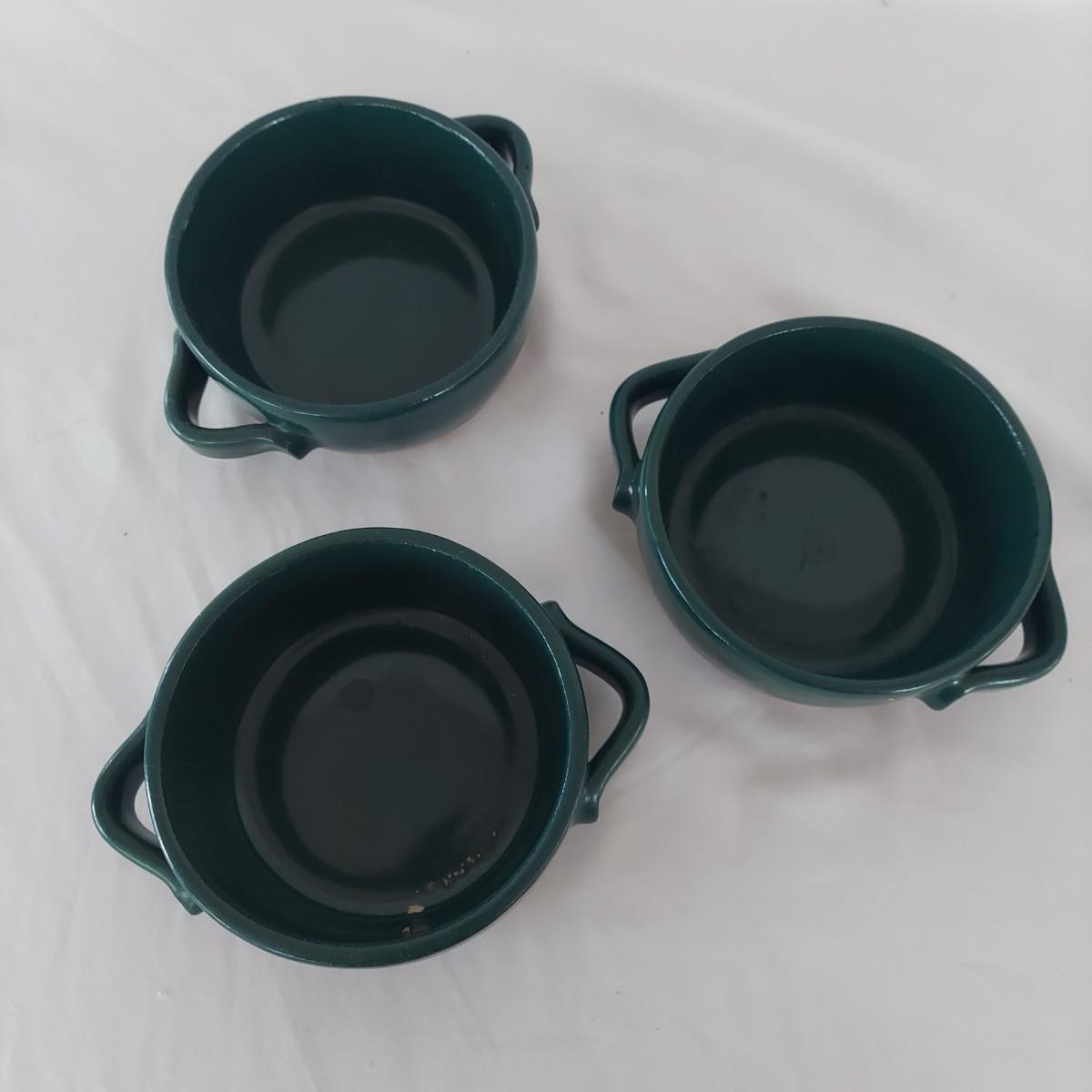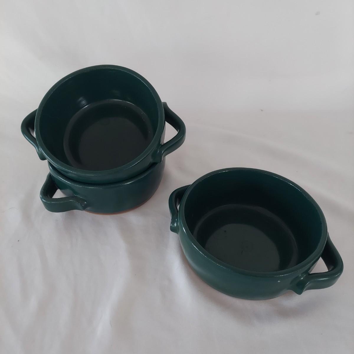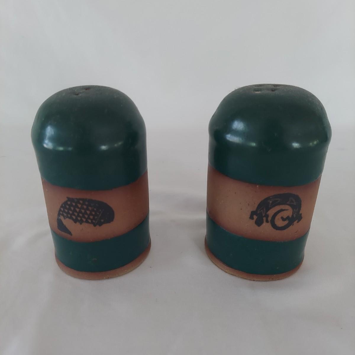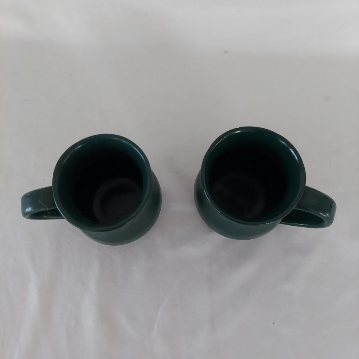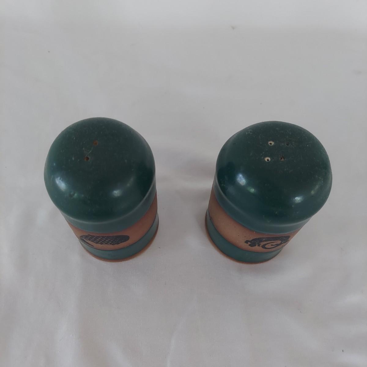 Always Azul Pottery from Village Grove, CO. Stone ware dishes with green glaze. There are two mugs, three soup bowls as well as salt and pepper shakers. The bowls are 2" deep and 5" across. The mugs are 3.5" tall. There is a chip on one of the mugs. Please see photos. Shipping available