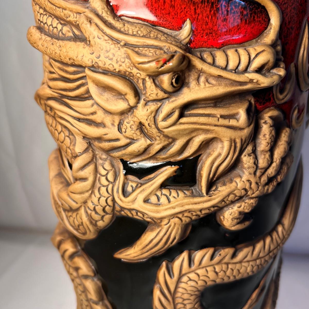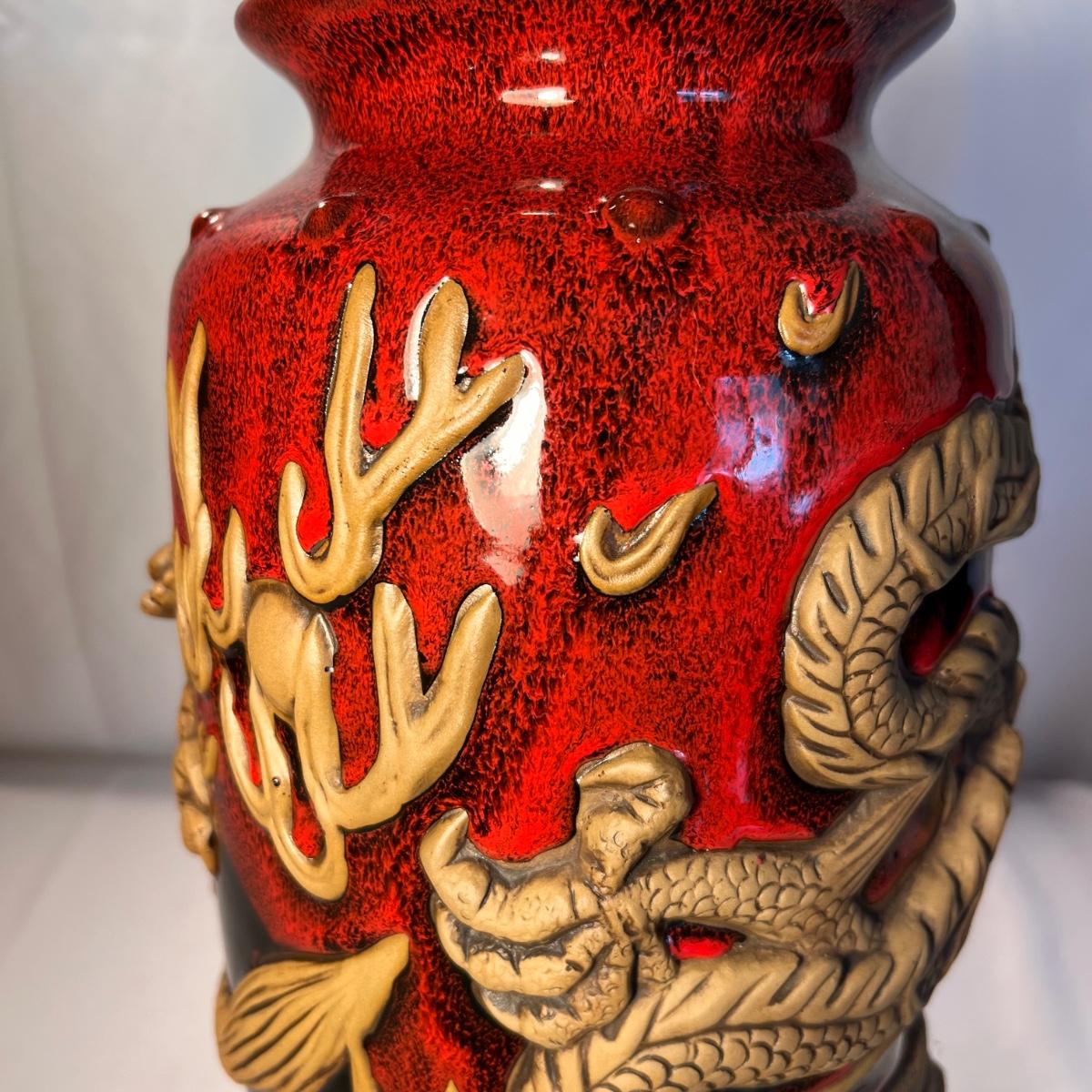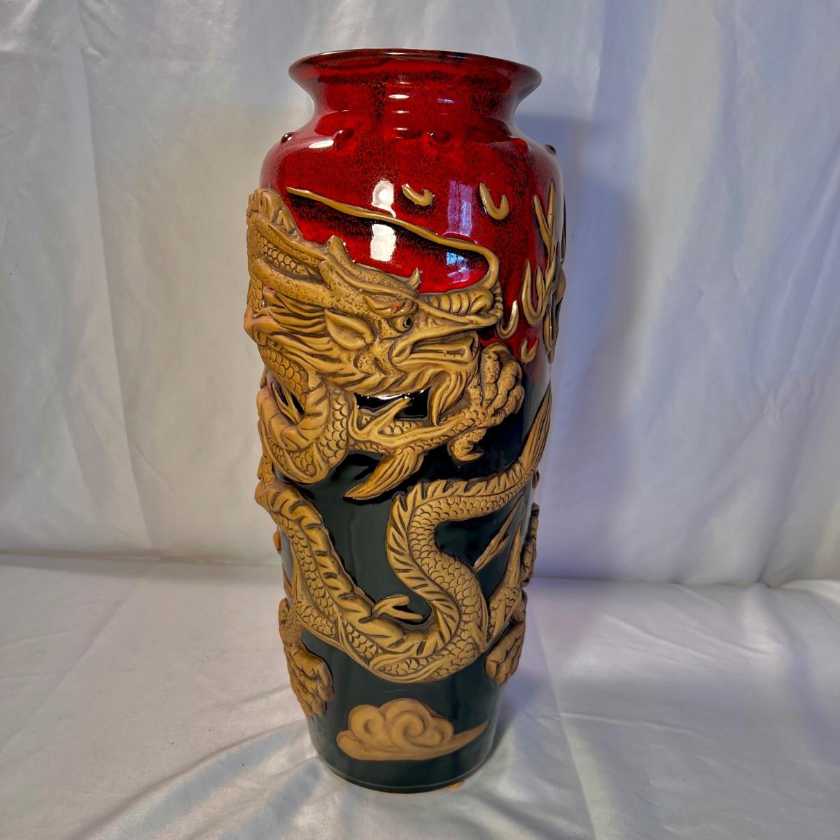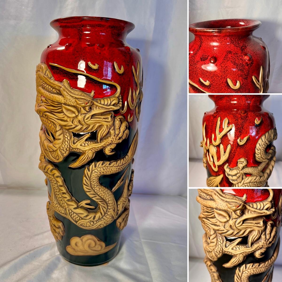 This stunning pottery vase has a rich red glazed body with intricate dragon embellishments that have been left unglazed. Dragon has a glass eye. Base has cork pads for furniture protecting.