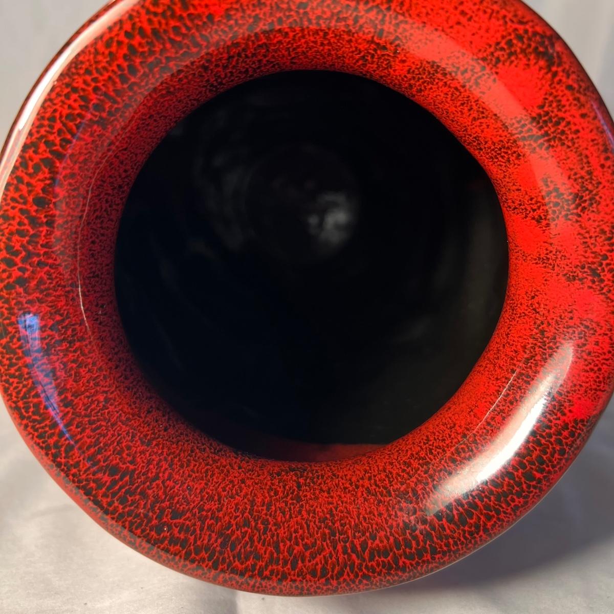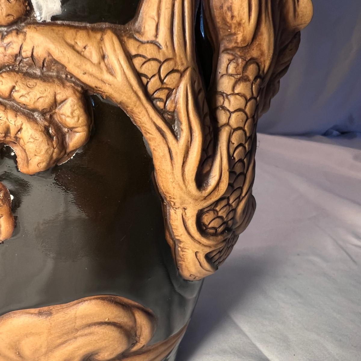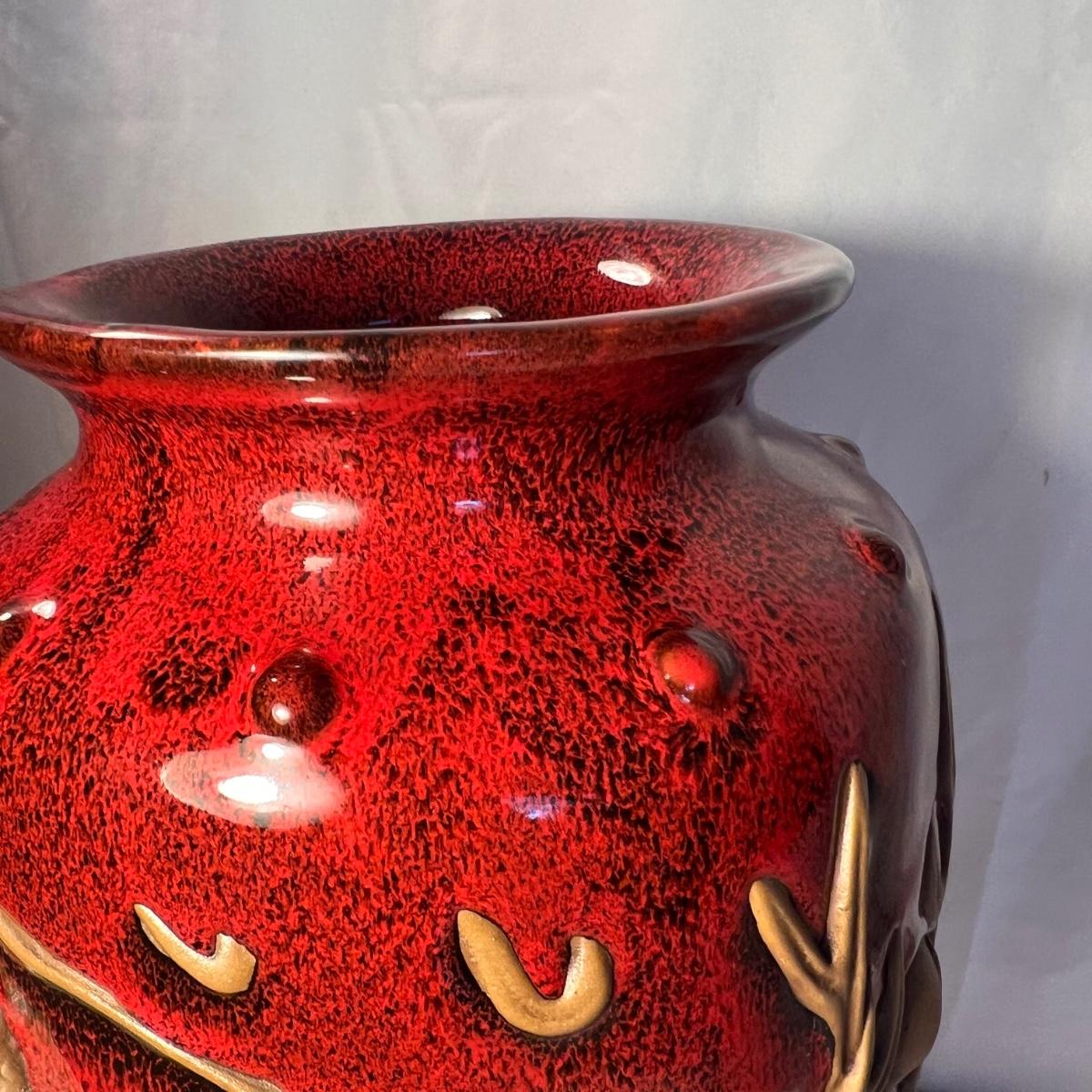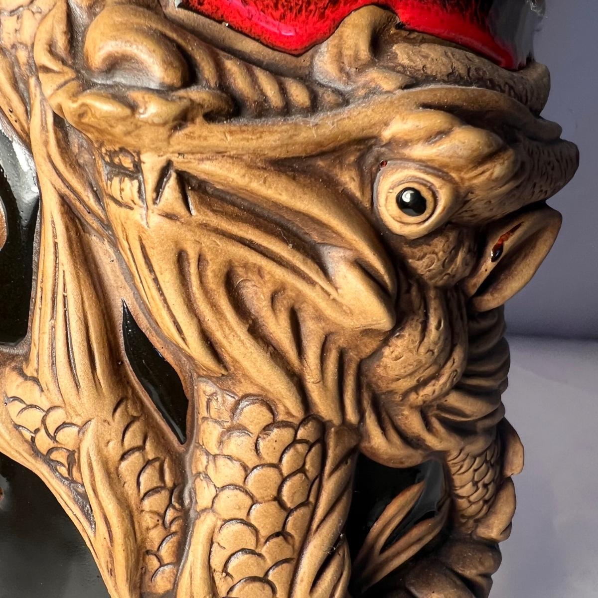 This stunning pottery vase has a rich red glazed body with intricate dragon embellishments that have been left unglazed. Dragon has a glass eye. Base has cork pads for furniture protecting.
