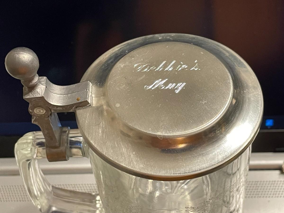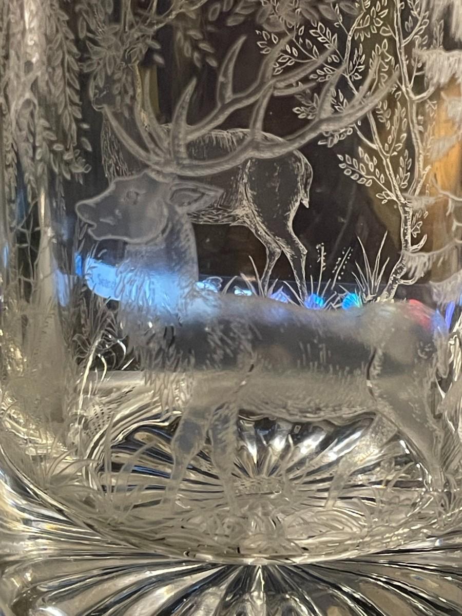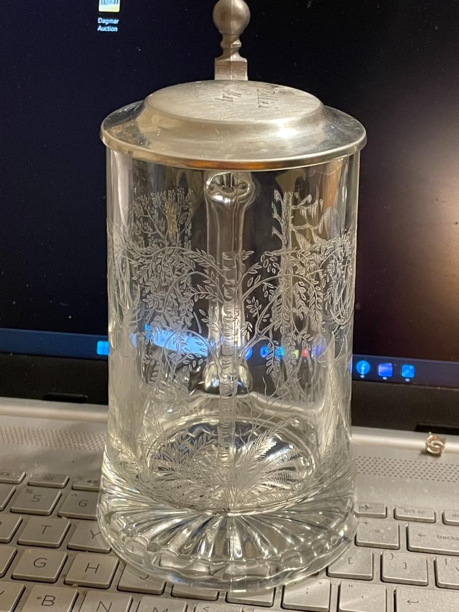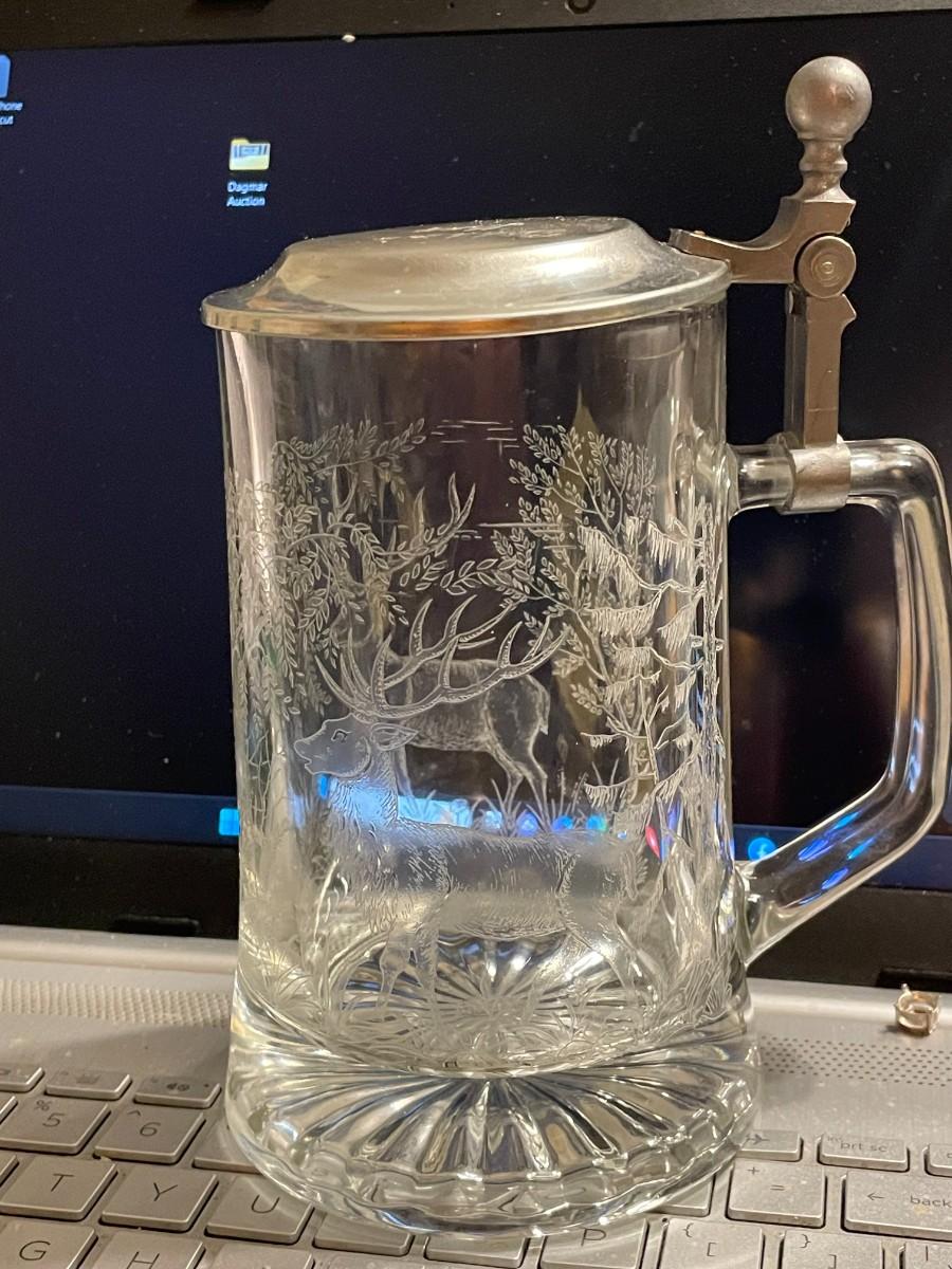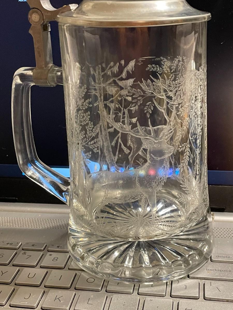 ALWE German Clear Etched Glass Beer Stein with Deer Scene 6" Tall with Pewter Engraved Lid as Pic'd.