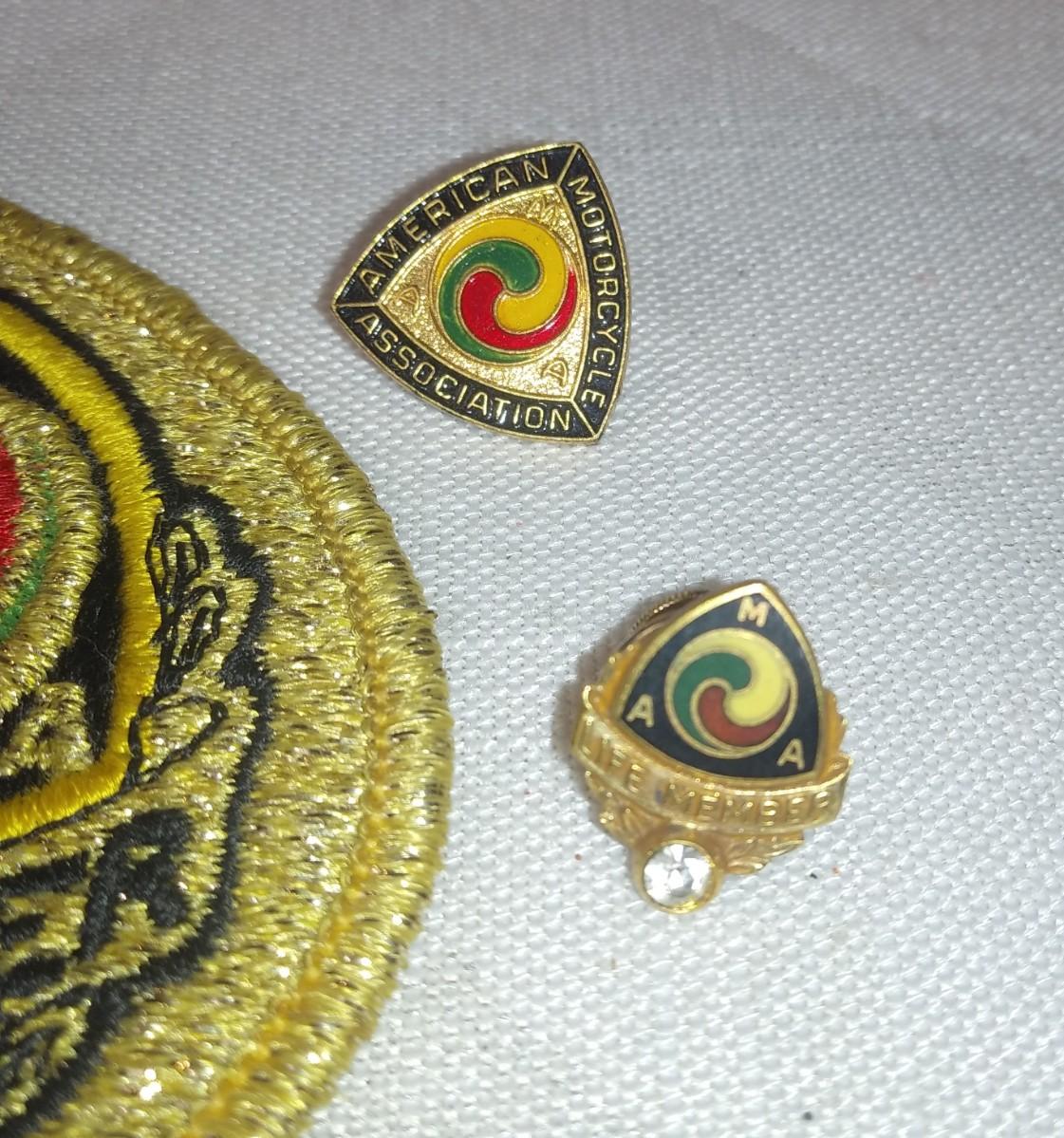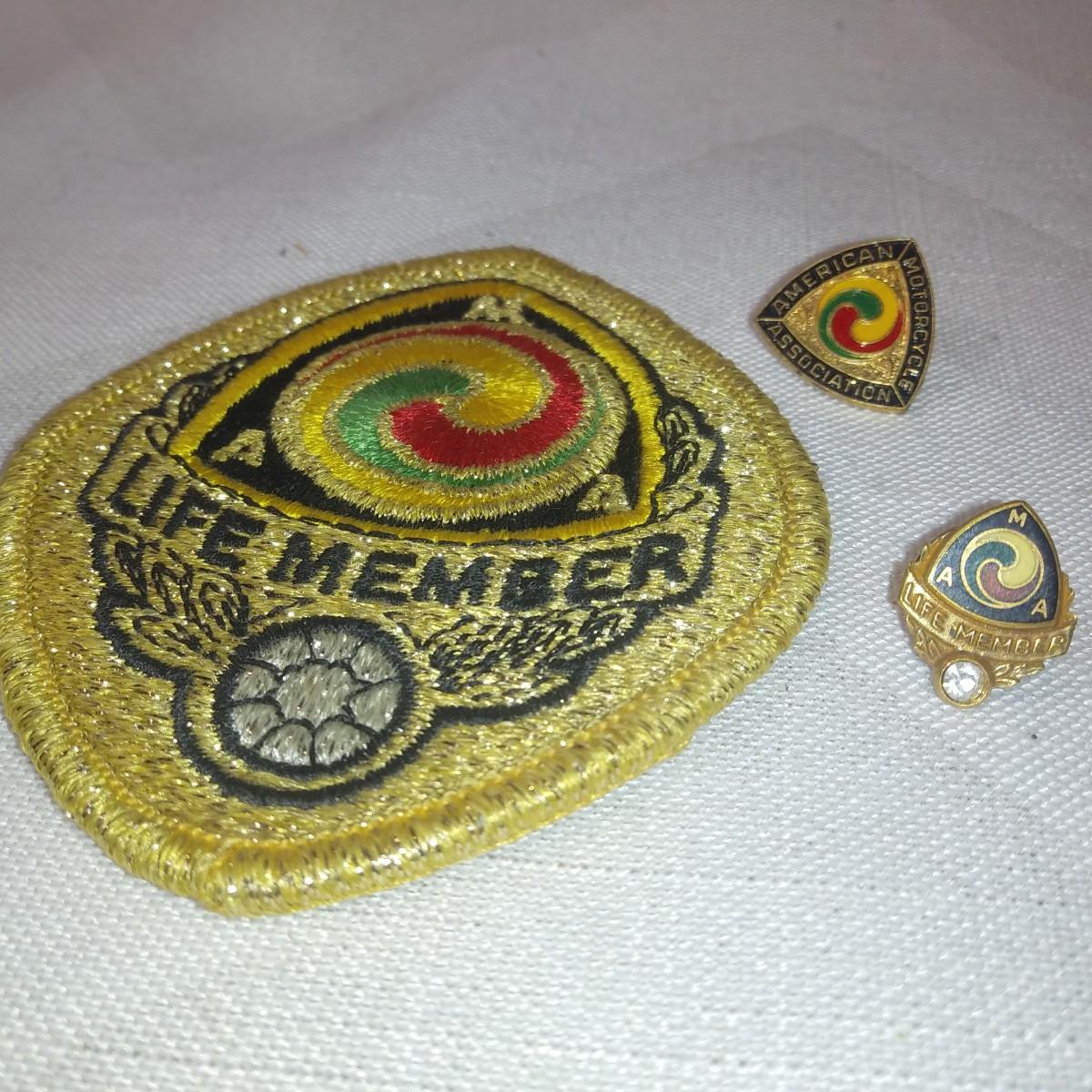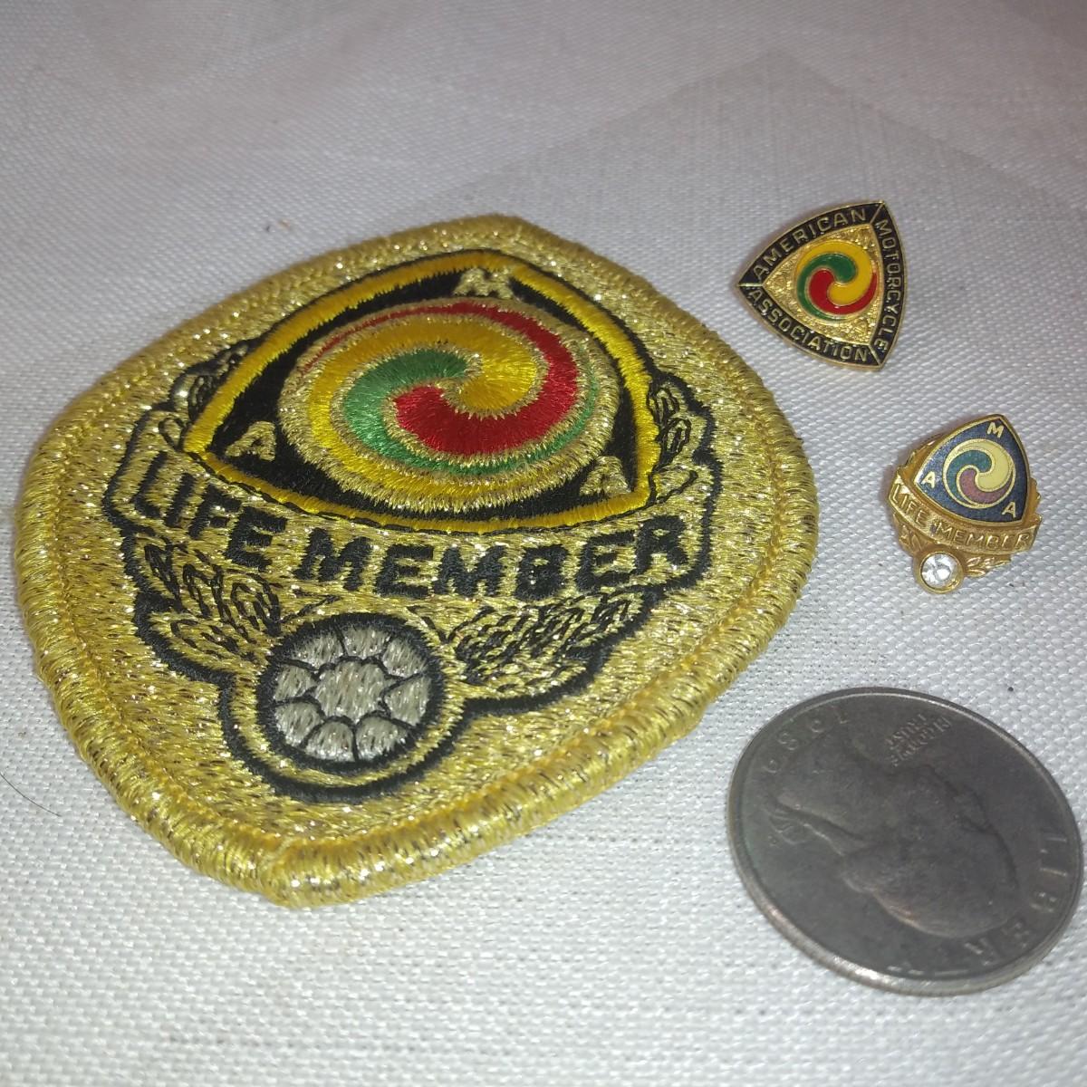 This auction lot is for AMA Life Member Patch and Pins - Lot 1. This lot contains a American Motorcycle Association Life Member Patch with Life Member Pin and AMA signature pin. All are in very good condition.