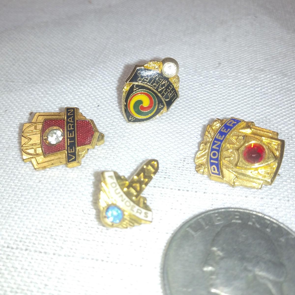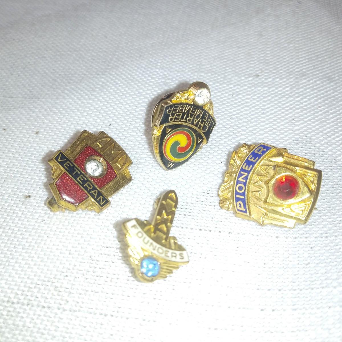 This auction lot is for AMA Vintage Pins - Lot 2. This lot contains four American Motorcycle Association vintage pins: Veteran, Founders, Pioneer and Charter Member. All are in very good condition,