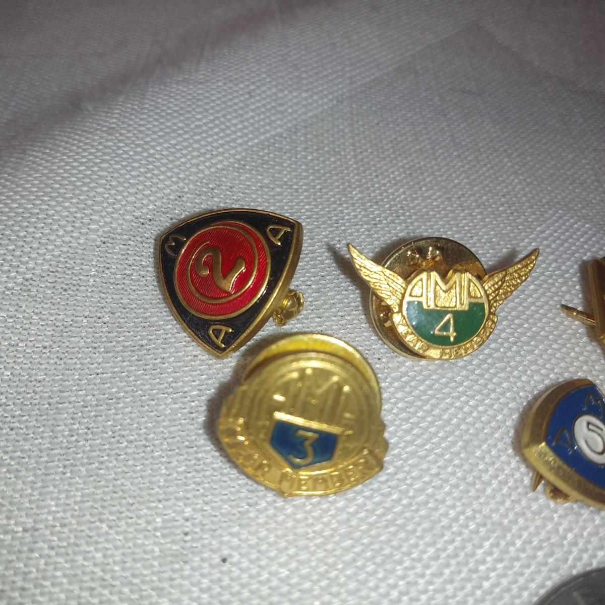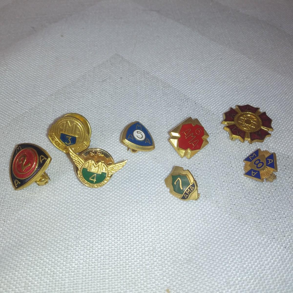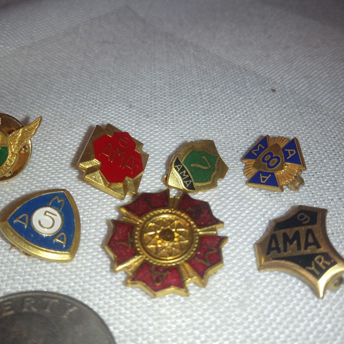 This auction lot is for AMA Vintage Pins - Lot 3. This lot contains nine American Motorcycle Association vintage pins by membership years: 2, 3, 4, 5, 6, 7, 7 and 8. Yes there are two - 7 year pins. All are in very good condition