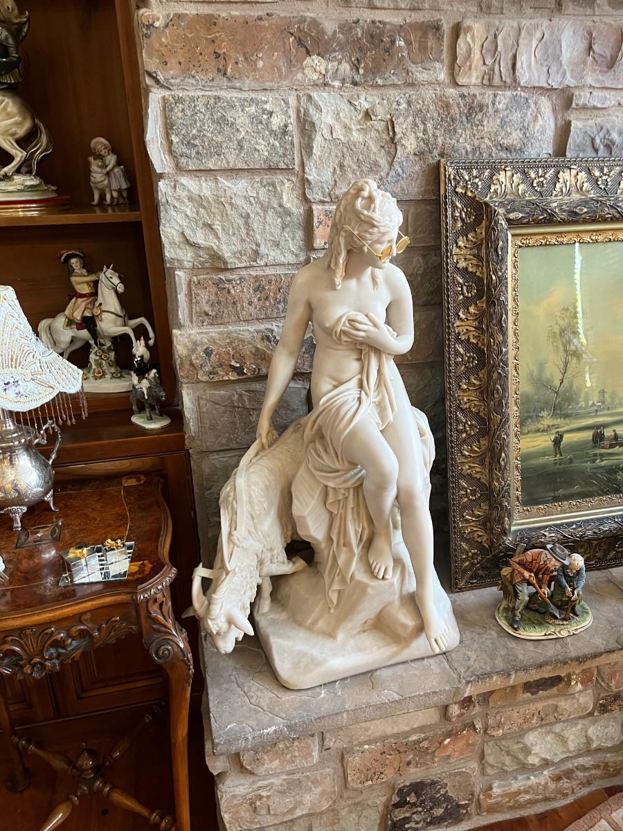A 19th century reproduction of the famous sculpture "Amalthea and Jupiter's goat" the original was sclupted by Pierre Julien and now resides in the Louvre in Paris France. This statue is in excellent condition and measures 42" tall quite heavy at close to 100 pound. There is one repair to the foot of Amalthea, see photos. We can arrange shipping of this item if desired.
