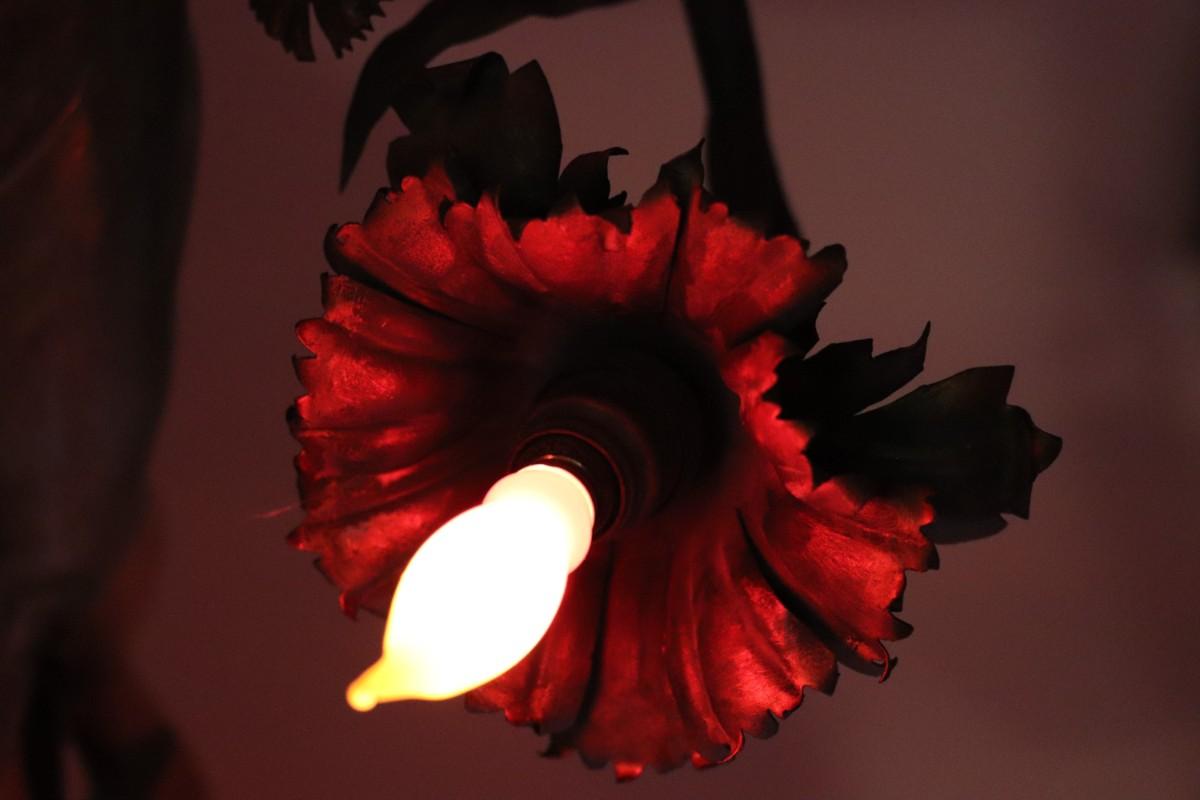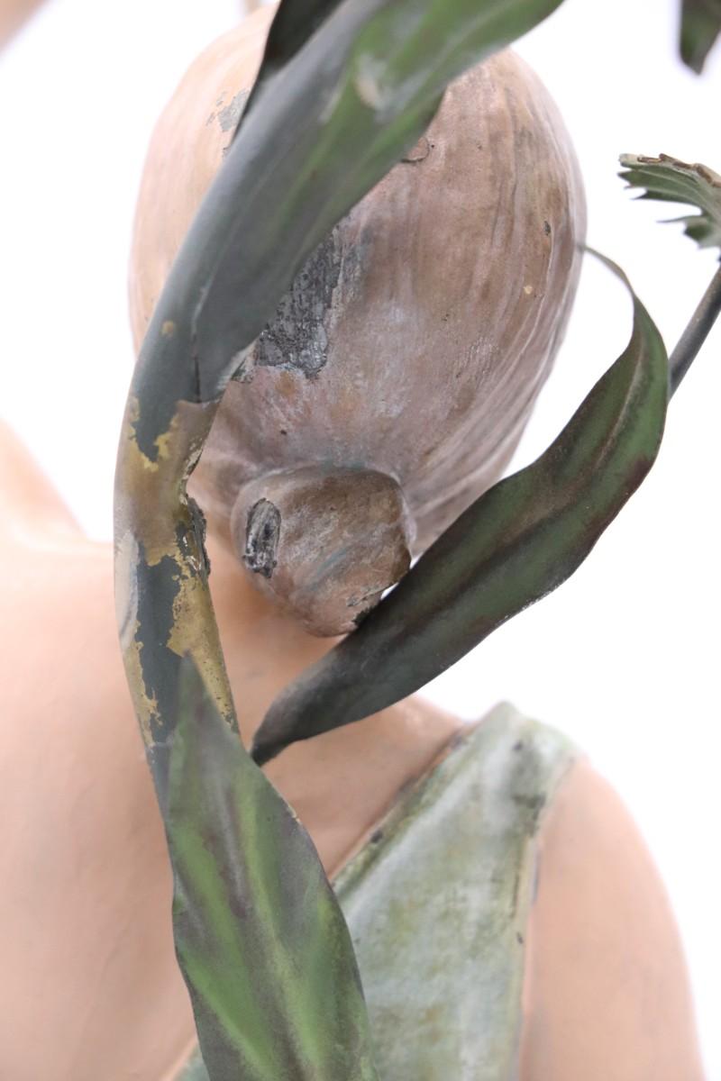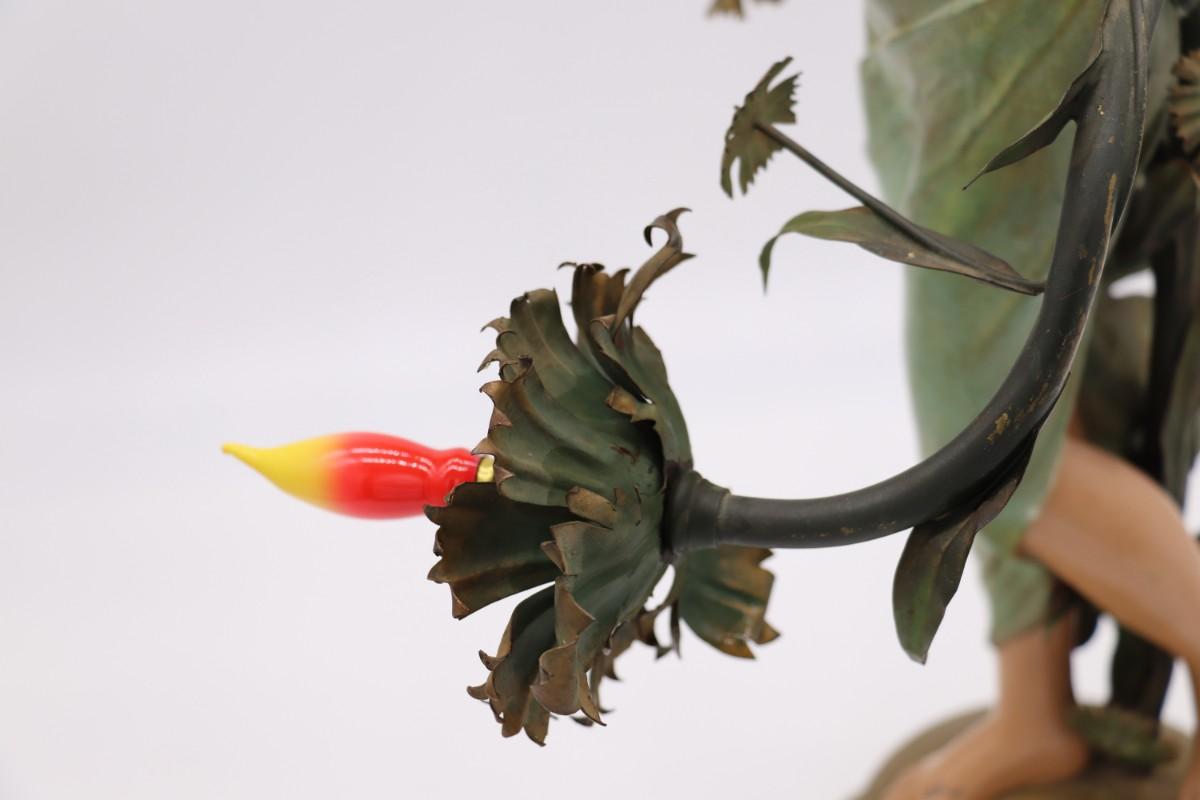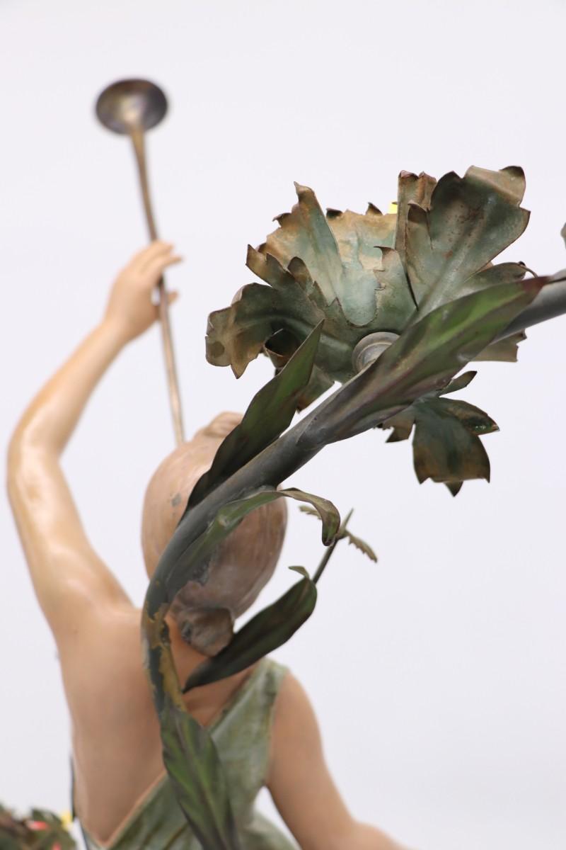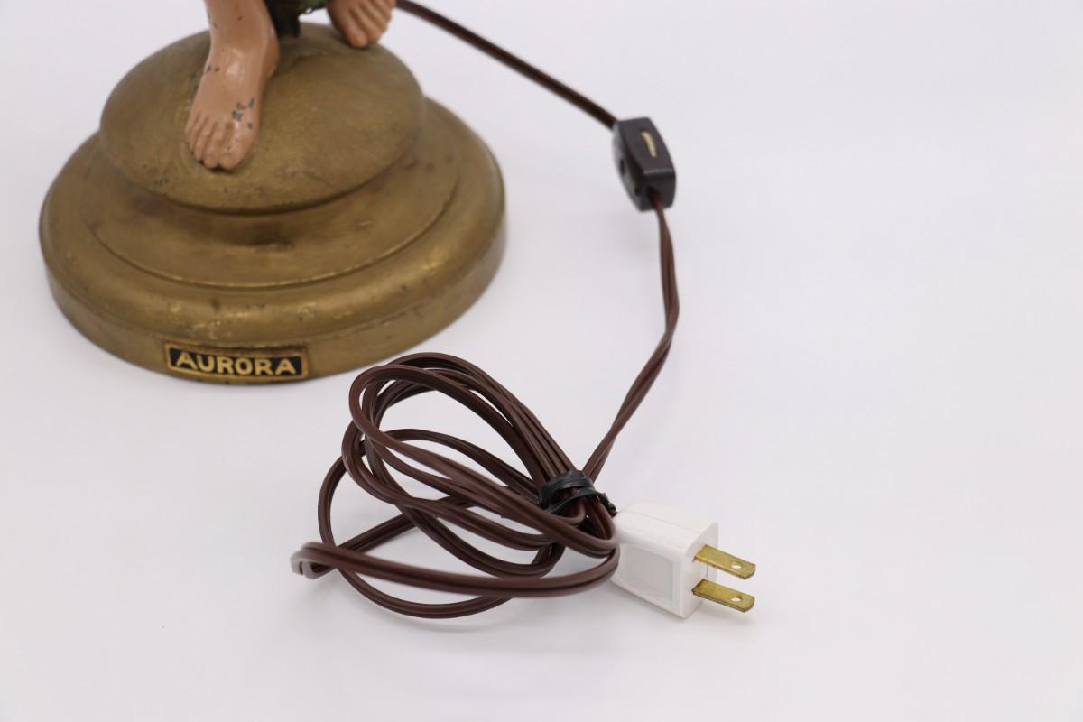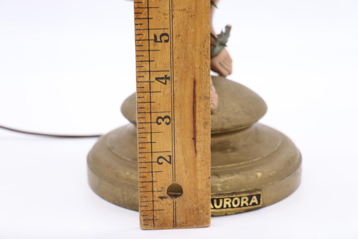 A completely unique and wonderful piece of antique lamp art. Circa 1890s. Wonderful sculpture of the Roman goddess of dawn, Aurora. She is sounding her horn, announcing the start of the day. Painted bronze sculpture, which has been made into a gorgeous floral lamp (in great working condition). One of a kind piece. From the estate of an antique store owner and lamp enthusiast. Condition as shown.