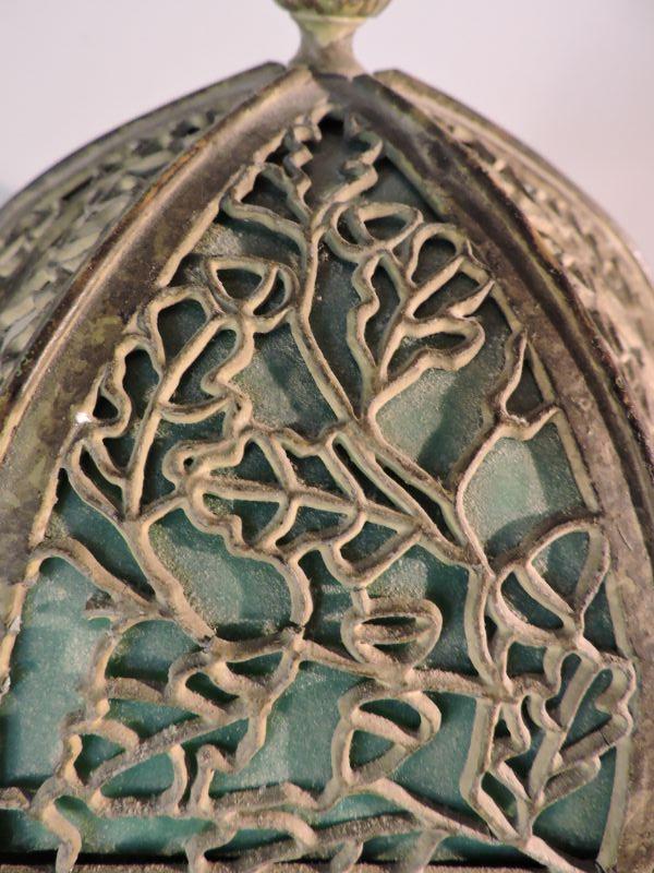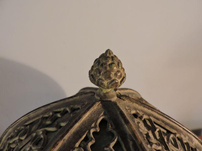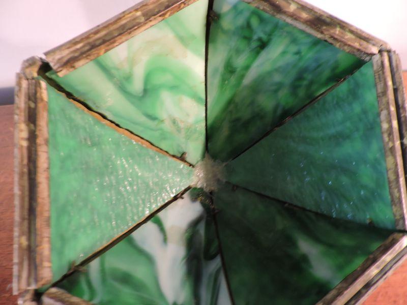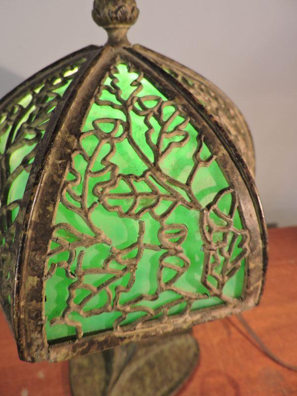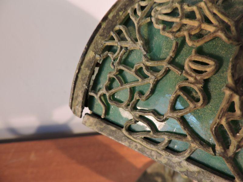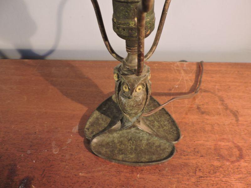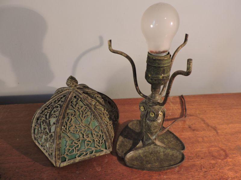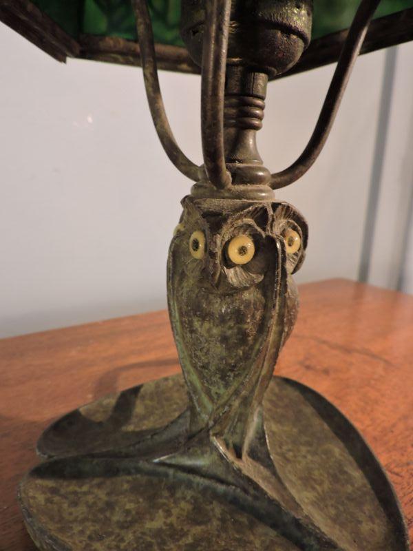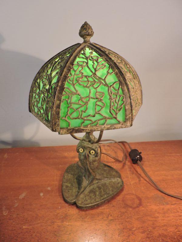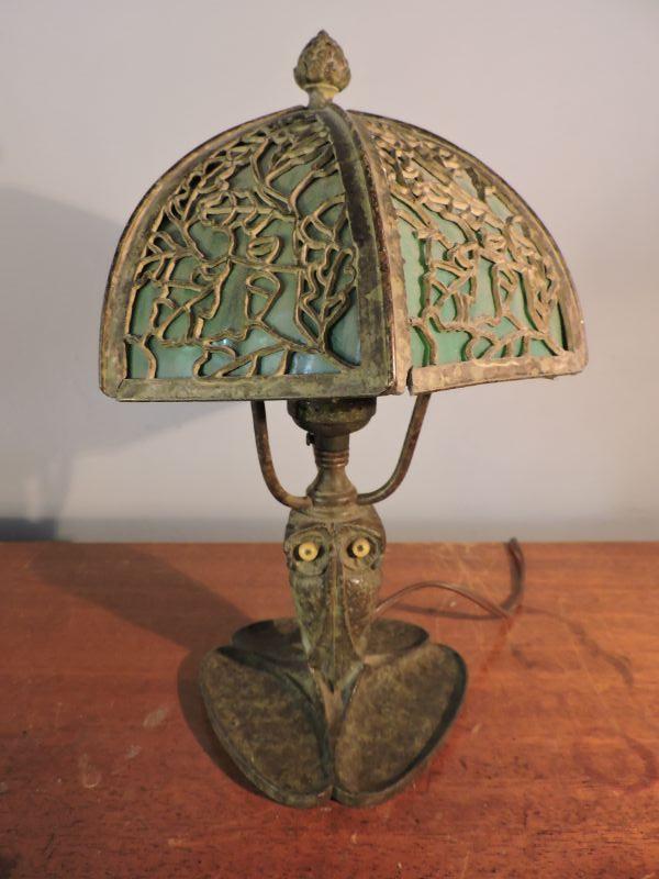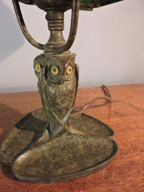 This is an amazing piece of glass and metal work! Brass, with a slag glass shade with an intricate design on it. Some of the welding on the shade has loosened over time. this lamp could use a professional cleaning and repair. The base has three continuous owls. Base is stamped with B&H. Dates probably from 1905-1925. Stands about 11". Just stunning! **Please read Terms and Conditions before placing a bid. Pick up is Sunday, November 24 from 9am to 3pm or Tuesday, November 26 from 4pm-7pm in Mantua, NJ. All sales are final. All sales are as is, where is. Please review all photos. Any props included in photos are not included in listing. All measurements are approximate.