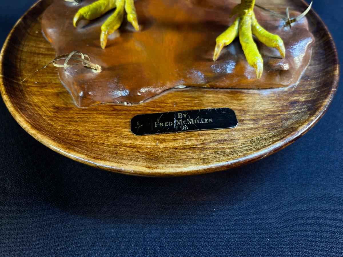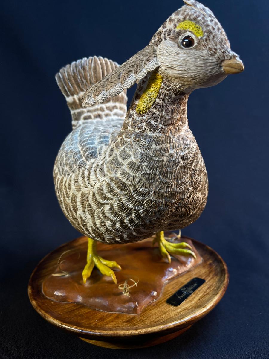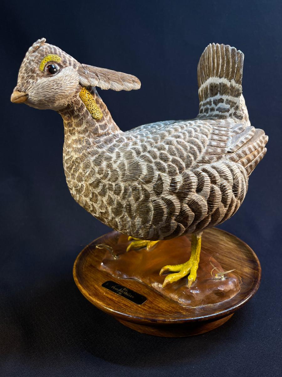 The subject item is a finely detailed, life-size greater-prairie chicken, carved by Fred McMillen in 1996. The artist has made an almost obsessive attempt to carve and paint the minute details of every feather, making this piece an exceptional work of American folk art at its best! The bird has been mounted to a turned wooden, dish, style base, making the figure a stable display item. Two repairs have been photographed.