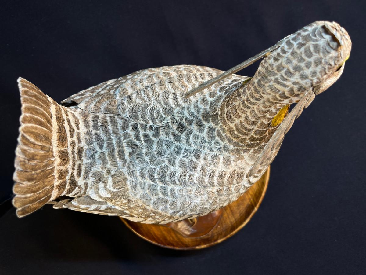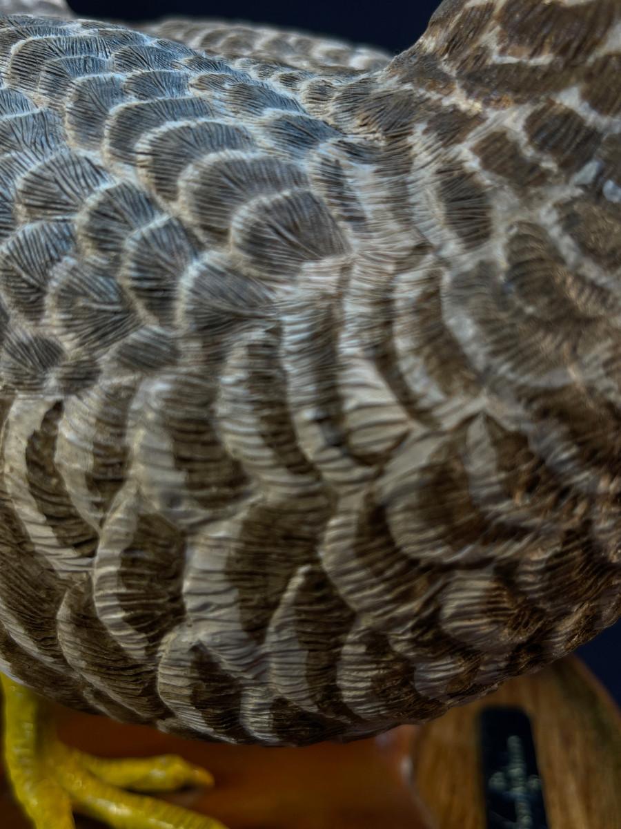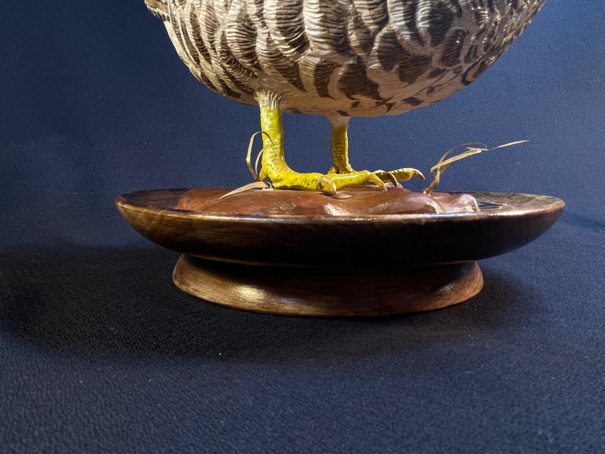 The subject item is a finely detailed, life-size greater-prairie chicken, carved by Fred McMillen in 1996. The artist has made an almost obsessive attempt to carve and paint the minute details of every feather, making this piece an exceptional work of American folk art at its best! The bird has been mounted to a turned wooden, dish, style base, making the figure a stable display item. Two repairs have been photographed.