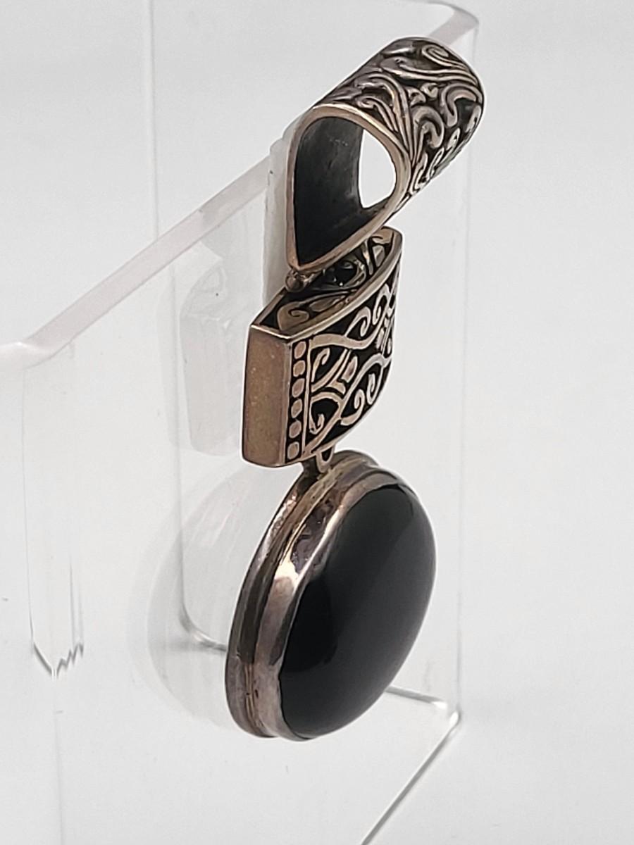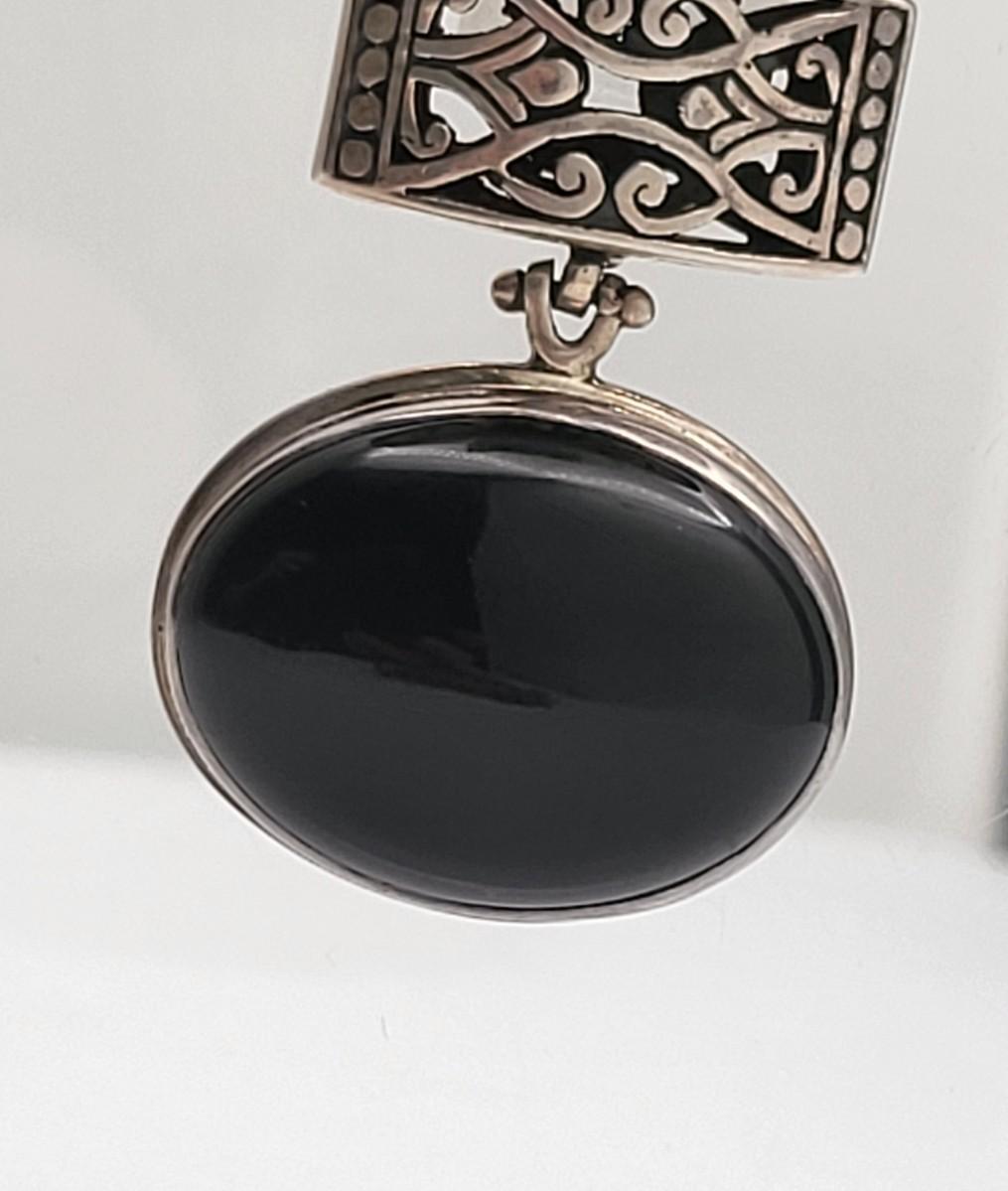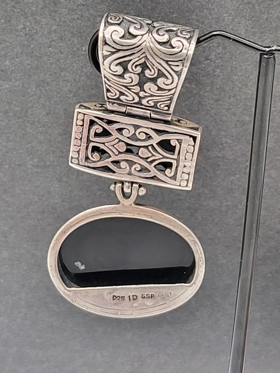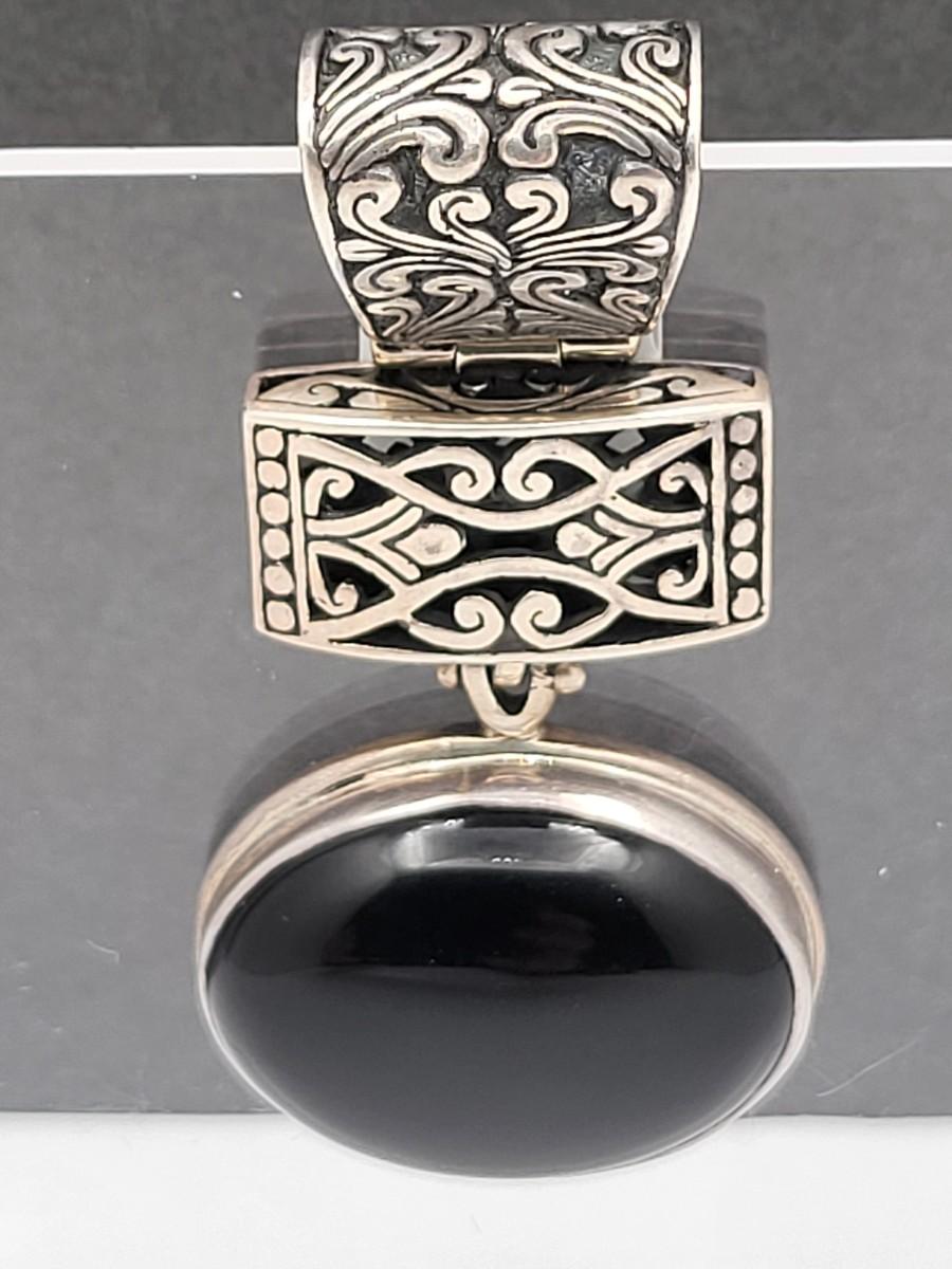 Large oval black onyx and intricate sterling silver pendant signed 925 ID SSP. Measures 2.5" long x 1.25" at it's widest. Large bale for adding any style of chain. Total weight 27.9 grams.