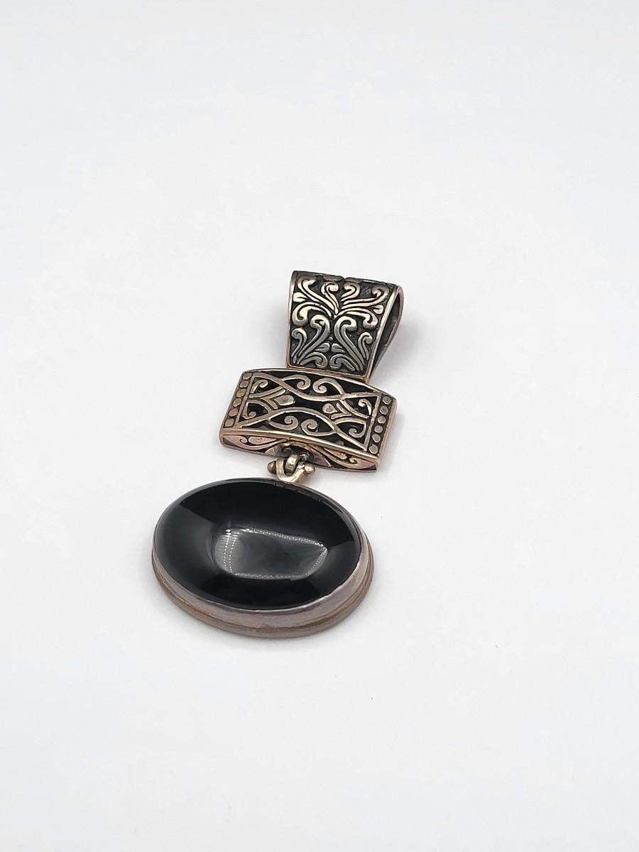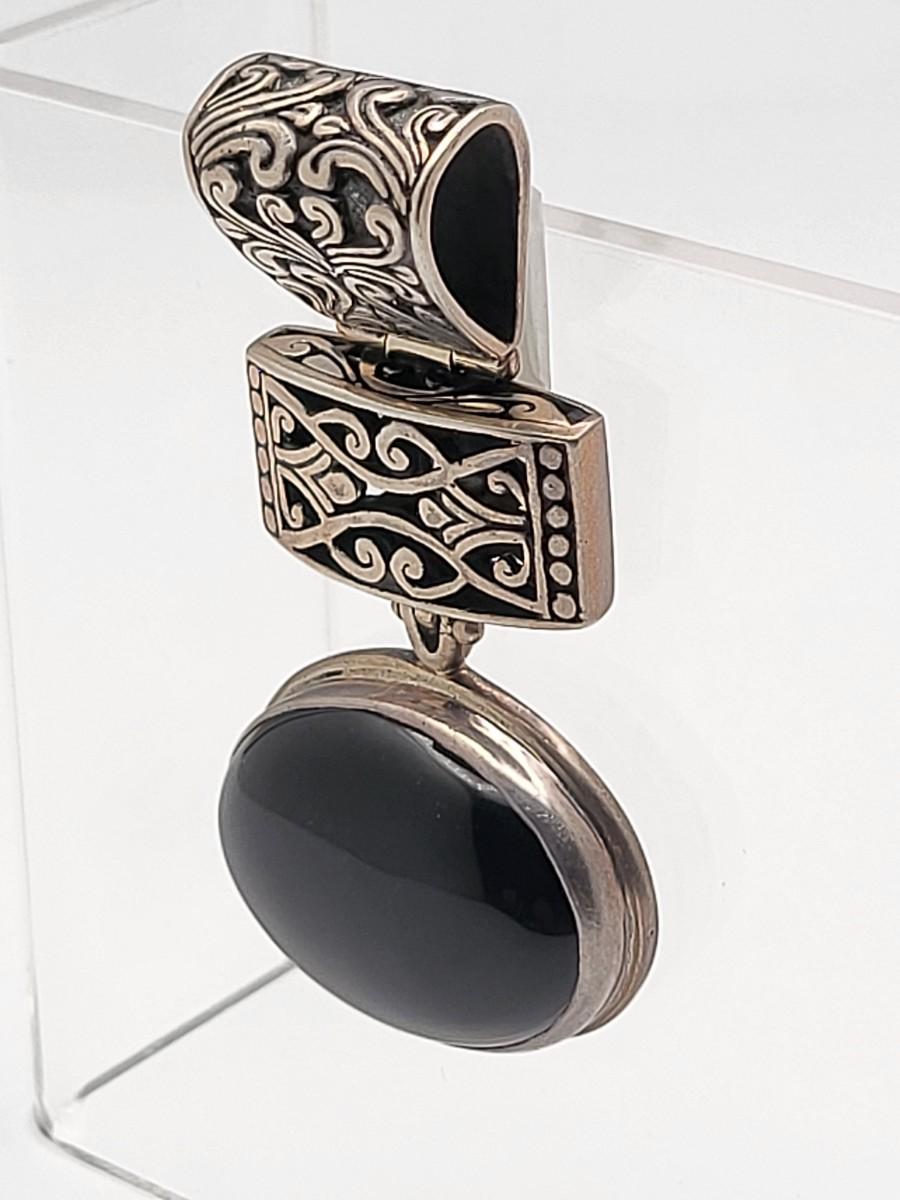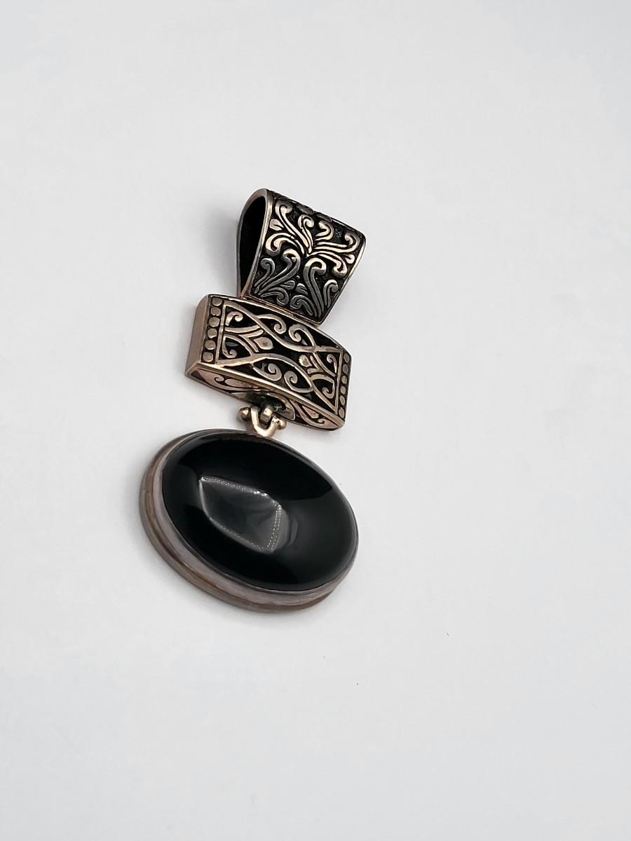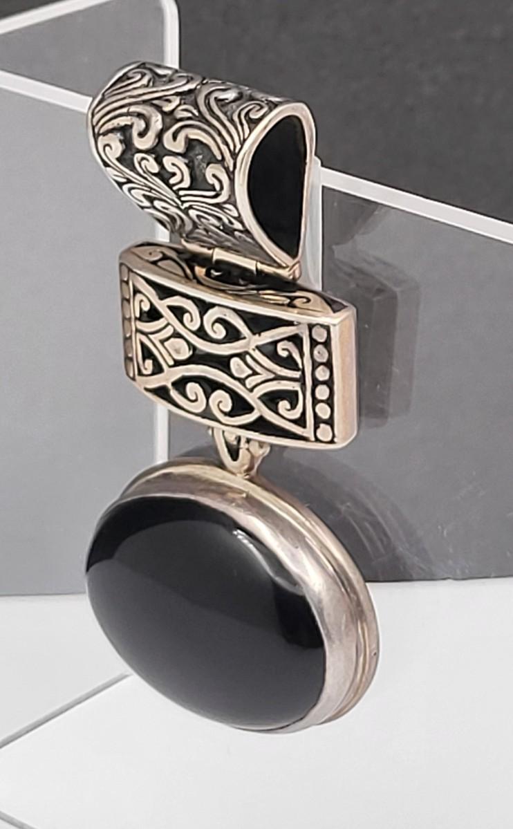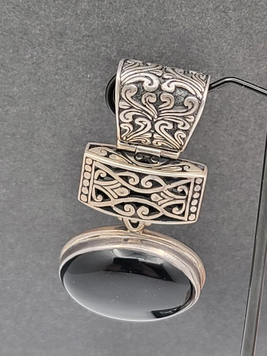 Large oval black onyx and intricate sterling silver pendant signed 925 ID SSP. Measures 2.5" long x 1.25" at it's widest. Large bale for adding any style of chain. Total weight 27.9 grams.