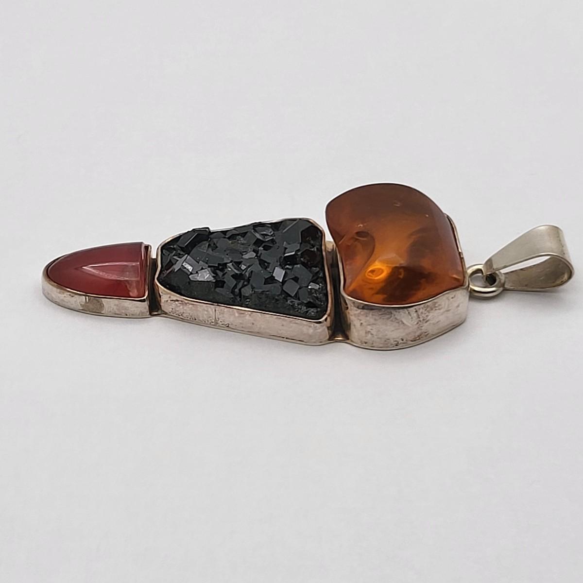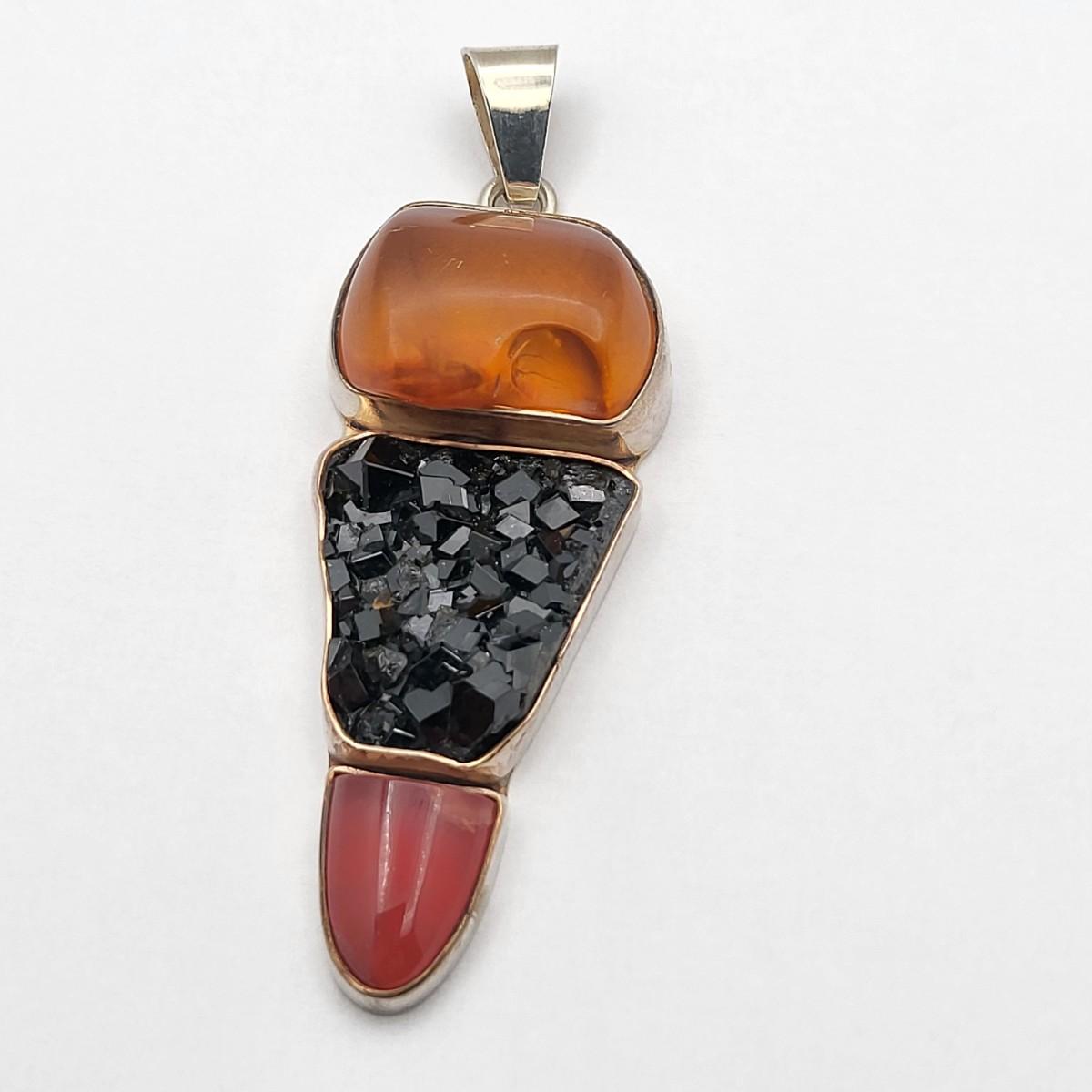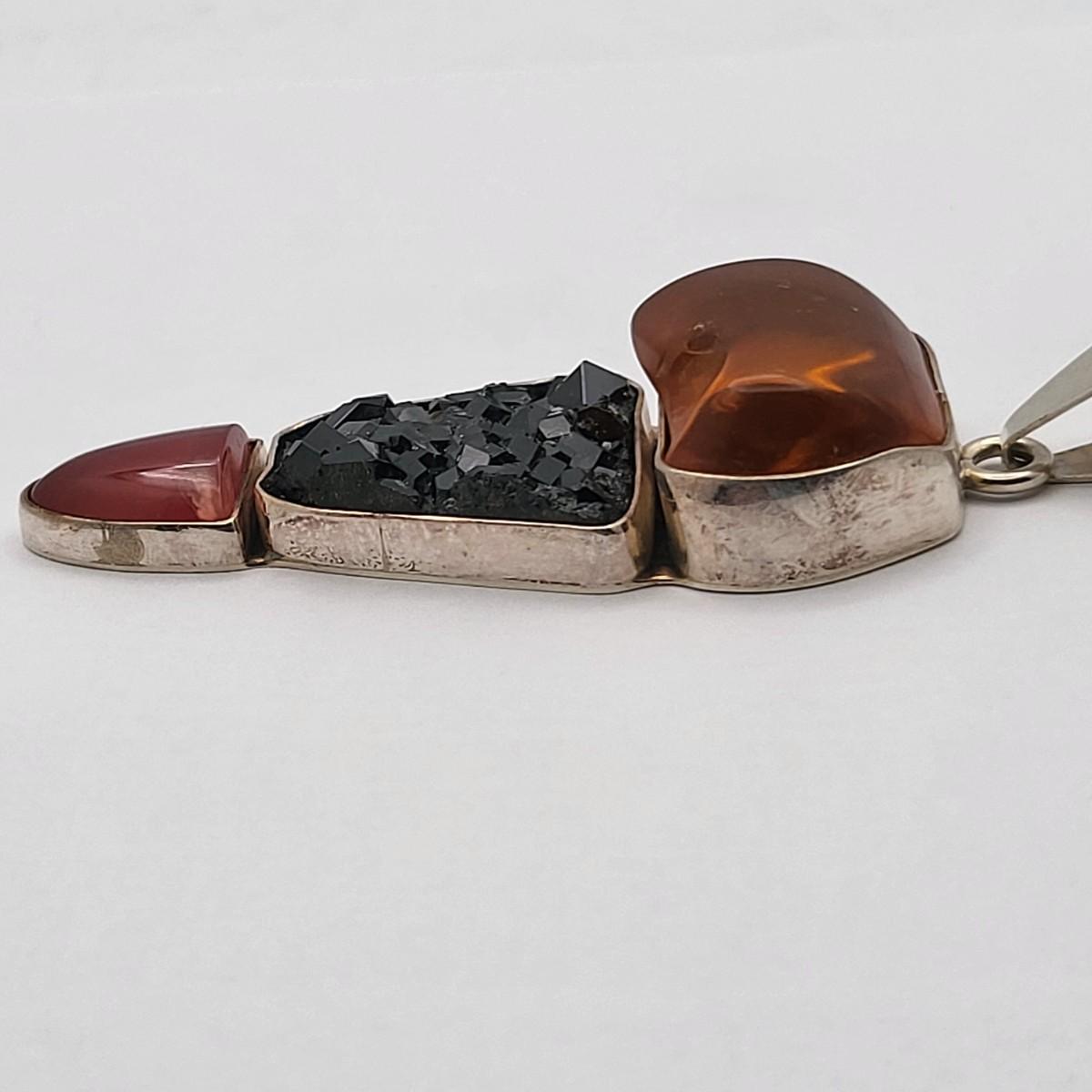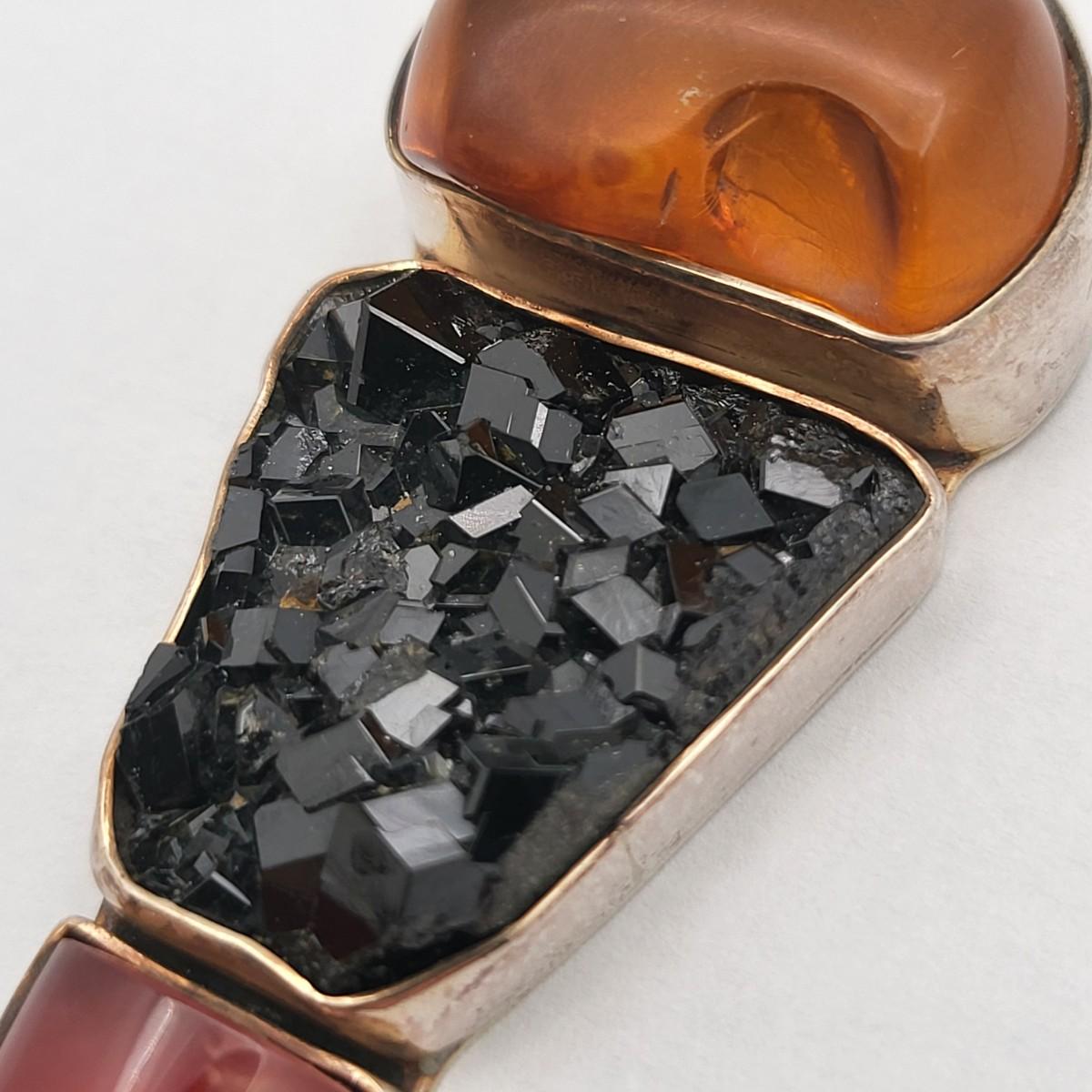 Amber, Black Druzy & Dark Pink Quartz 3.25" long x 1" wide. Nice large bale, ready for your chain. Set in 925 silver. Total weight 32.5 grams.
