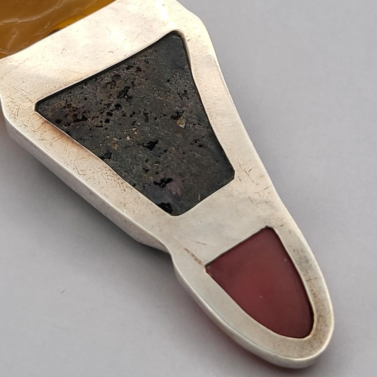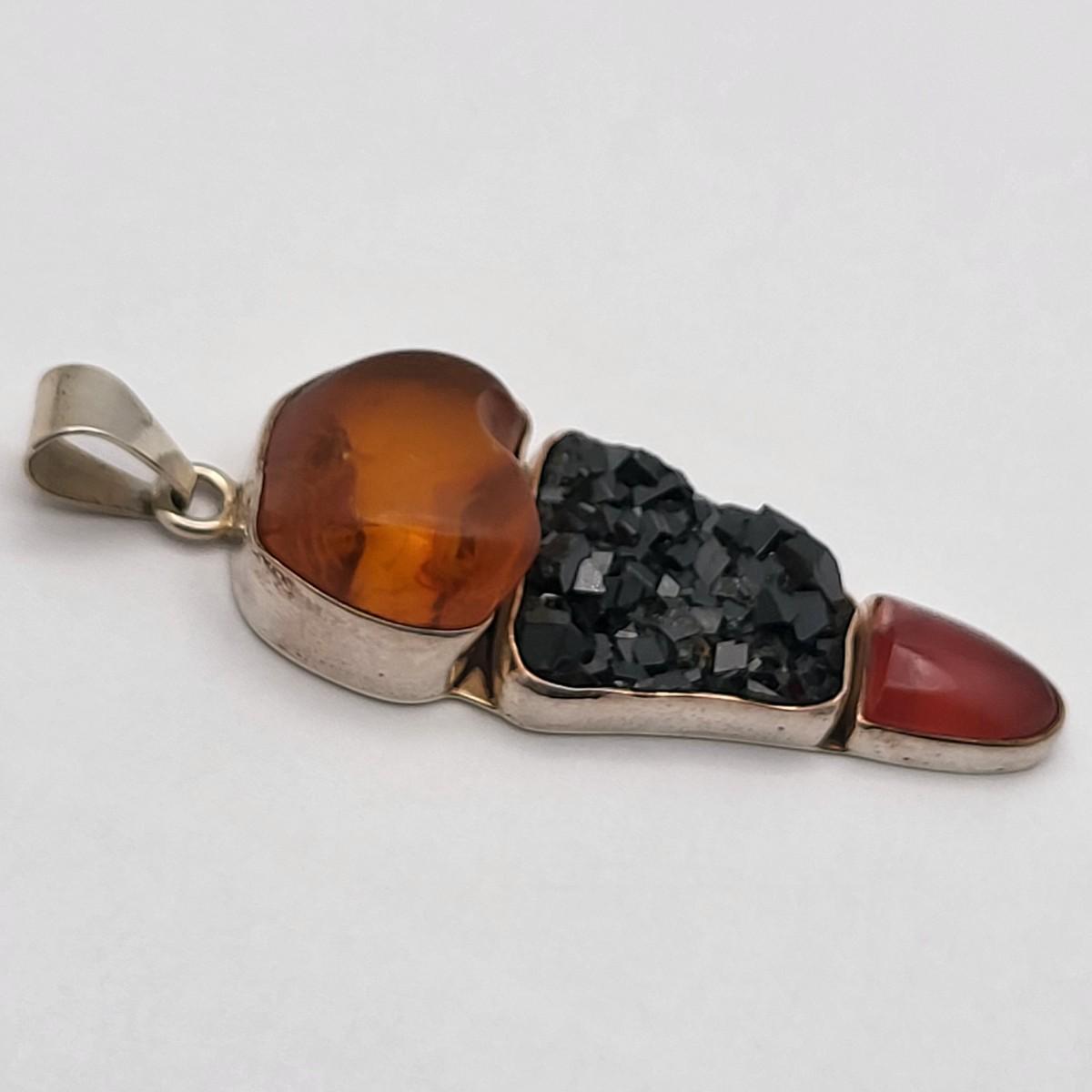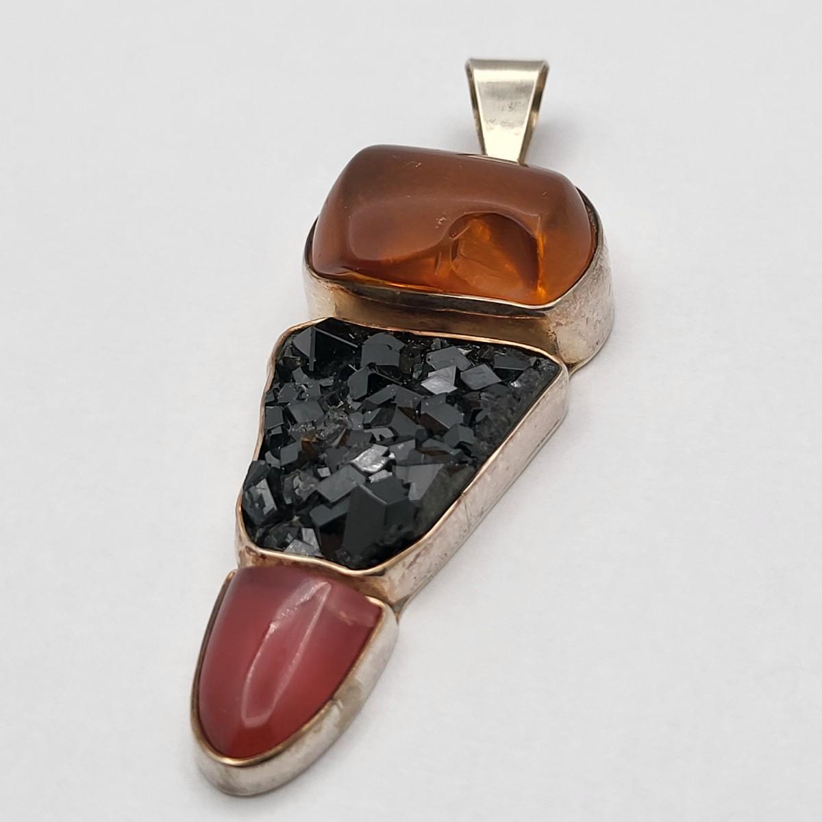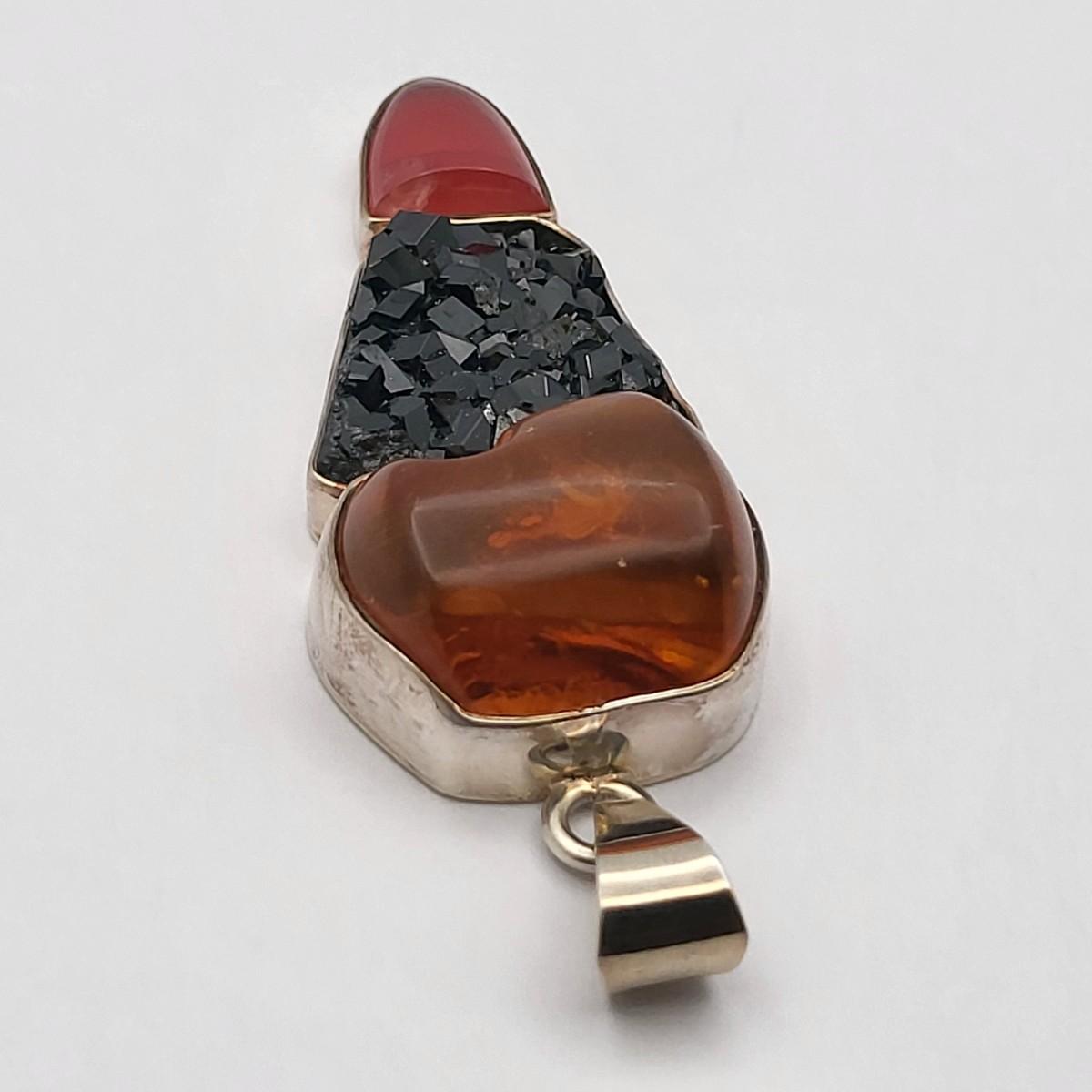 Amber, Black Druzy & Dark Pink Quartz 3.25" long x 1" wide. Nice large bale, ready for your chain. Set in 925 silver. Total weight 32.5 grams.