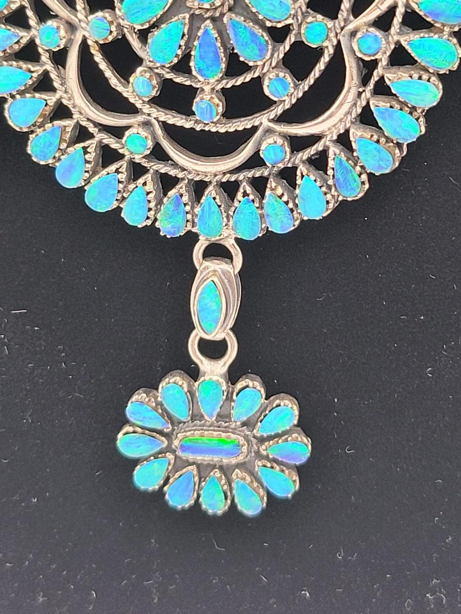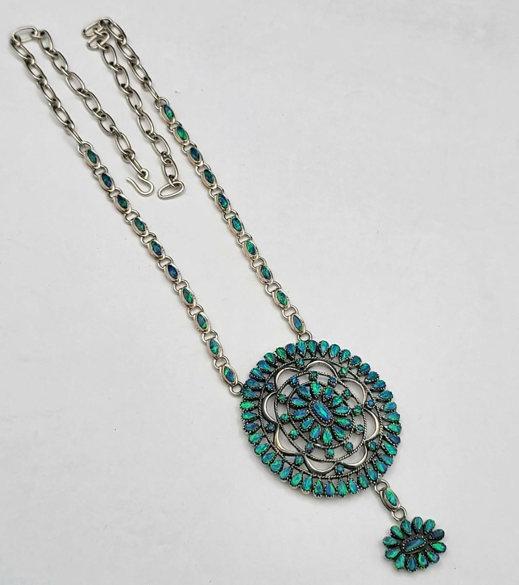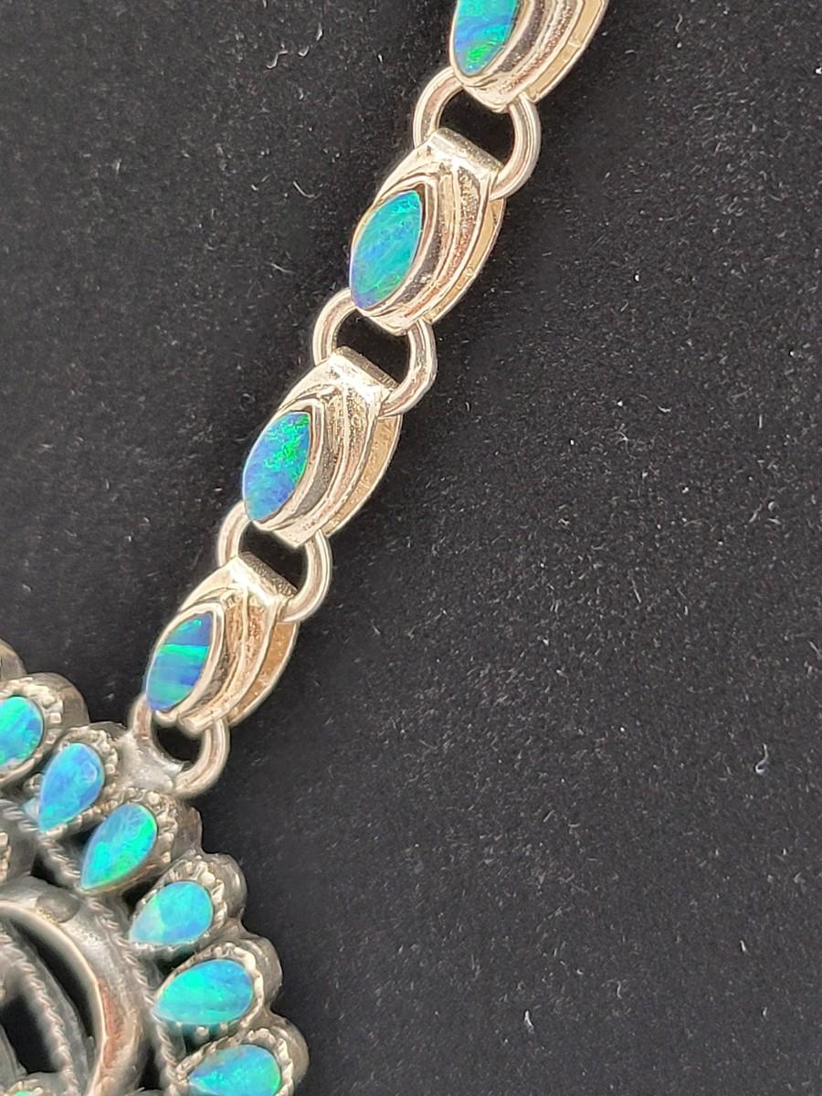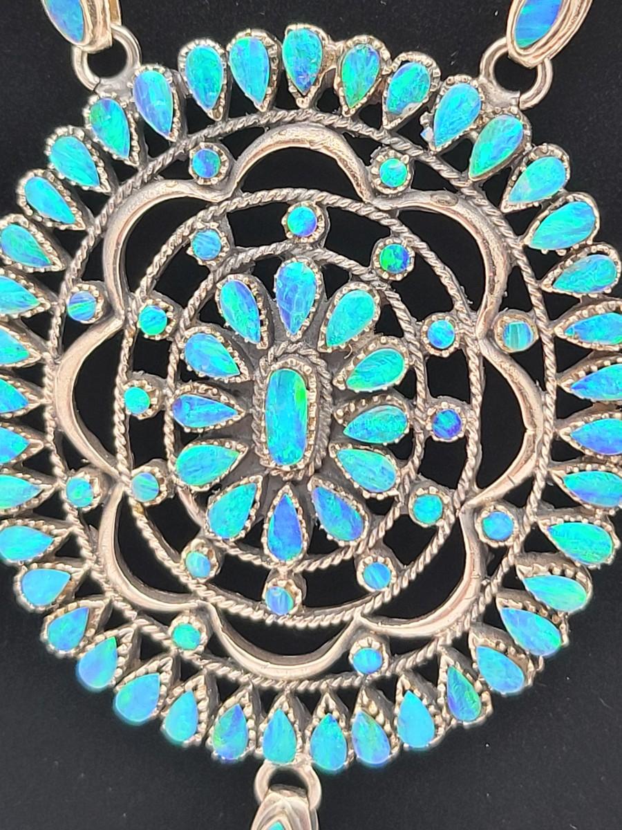 This is definitely an eye-catching piece of jewelry! The opal inlay chain measures 19" long and the large opal inlay cluster pendant is an additional 3.5" long. Stamped 925. Total weight is 55.4 grams