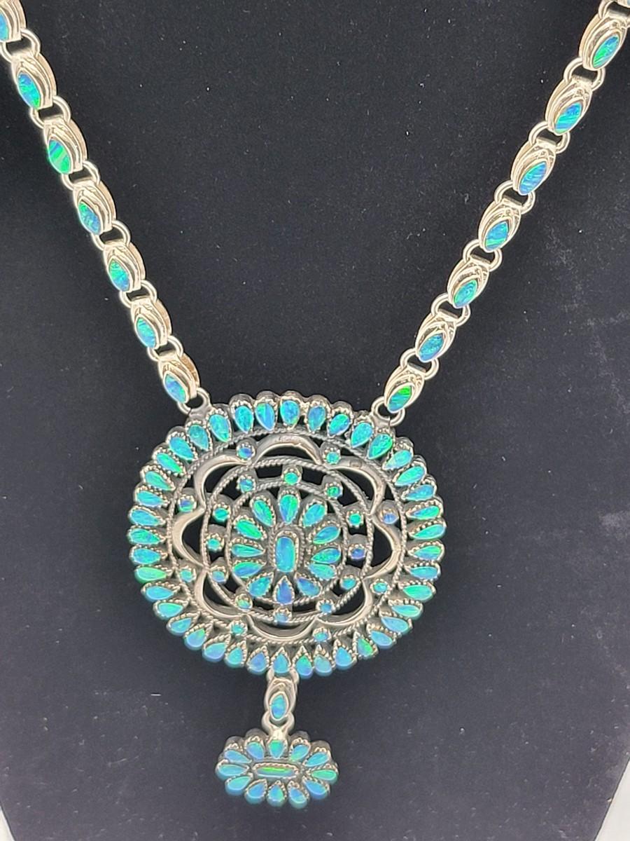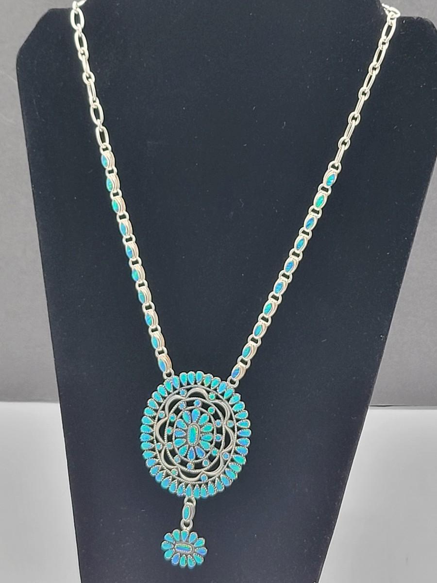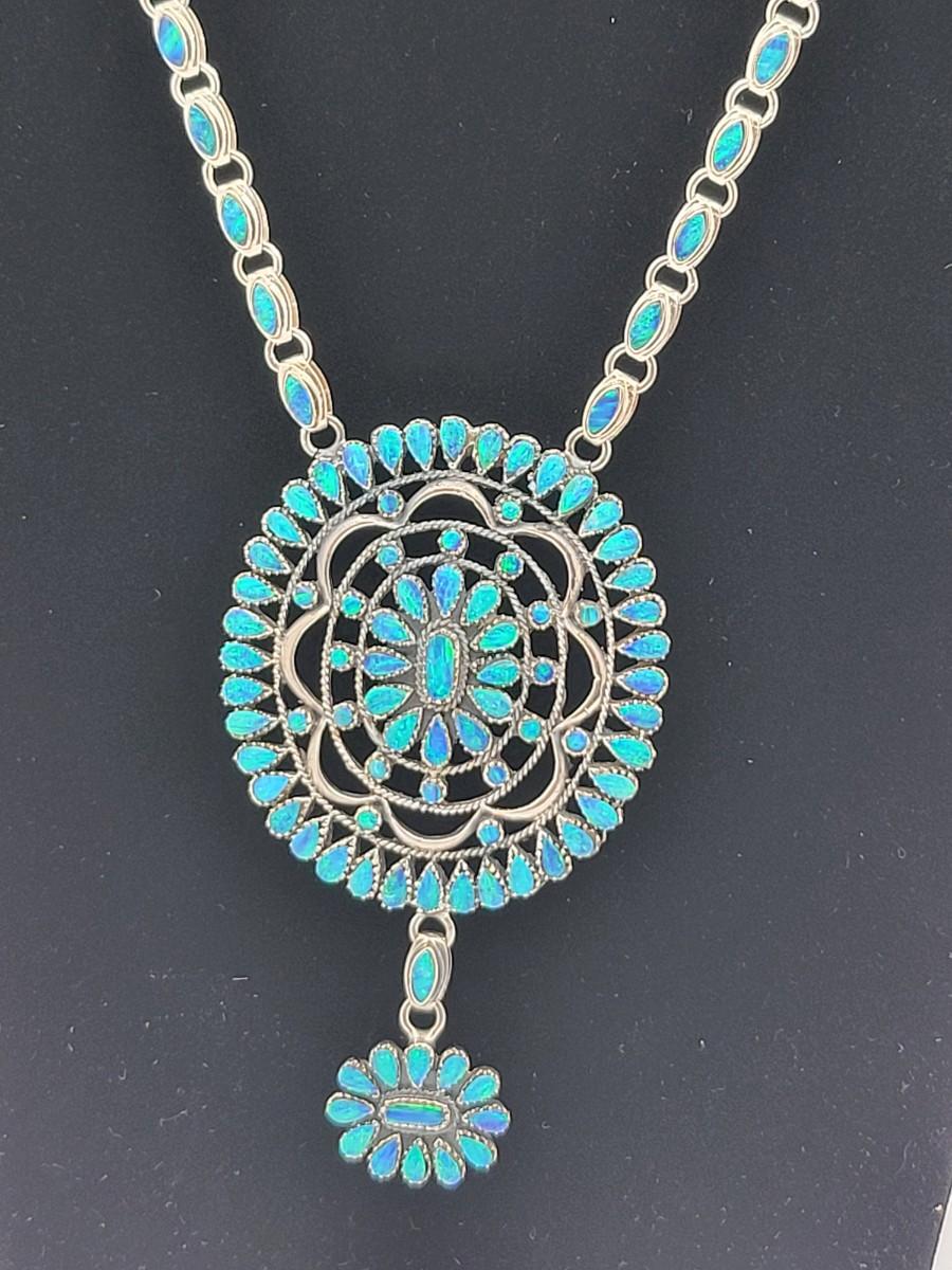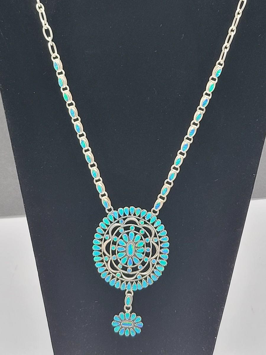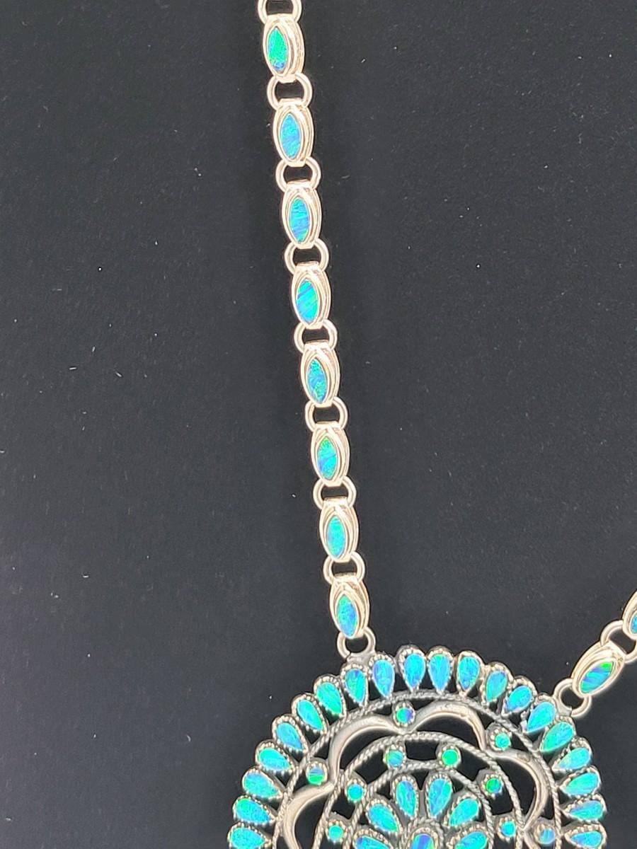 This is definitely an eye-catching piece of jewelry! The opal inlay chain measures 19" long and the large opal inlay cluster pendant is an additional 3.5" long. Stamped 925. Total weight is 55.4 grams