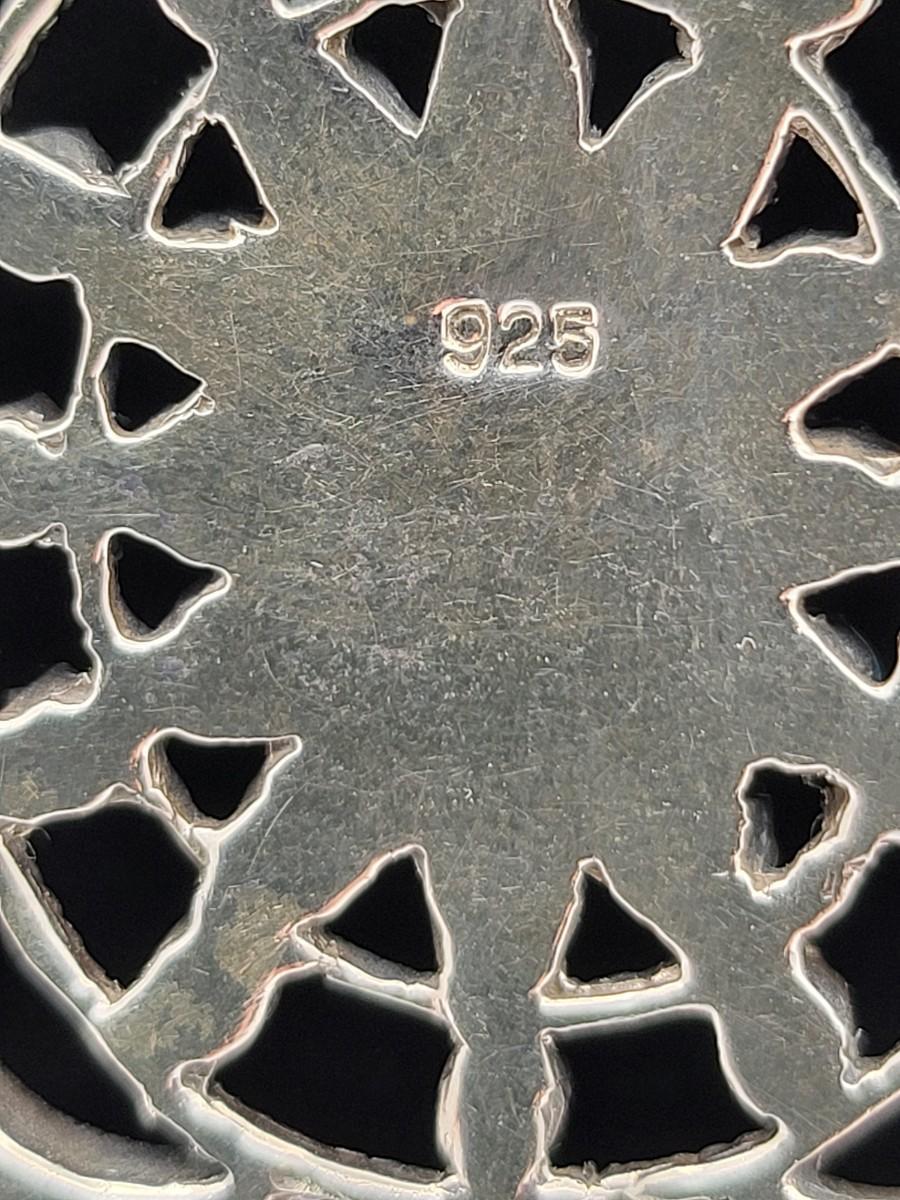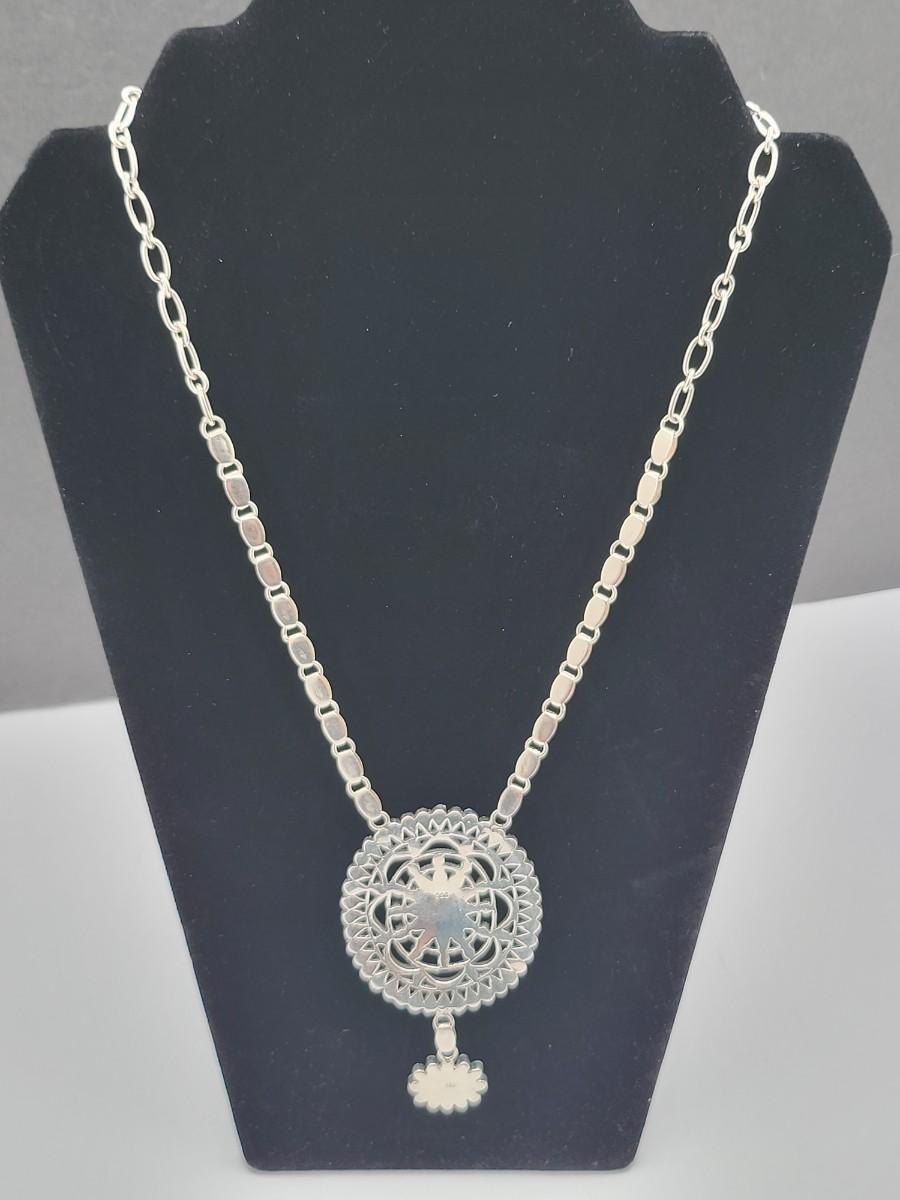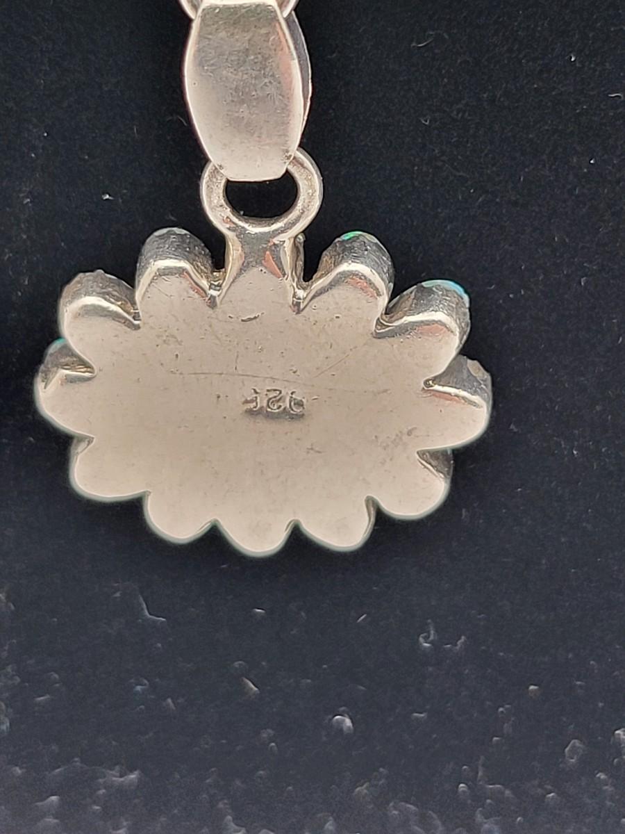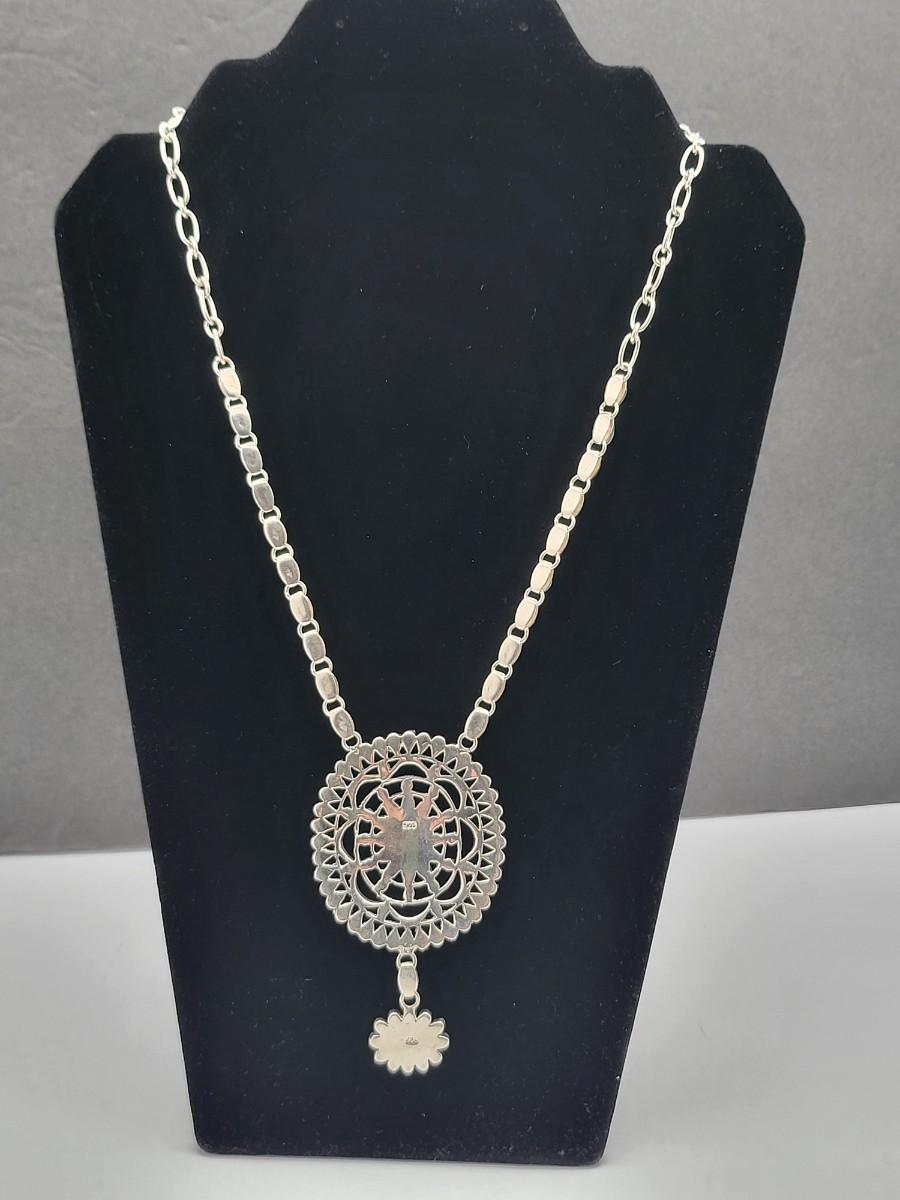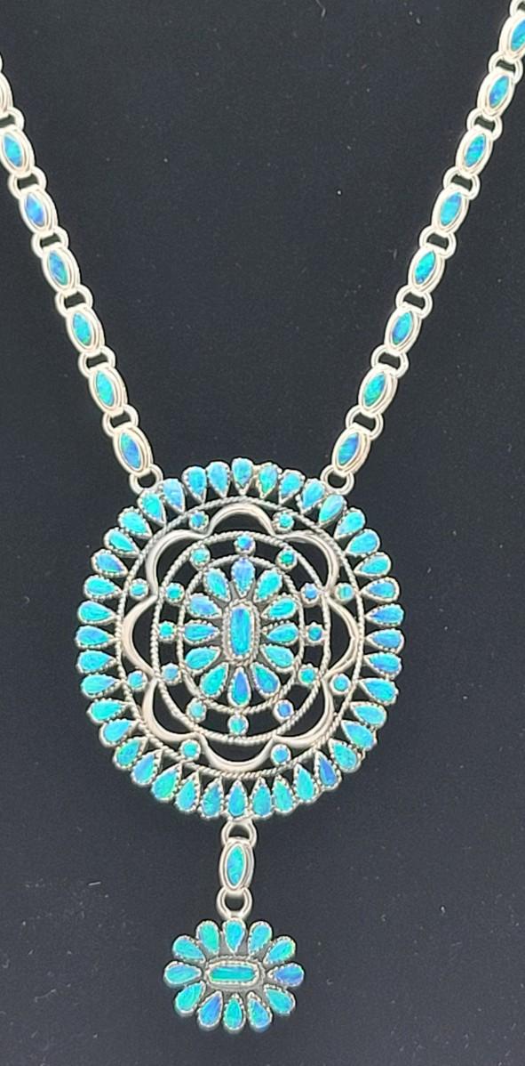 This is definitely an eye-catching piece of jewelry! The opal inlay chain measures 19" long and the large opal inlay cluster pendant is an additional 3.5" long. Stamped 925. Total weight is 55.4 grams