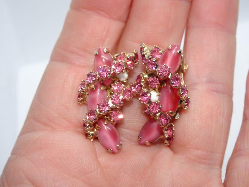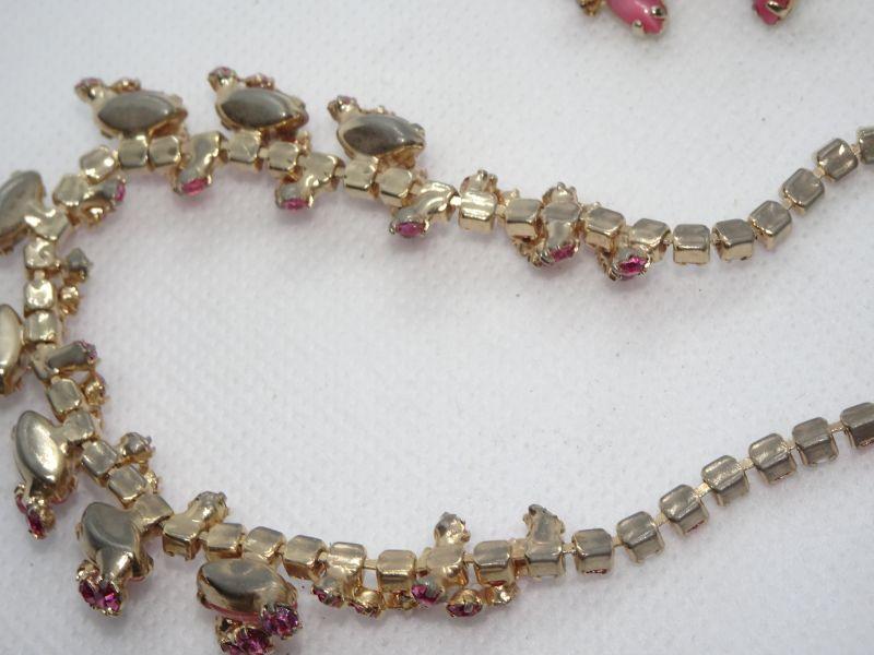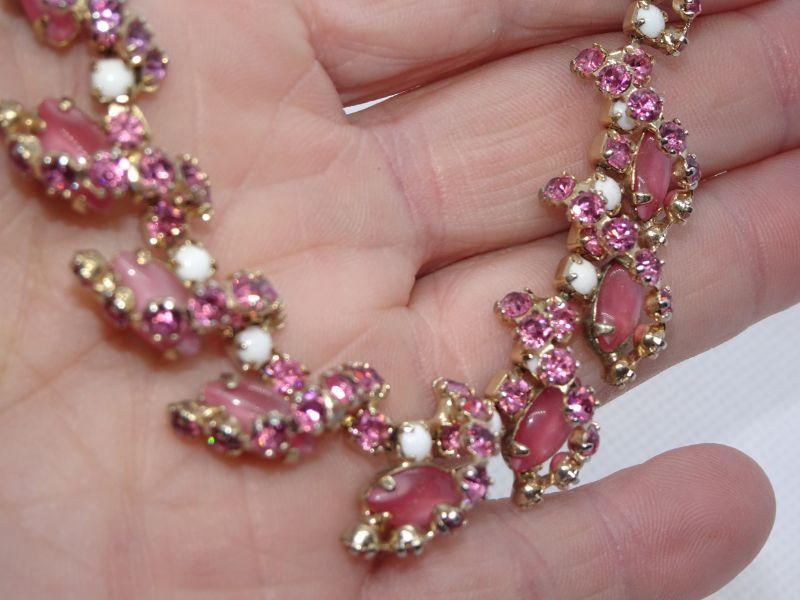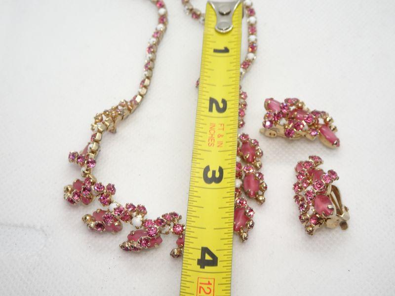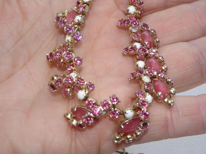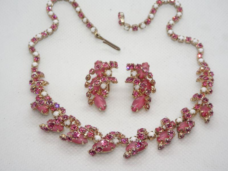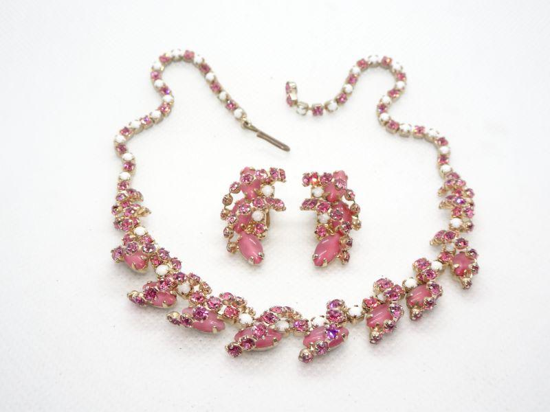 Amazing Pink & White Rhinestone & Milk Glass Beaded Necklace & Matching Clip Earrings -MCM