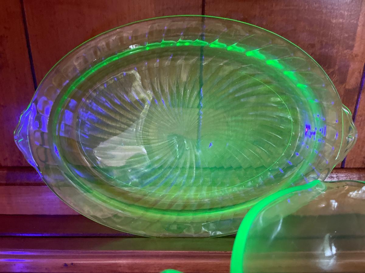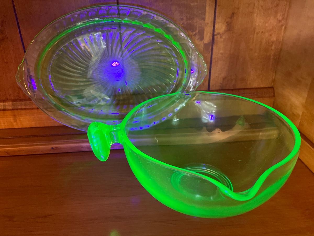 Amazing uranium glass batter bowl and platter