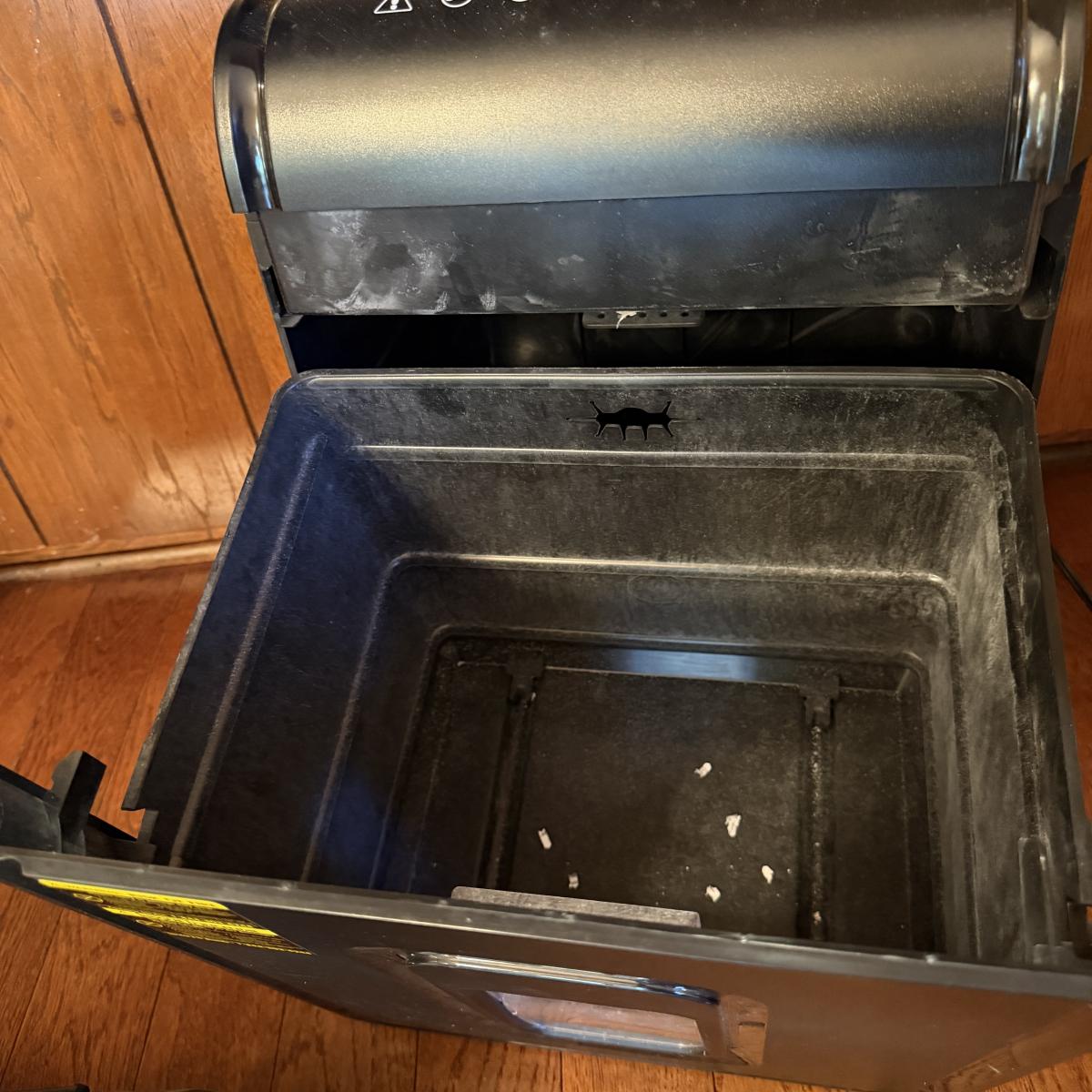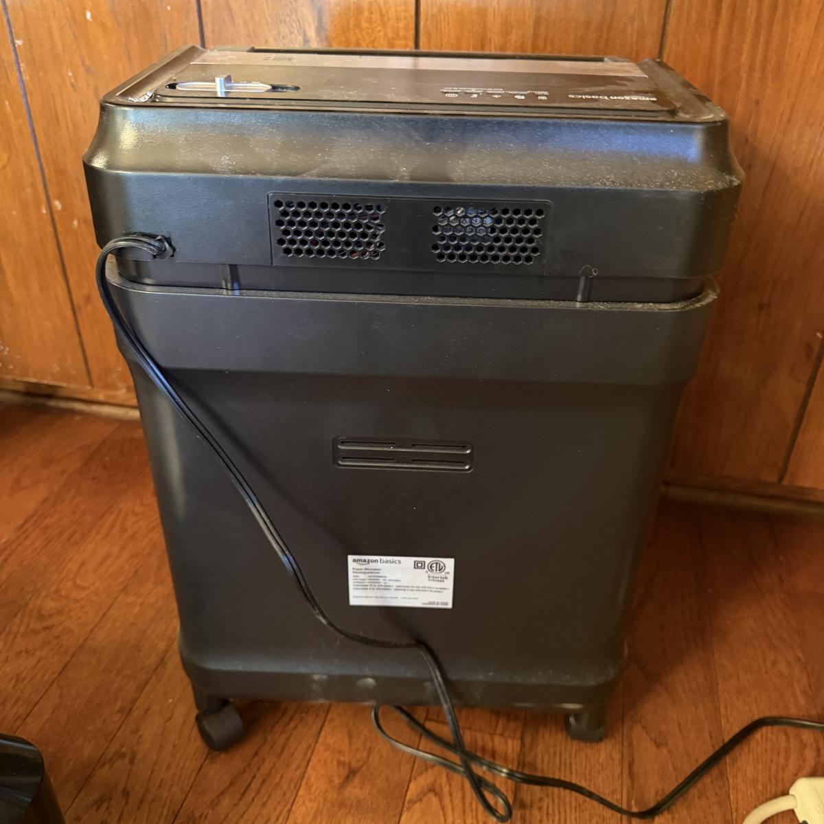 This Amazon Basics paper shredder powered on when plugged in. Paper shredder measures 23” x 10” x 20”H.