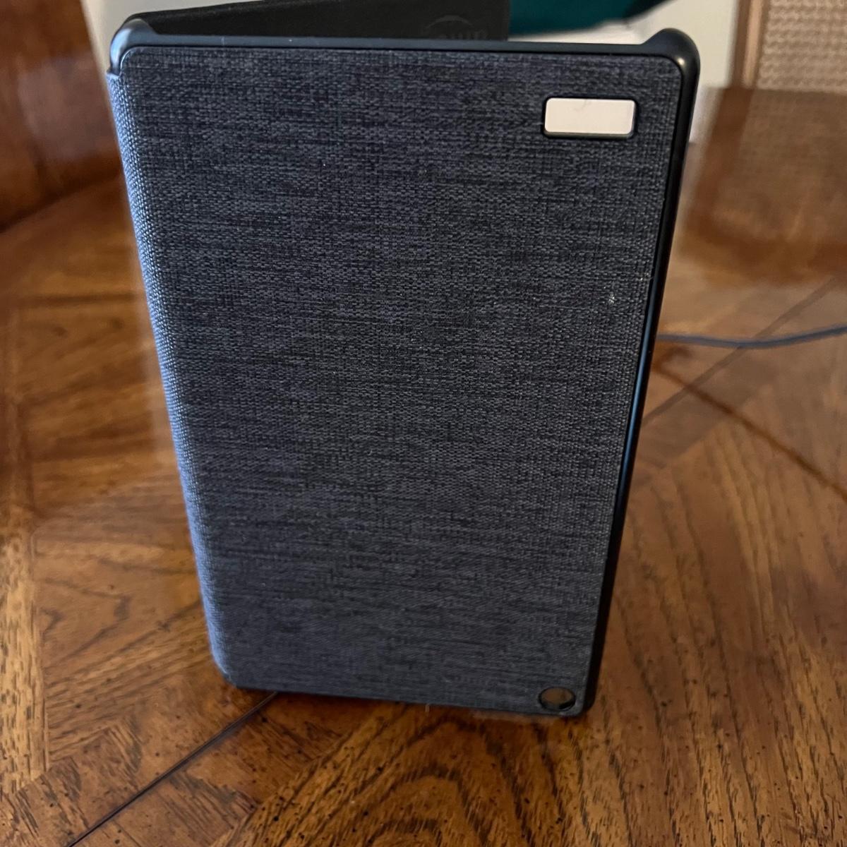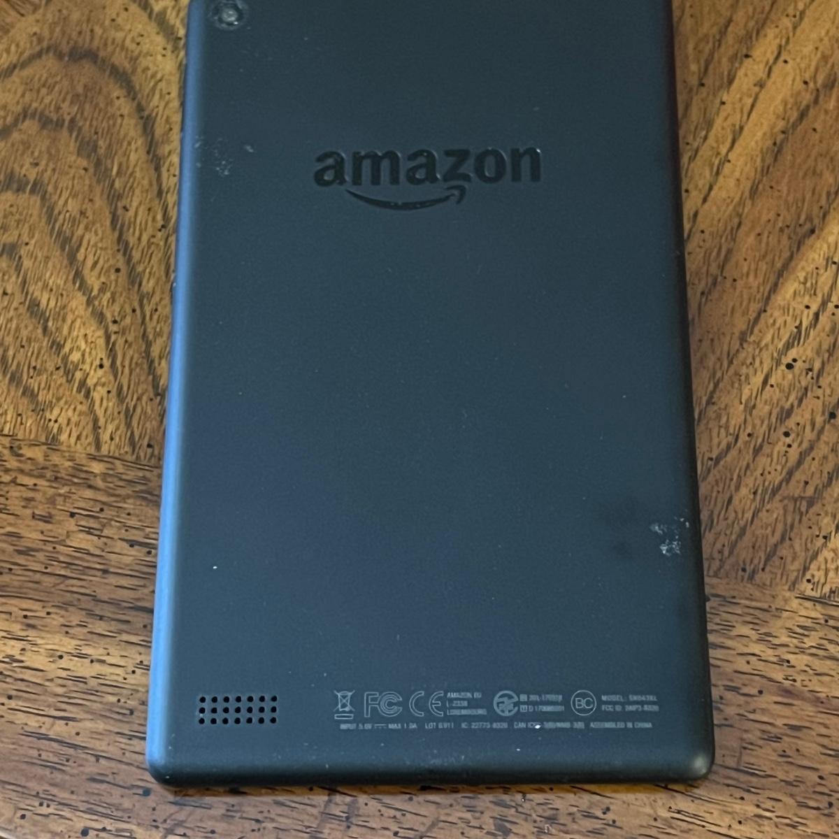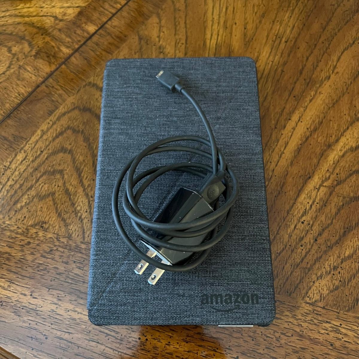 Amazon fire tablet with case measures 4.75” x .5” x 7.5”H. Includes charging cable. Tablet powered on when plugged in. Tablet was wiped and restored to factory settings.