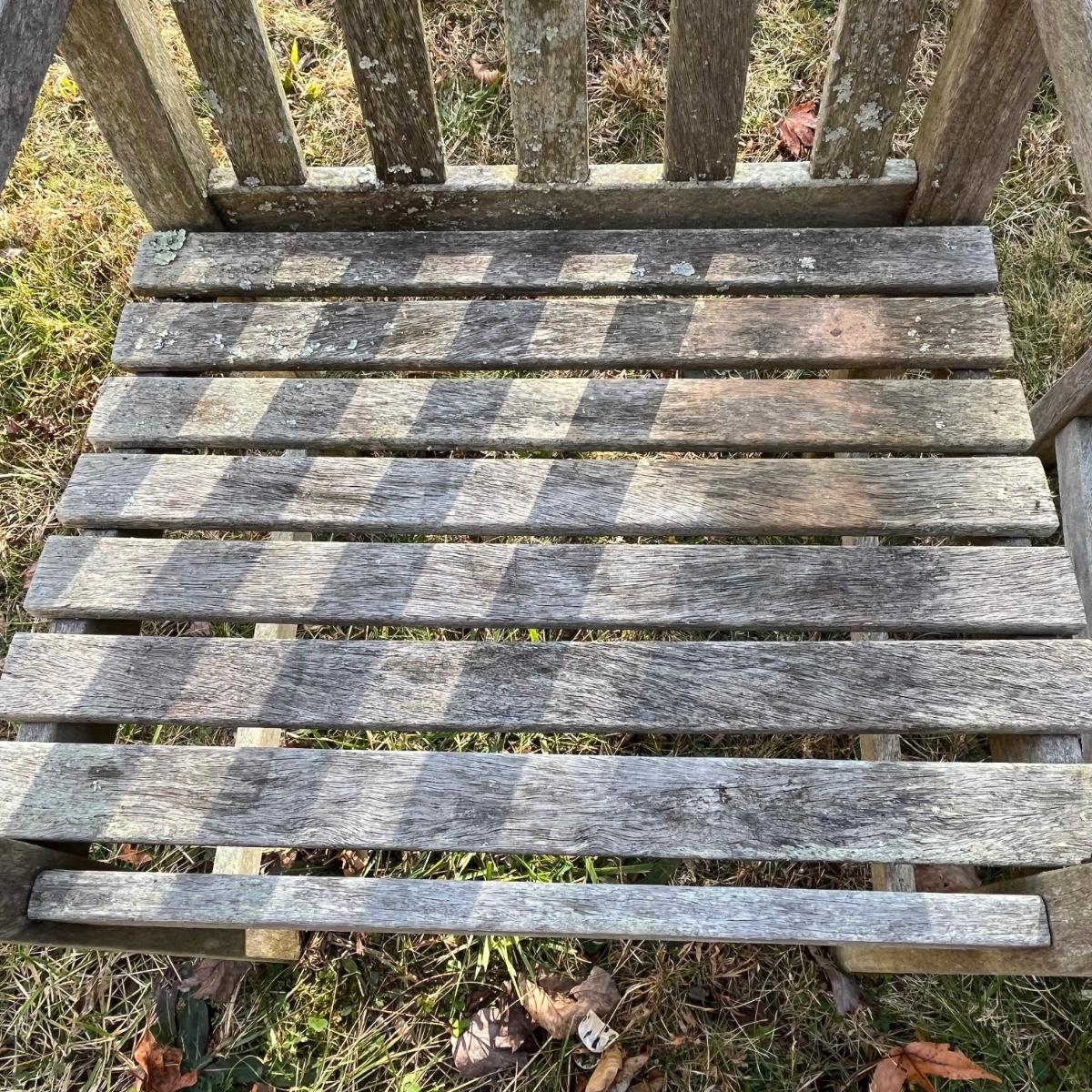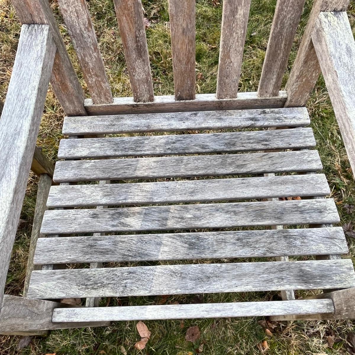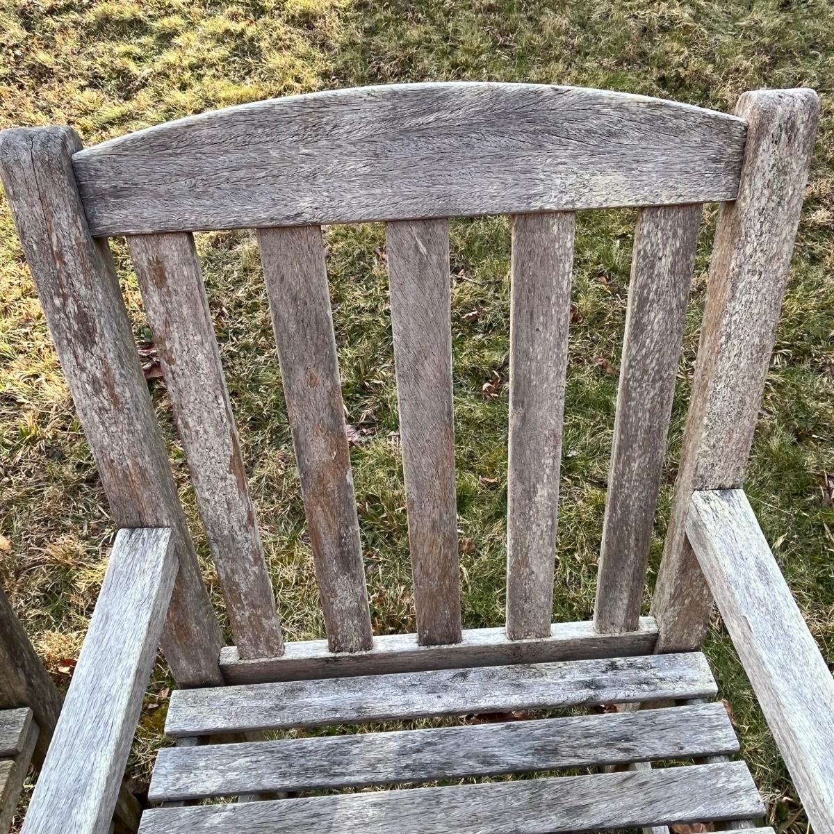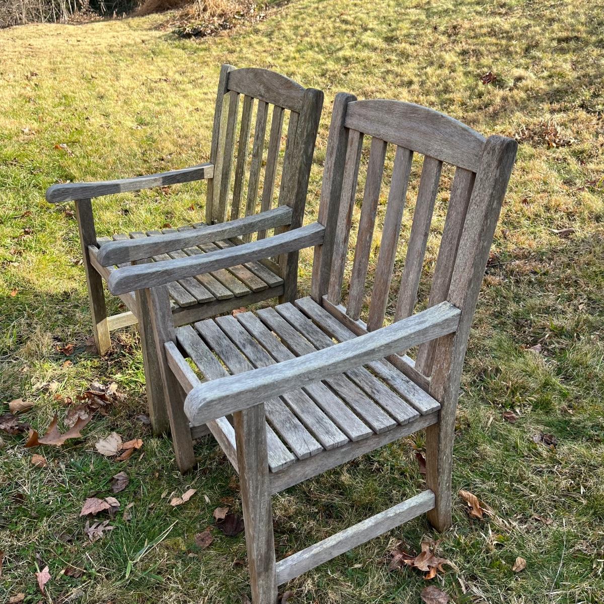 Two teak wood chairs. Paperwork states from the South American Amazon Forest. Each measure 21” x 26” x 36.5”H with a seat height of 17”. They are well loved but appear to be sturdy.