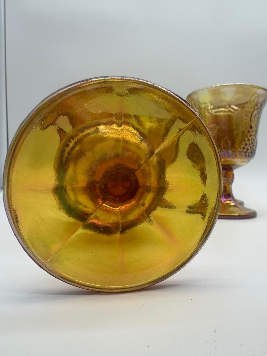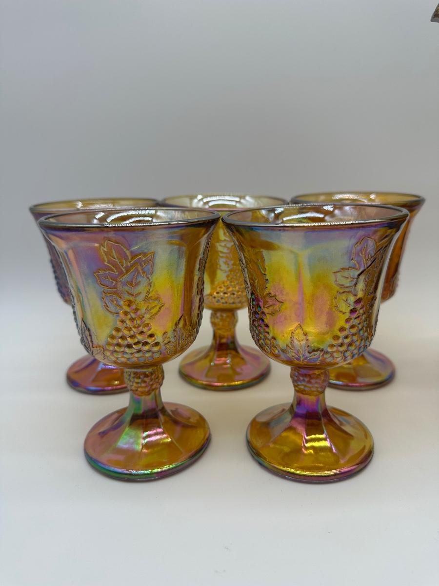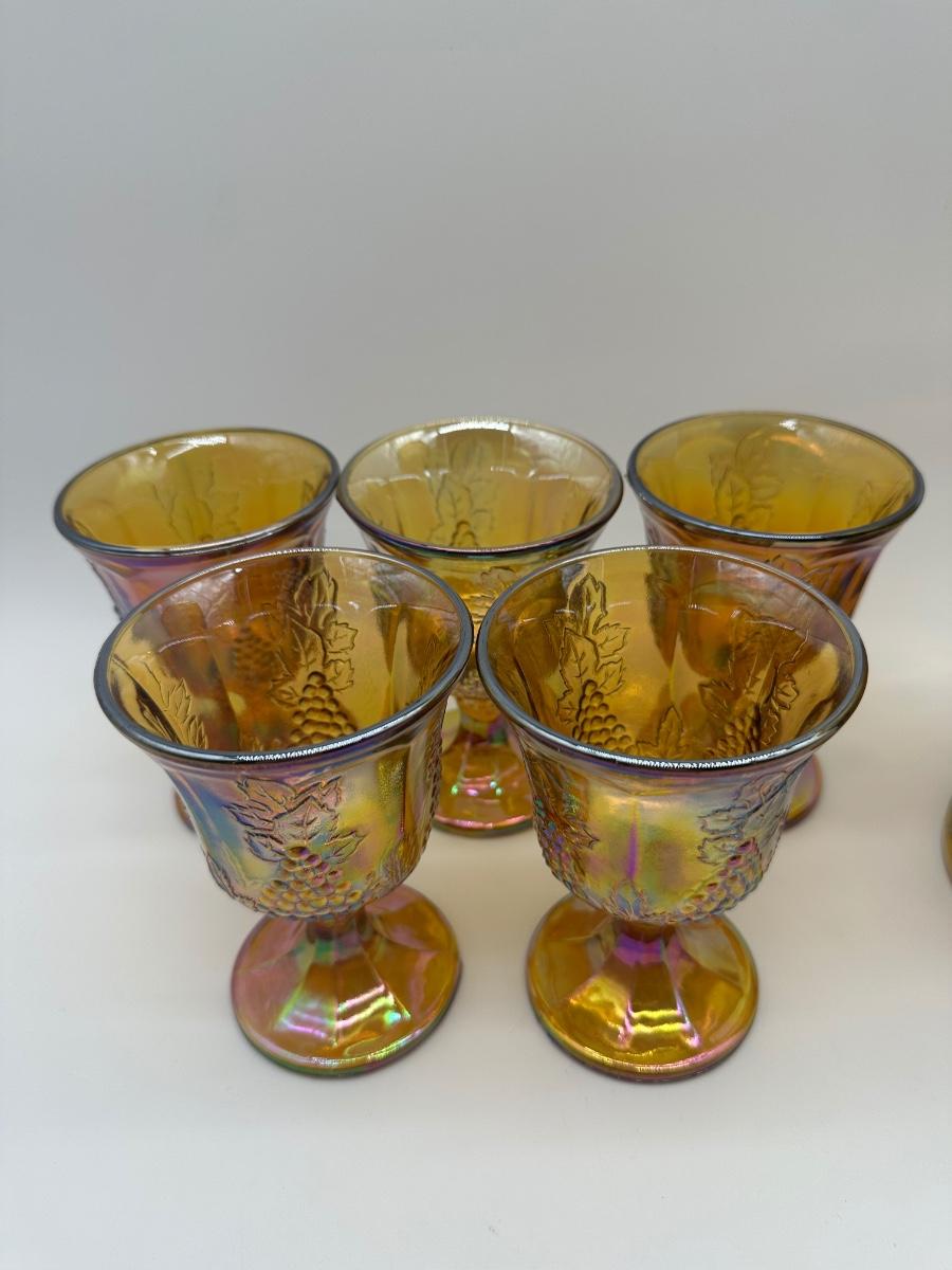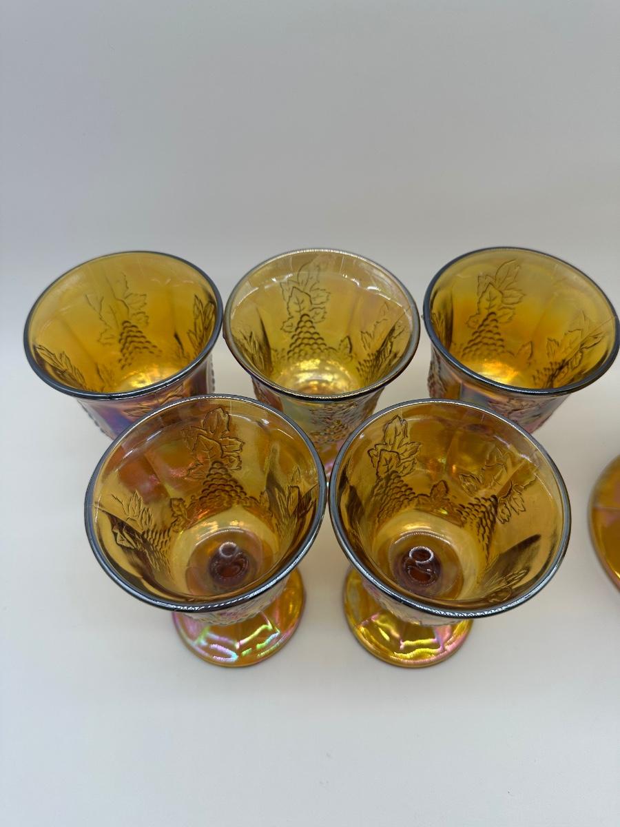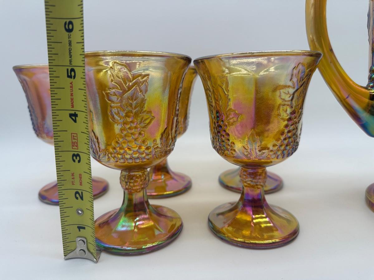 Amber carnival glass pitcher with raised grape and leaf design, paired with five matching stemmed goblets. Iridescent finish throughout. Pedestal bases.