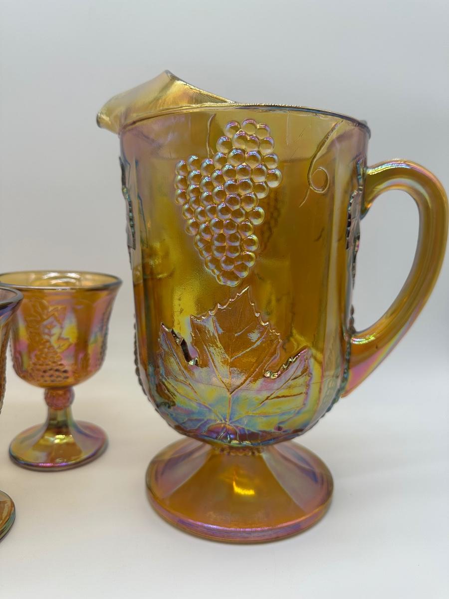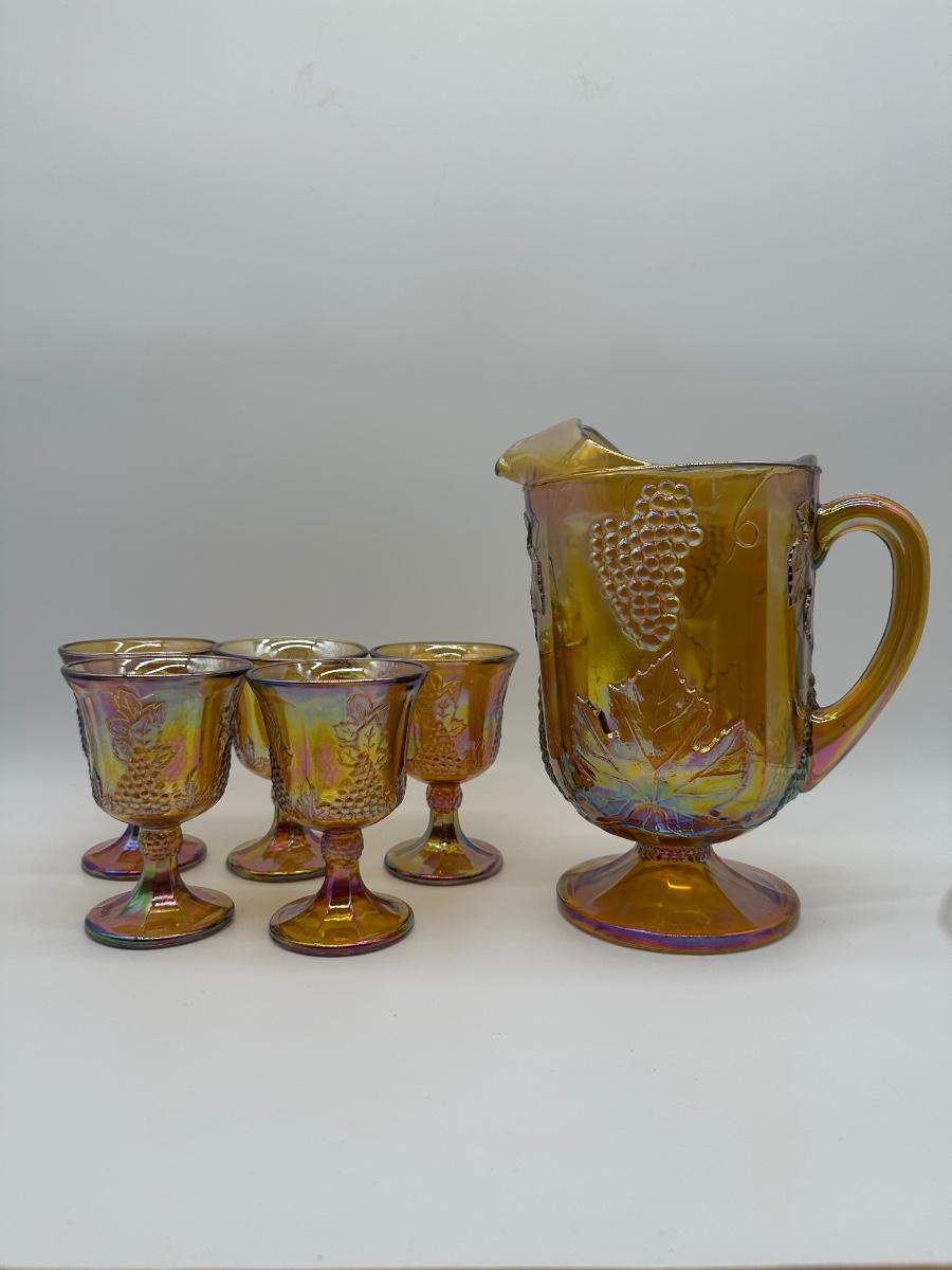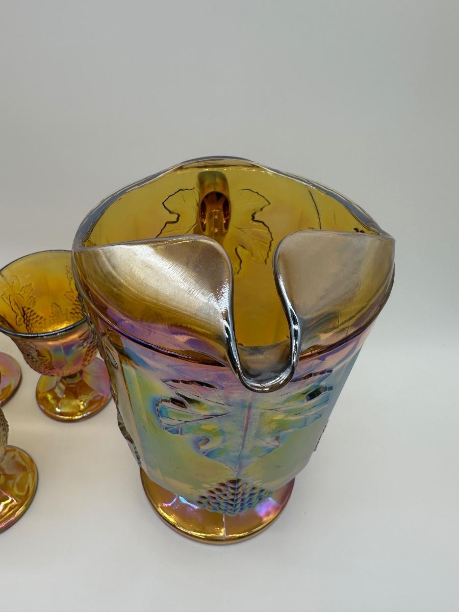 Amber Carnival Glass Grape & Leaf Pitcher with 5 Goblets