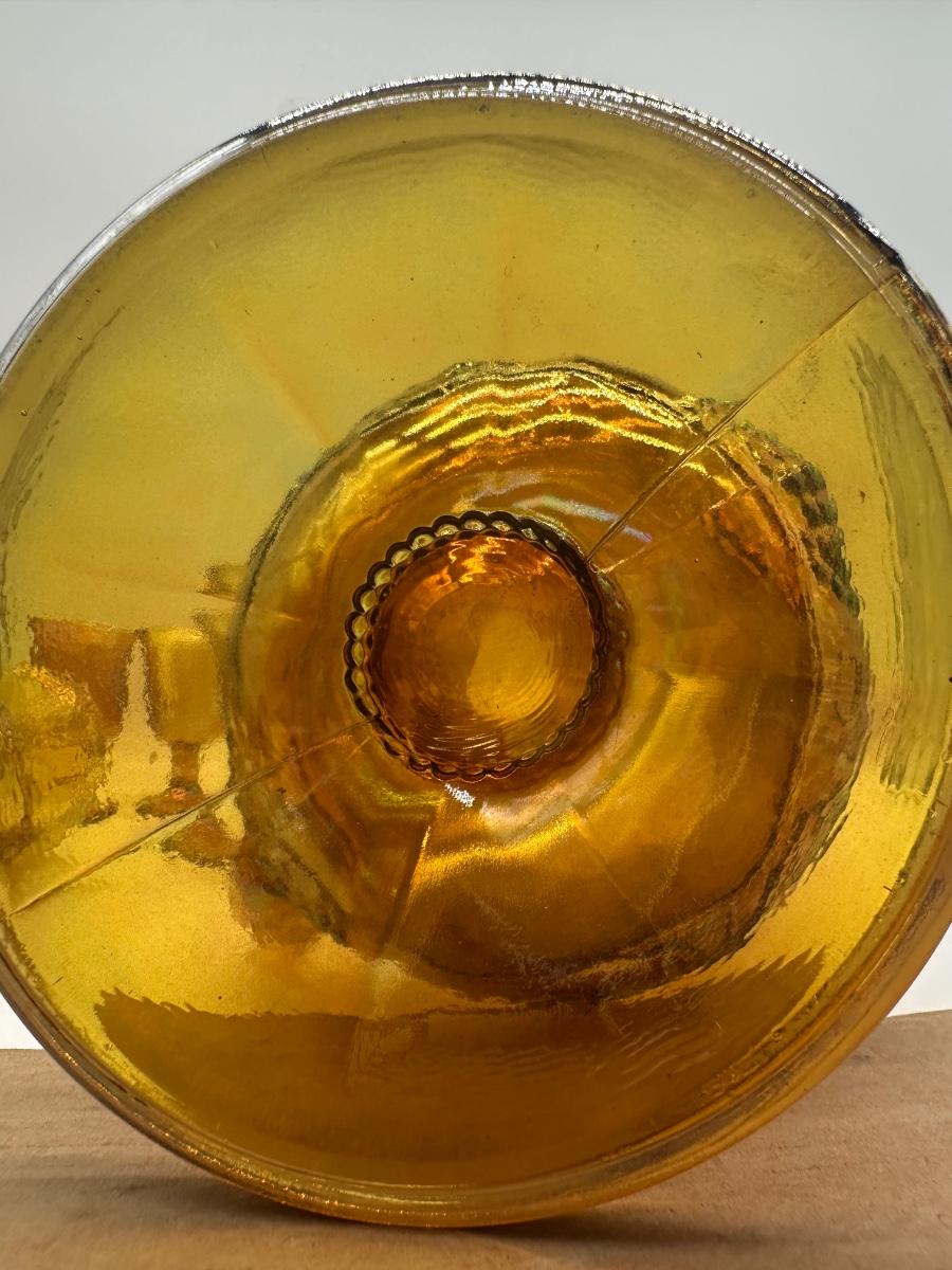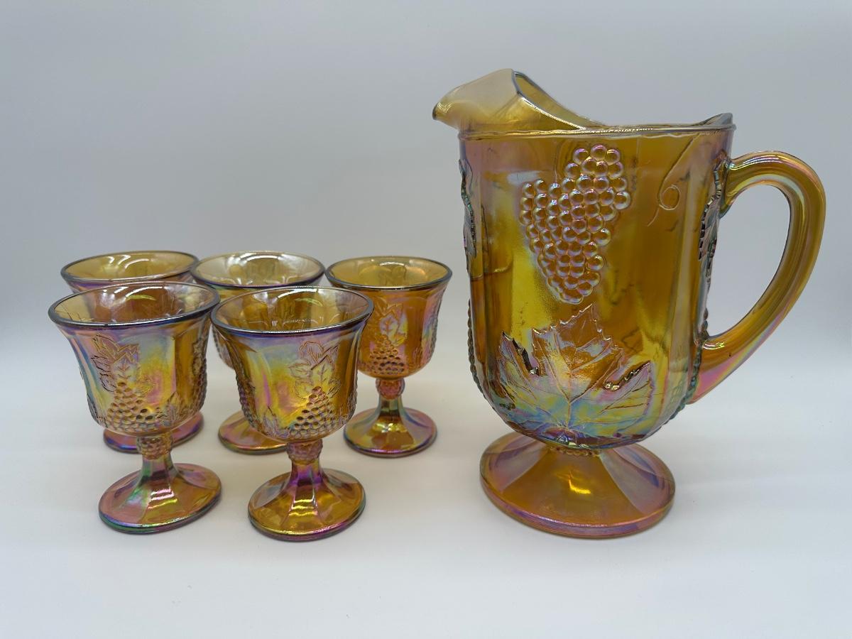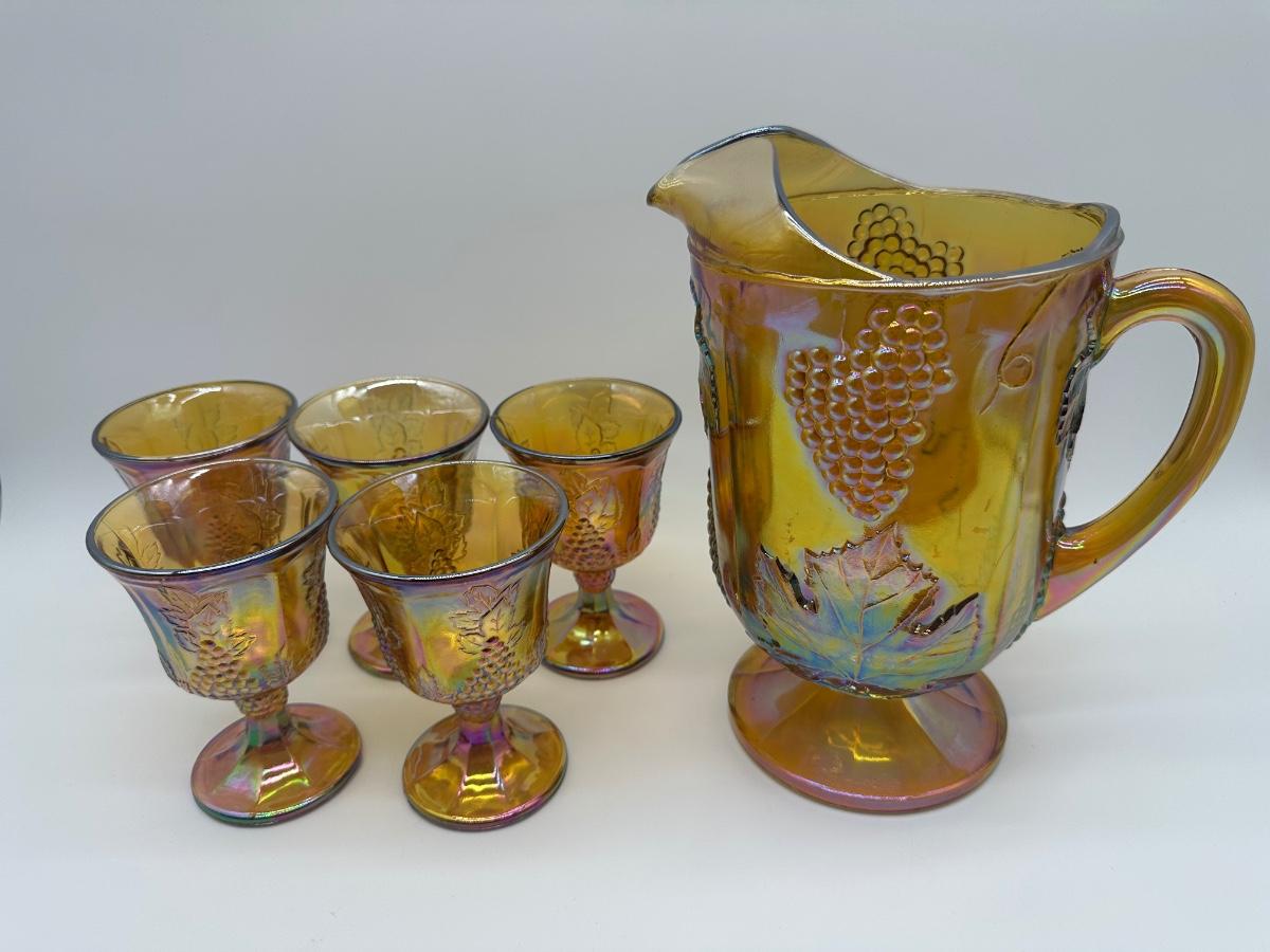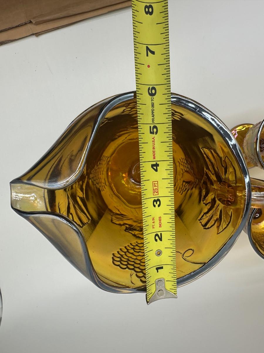 Amber Carnival Glass Grape & Leaf Pitcher with 5 Goblets