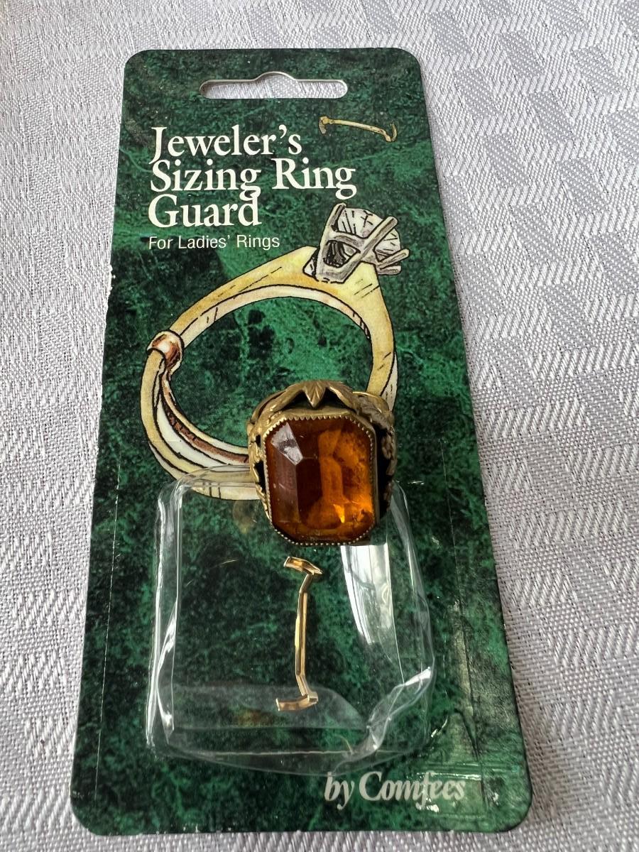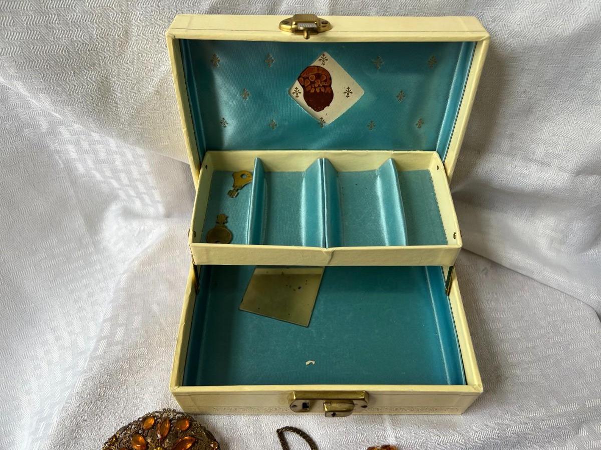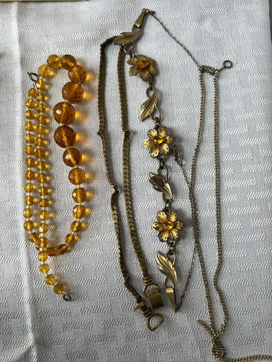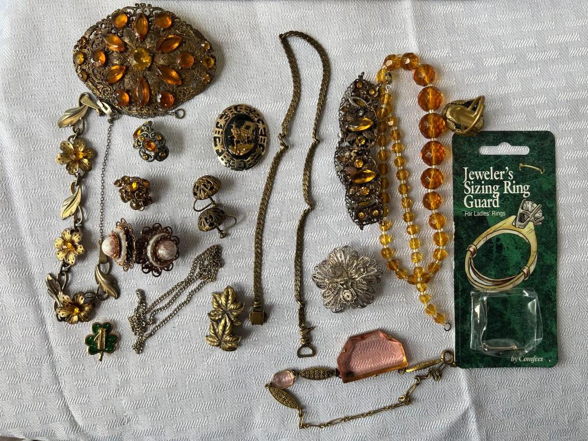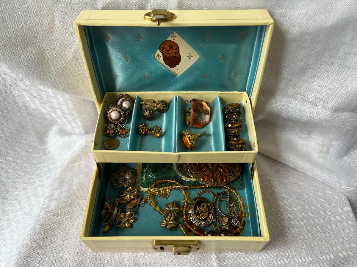 AMBER COLORED FAUX GEMSTONE JEWELRY INCLUDING, NECKLACES, CLIP ON EARRINGS, SIZING RING GAURD AND RING, AND MORE WITH LOCKING BOX