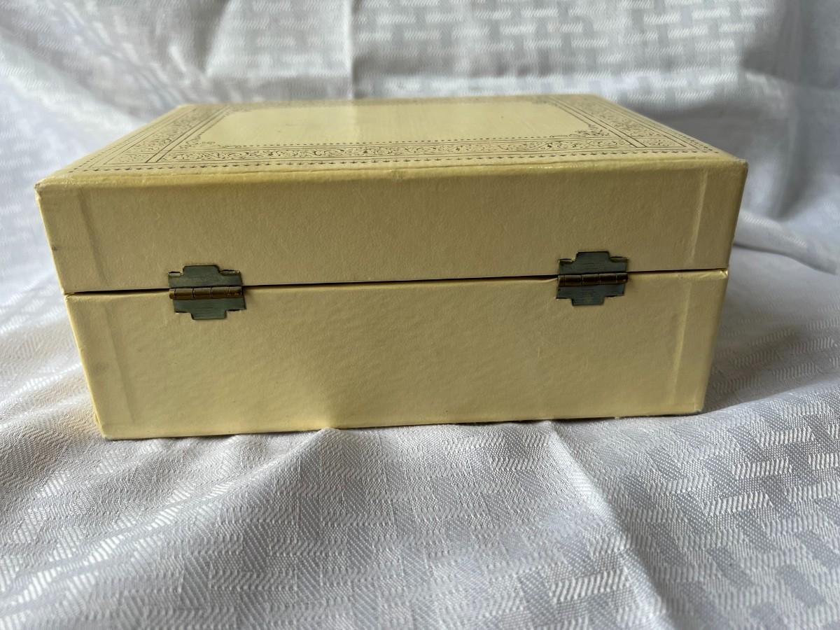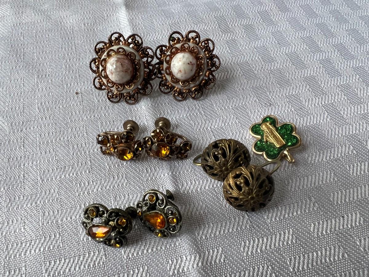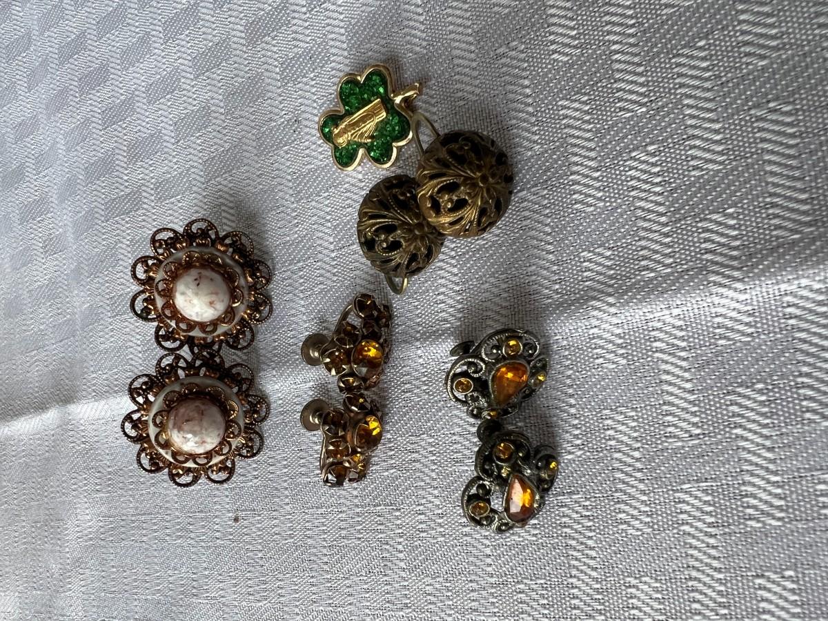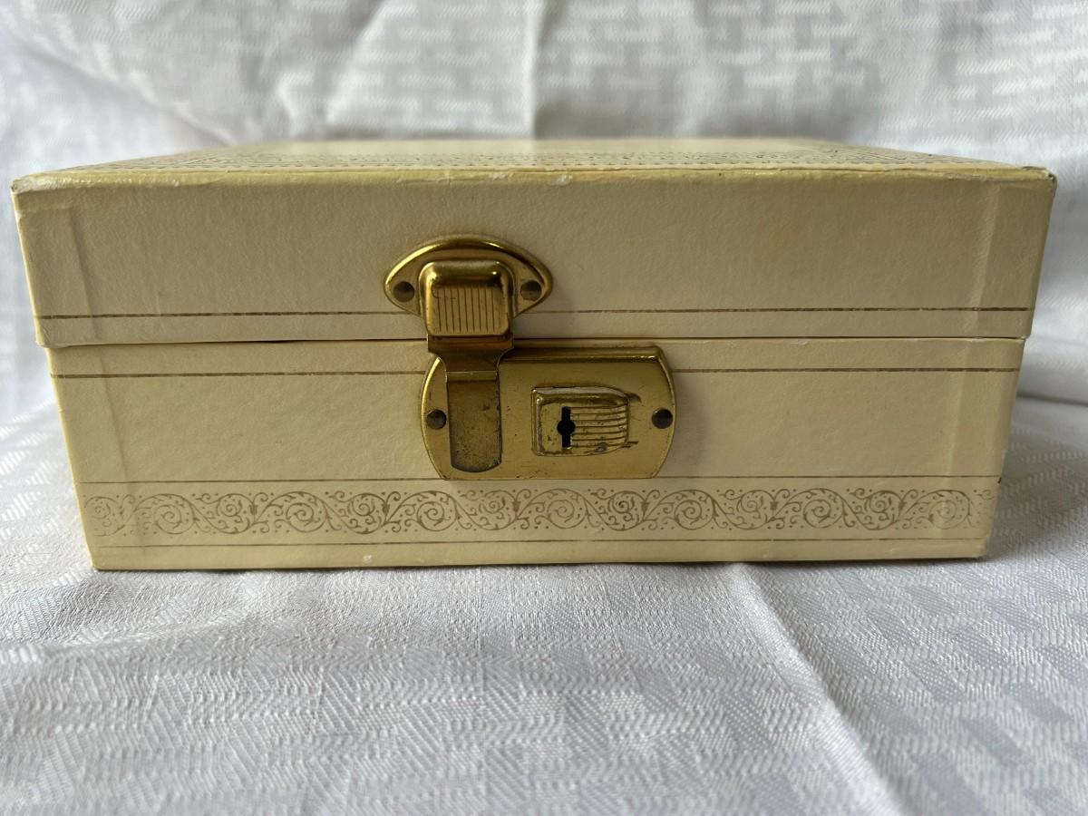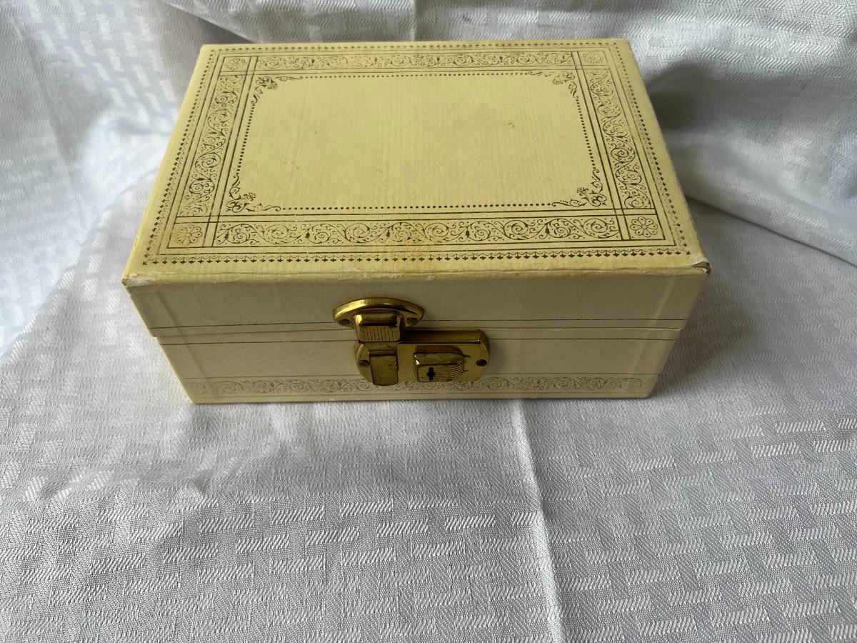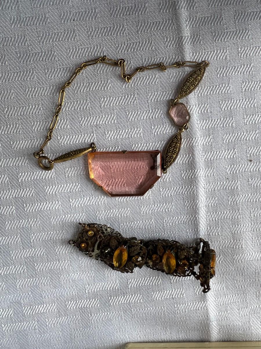 AMBER COLORED FAUX GEMSTONE JEWELRY INCLUDING, NECKLACES, CLIP ON EARRINGS, SIZING RING GAURD AND RING, AND MORE WITH LOCKING BOX