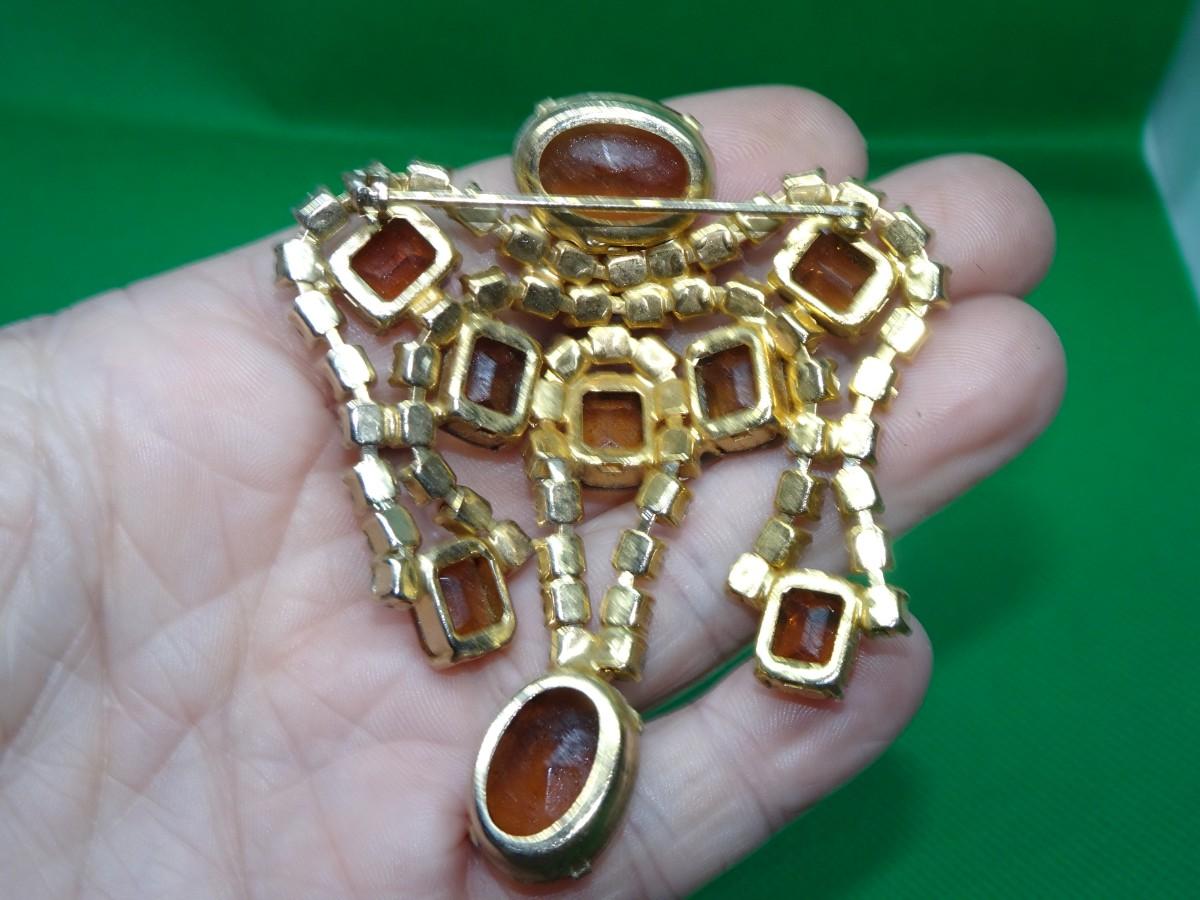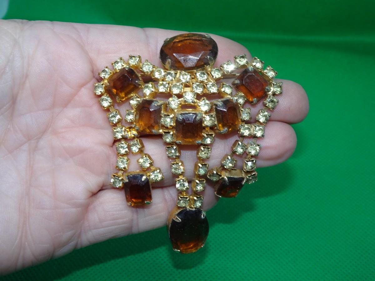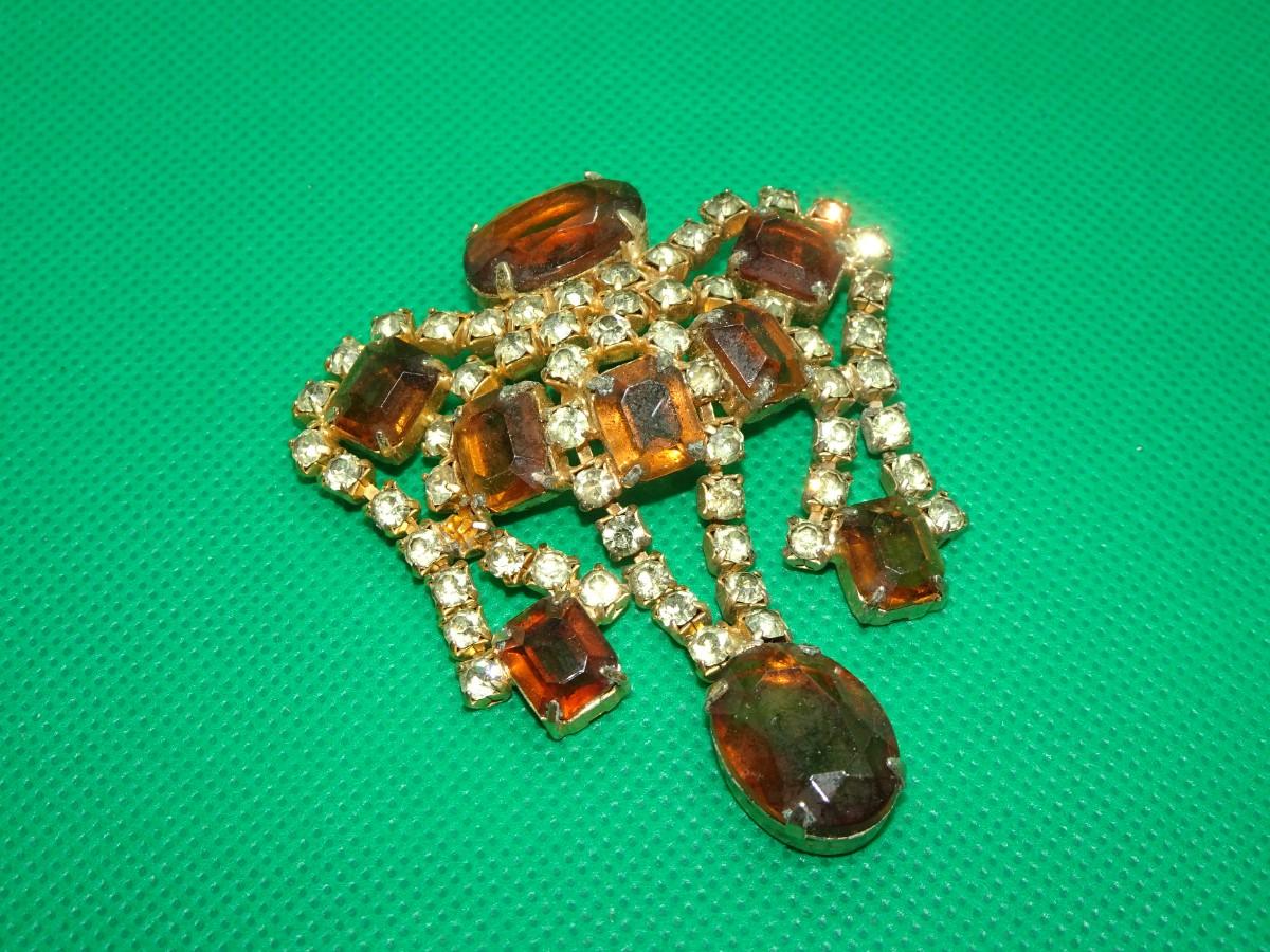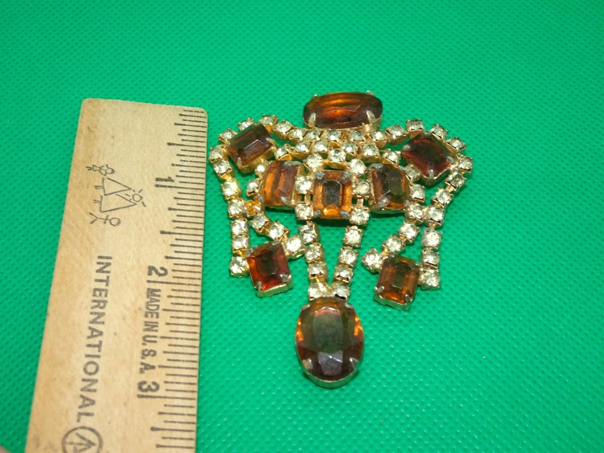 Amber Colored Rhinestone Victorian Style Dangle Brooch