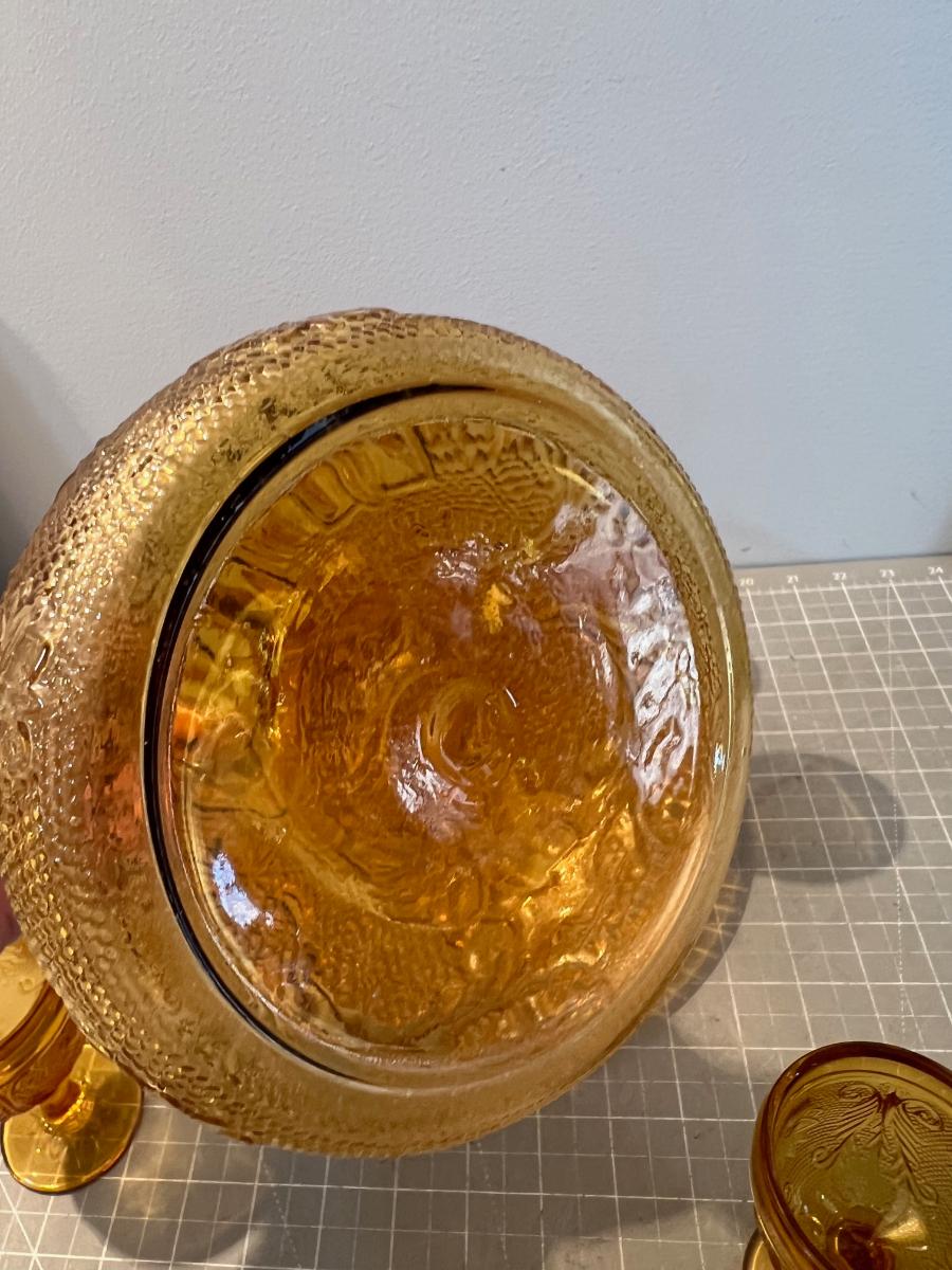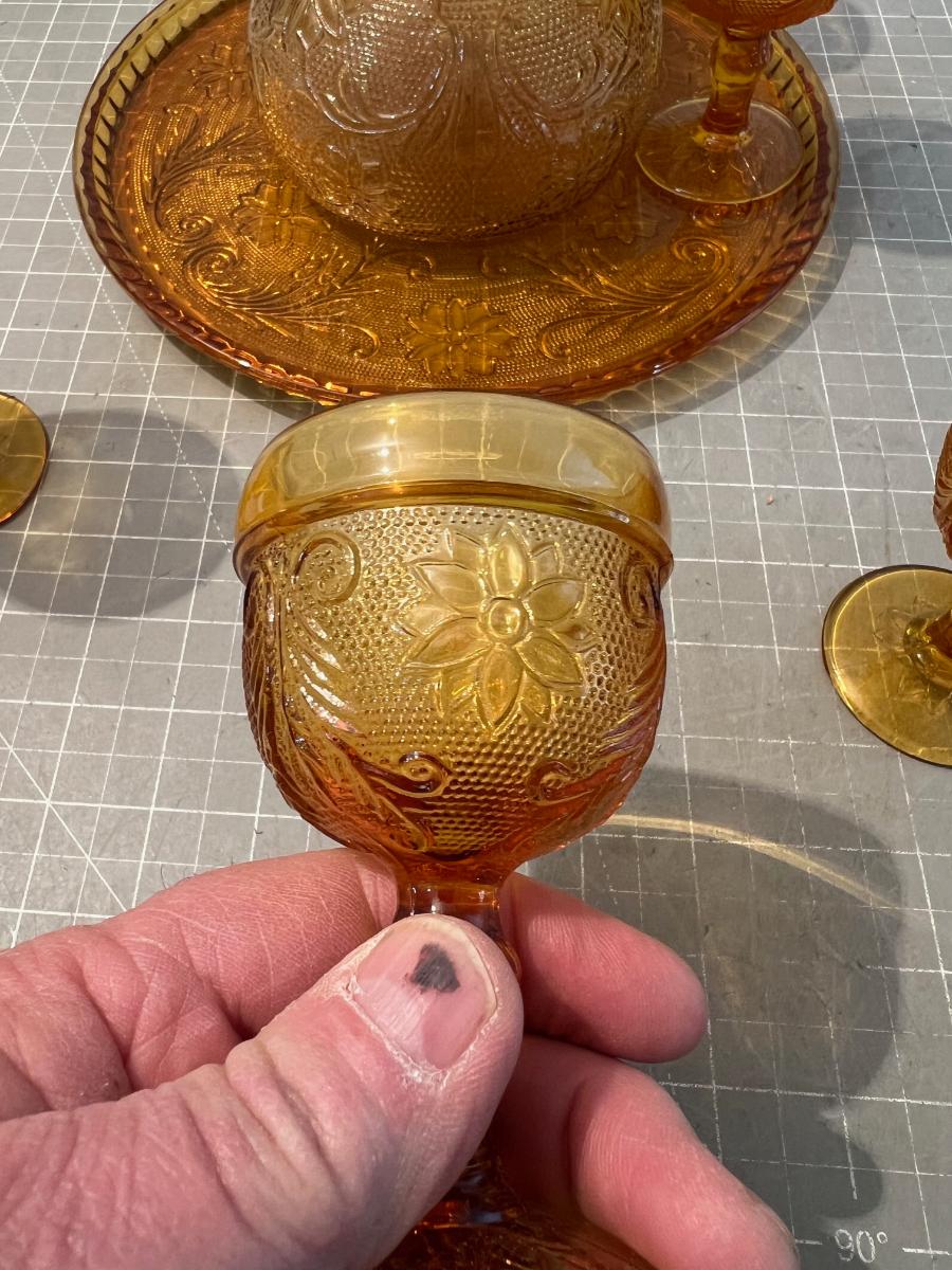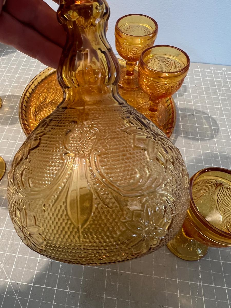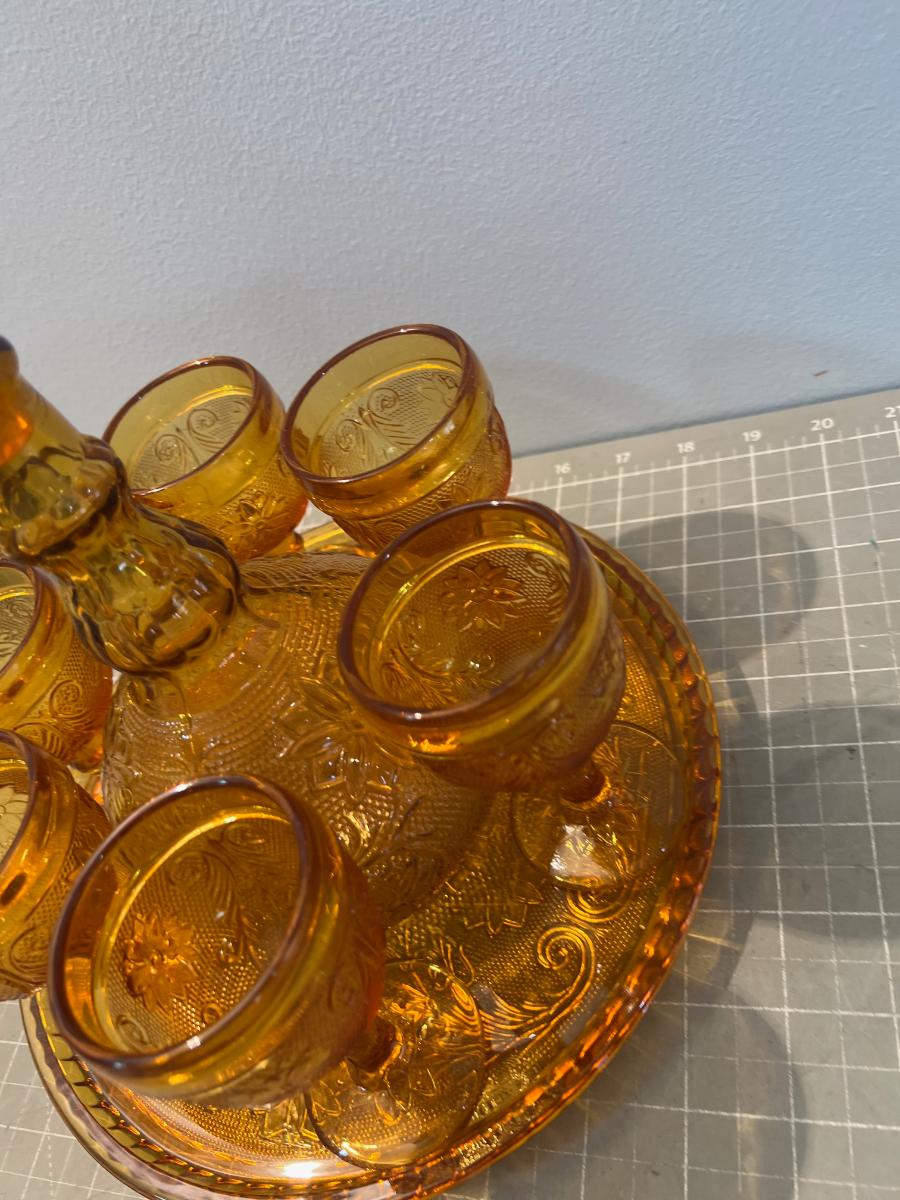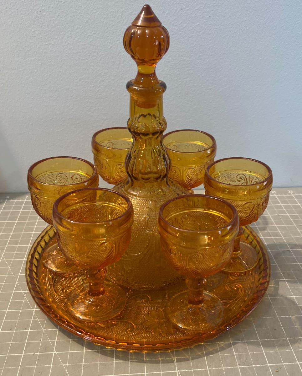 Amber Decanter, Server and Cups, by TIARA Sandwich Glass