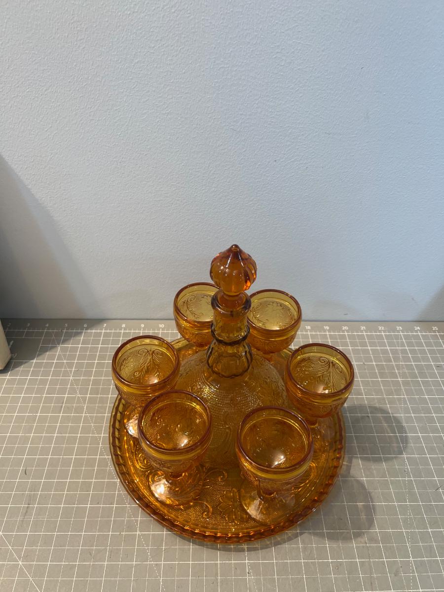 Amber Decanter, Server and Cups,  by TIARA Sandwich Glass