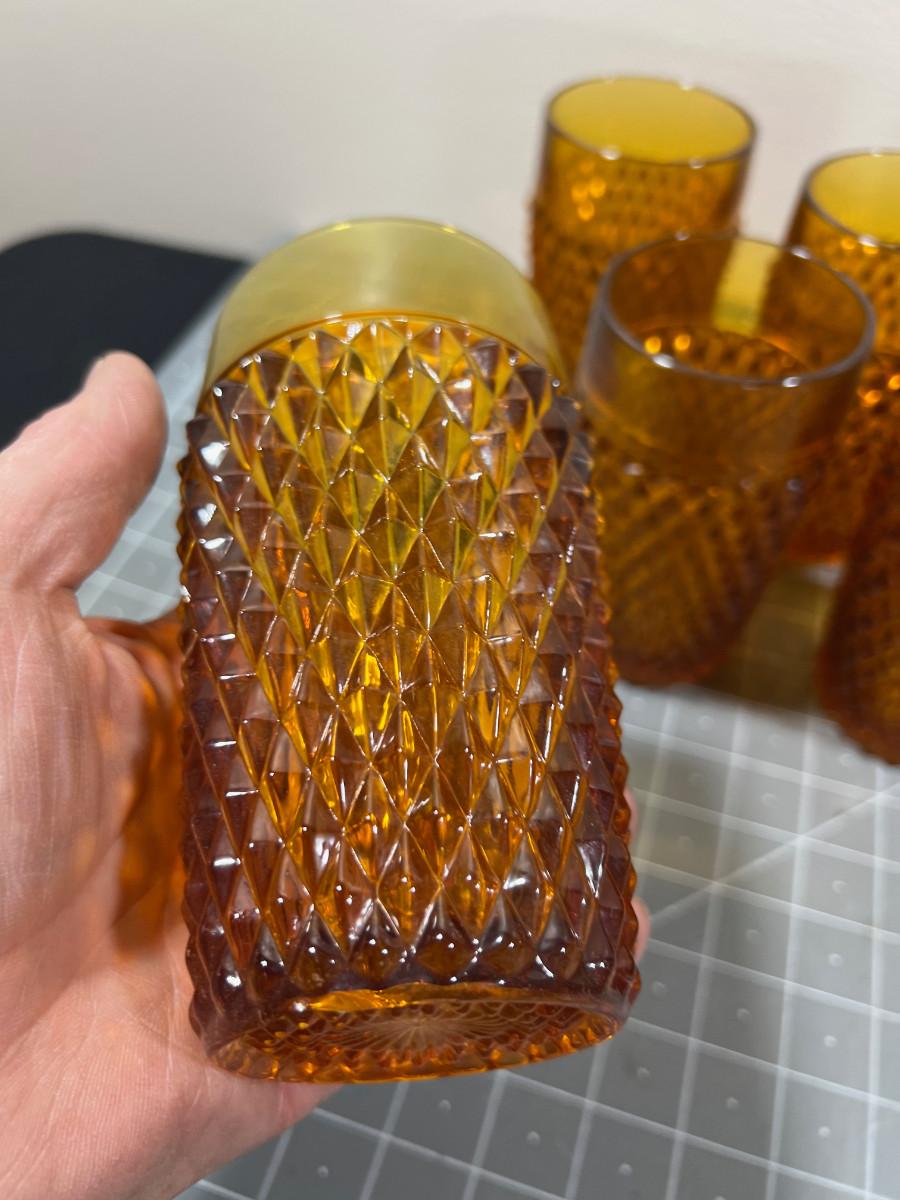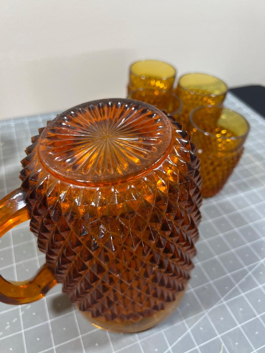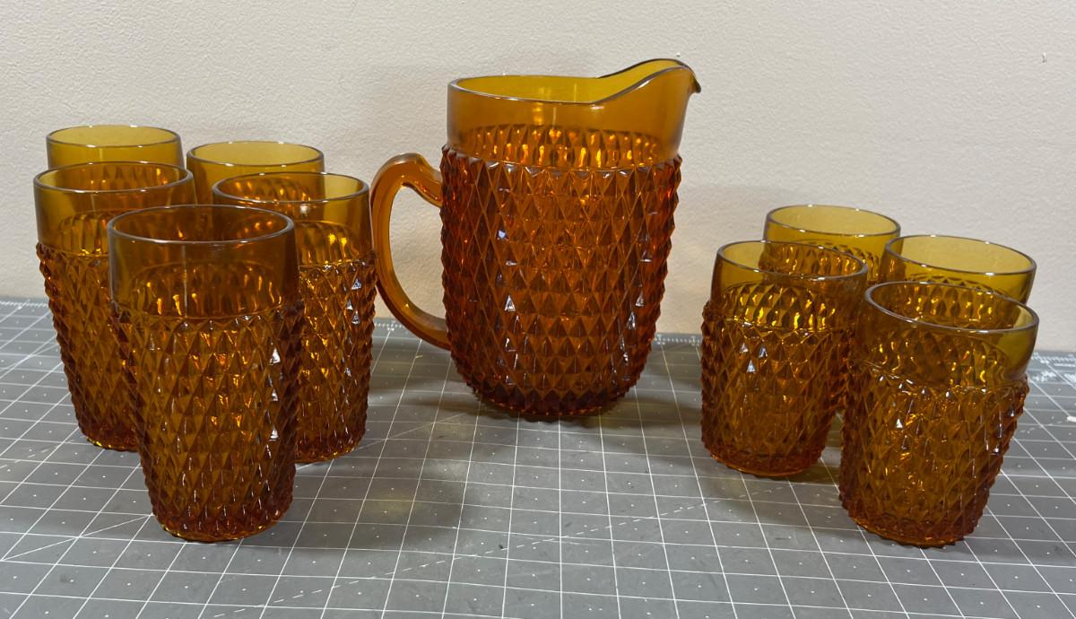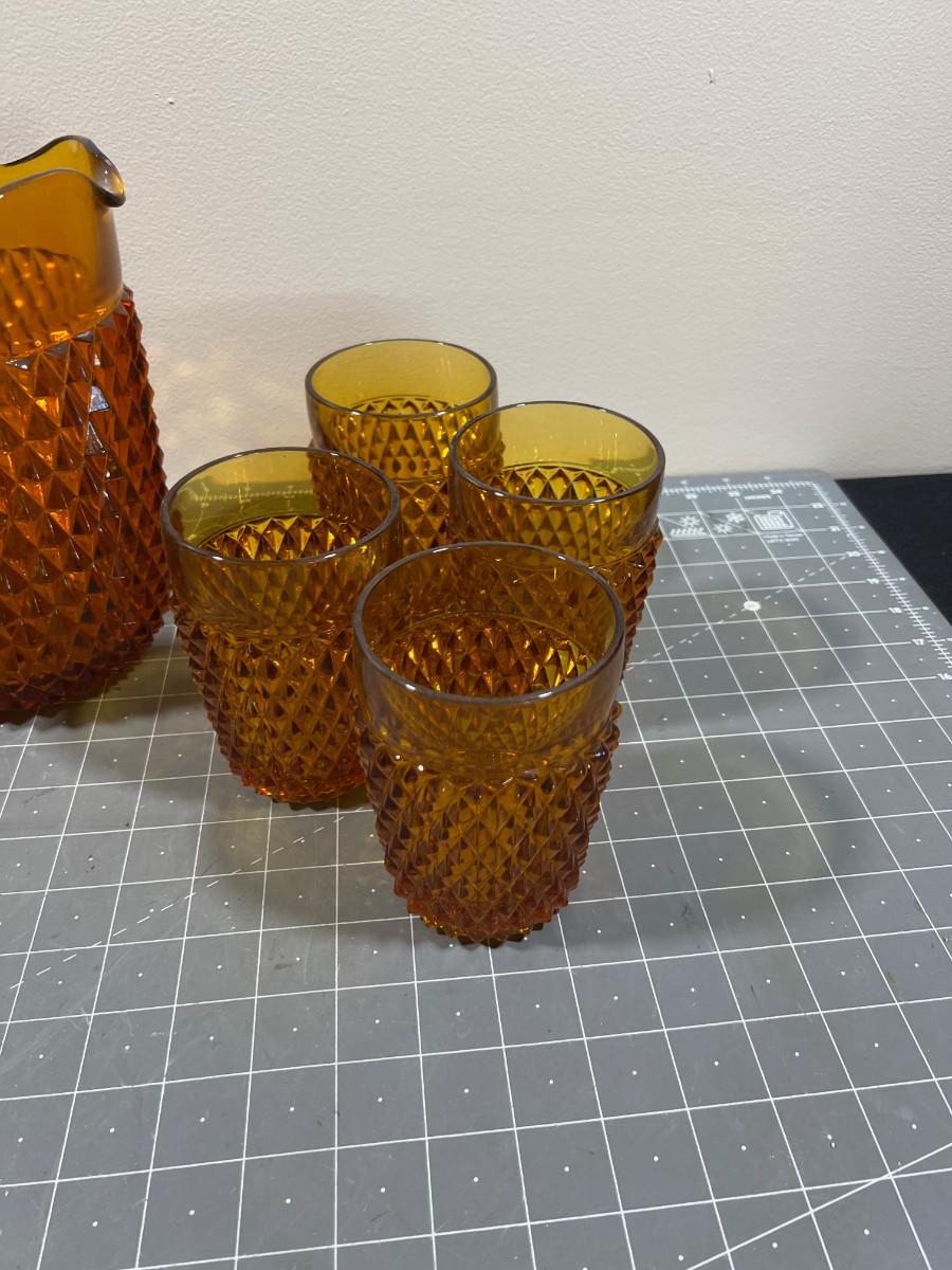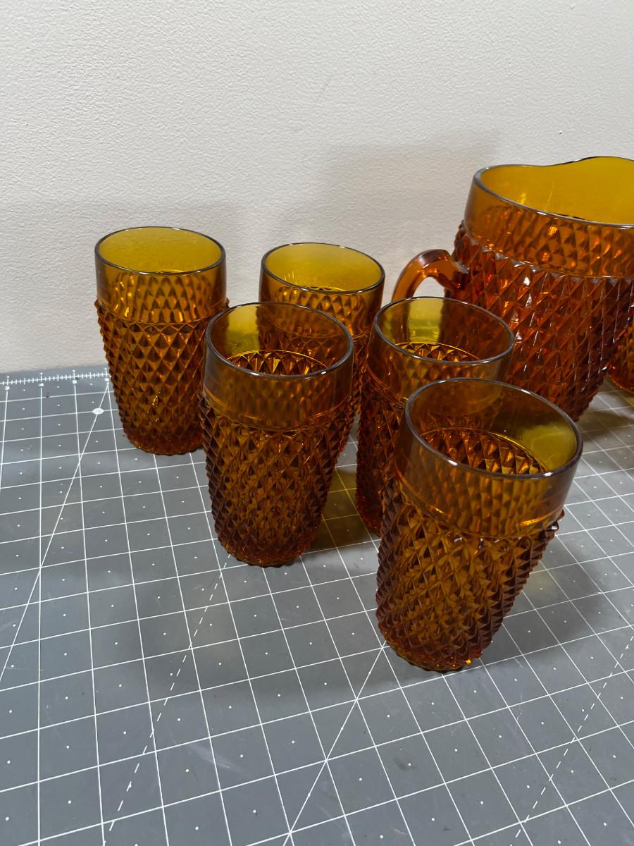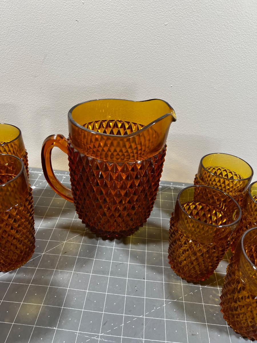 AMBER Diamond Point by Anchor Hocking Glass Ware Pitcher with Tumblers and