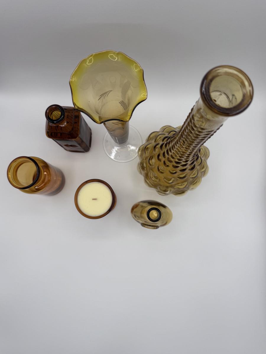 Assortment of amber color glass: tall bubble hobnail-look 14" tall decanter (no stopper, made with a seam); a stamped Wheaton, NJ 5-1/2" tall bitter bottle (small chip on edge of top); a delicate etched bud vase (10" tall); a 5-1/2" tall apothecary jar (no cork for top); and more. Overall good condition. The items in this lot would work well as display or decoration.