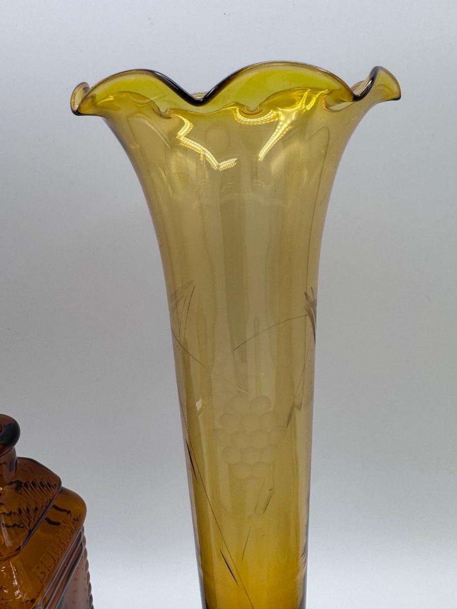 Assortment of amber color glass: tall bubble hobnail-look 14" tall decanter (no stopper, made with a seam); a stamped Wheaton, NJ 5-1/2" tall bitter bottle (small chip on edge of top); a delicate etched bud vase (10" tall); a 5-1/2" tall apothecary jar (no cork for top); and more. Overall good condition. The items in this lot would work well as display or decoration.