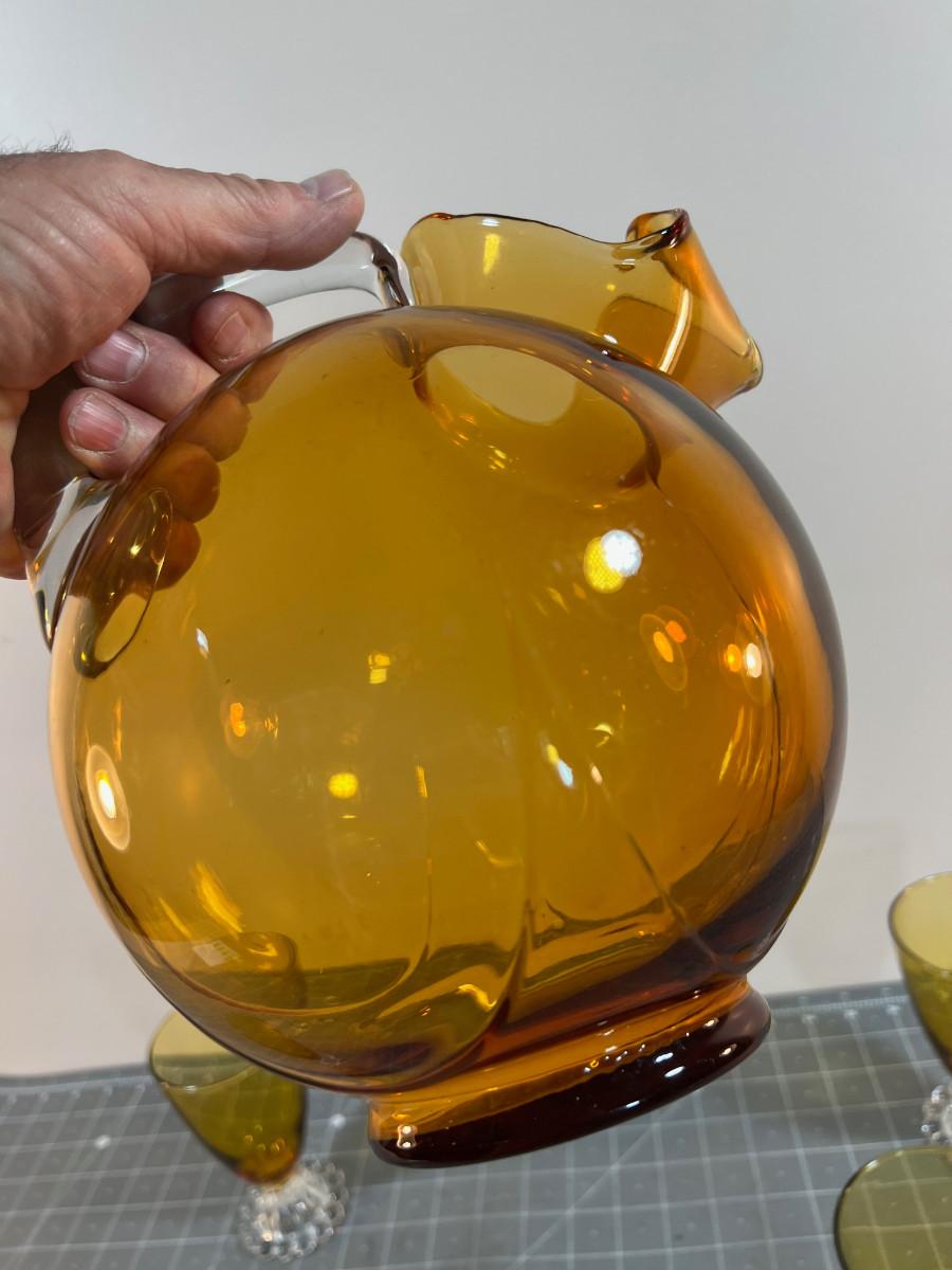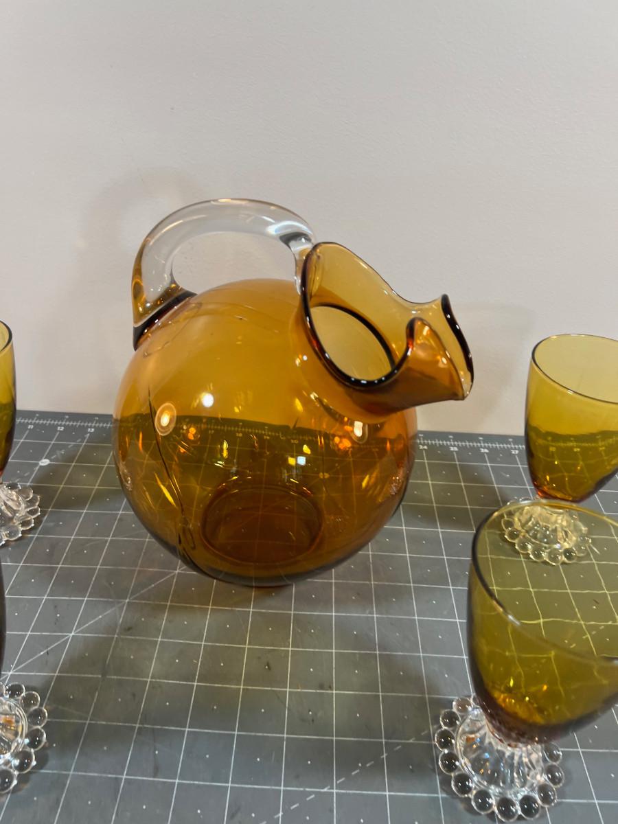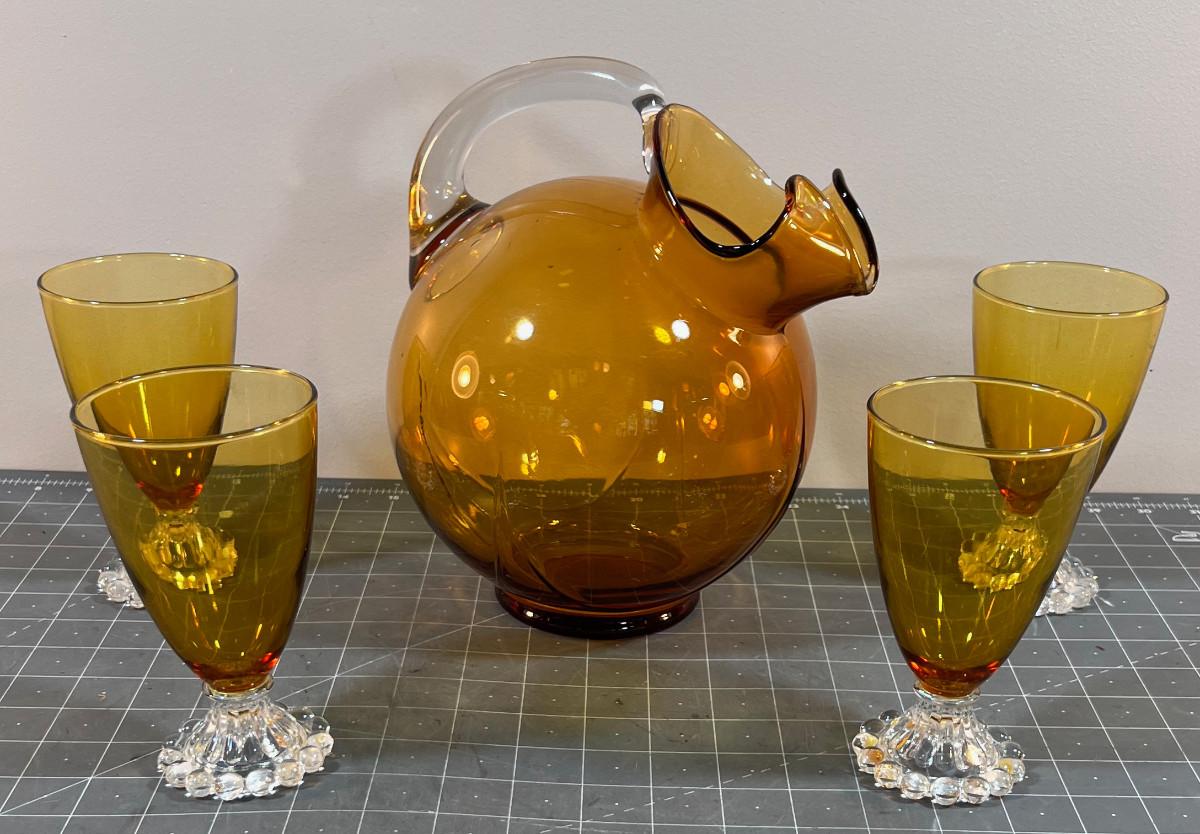 AMBER GLASS Ball Jug Pitcher and 4 Tumblers