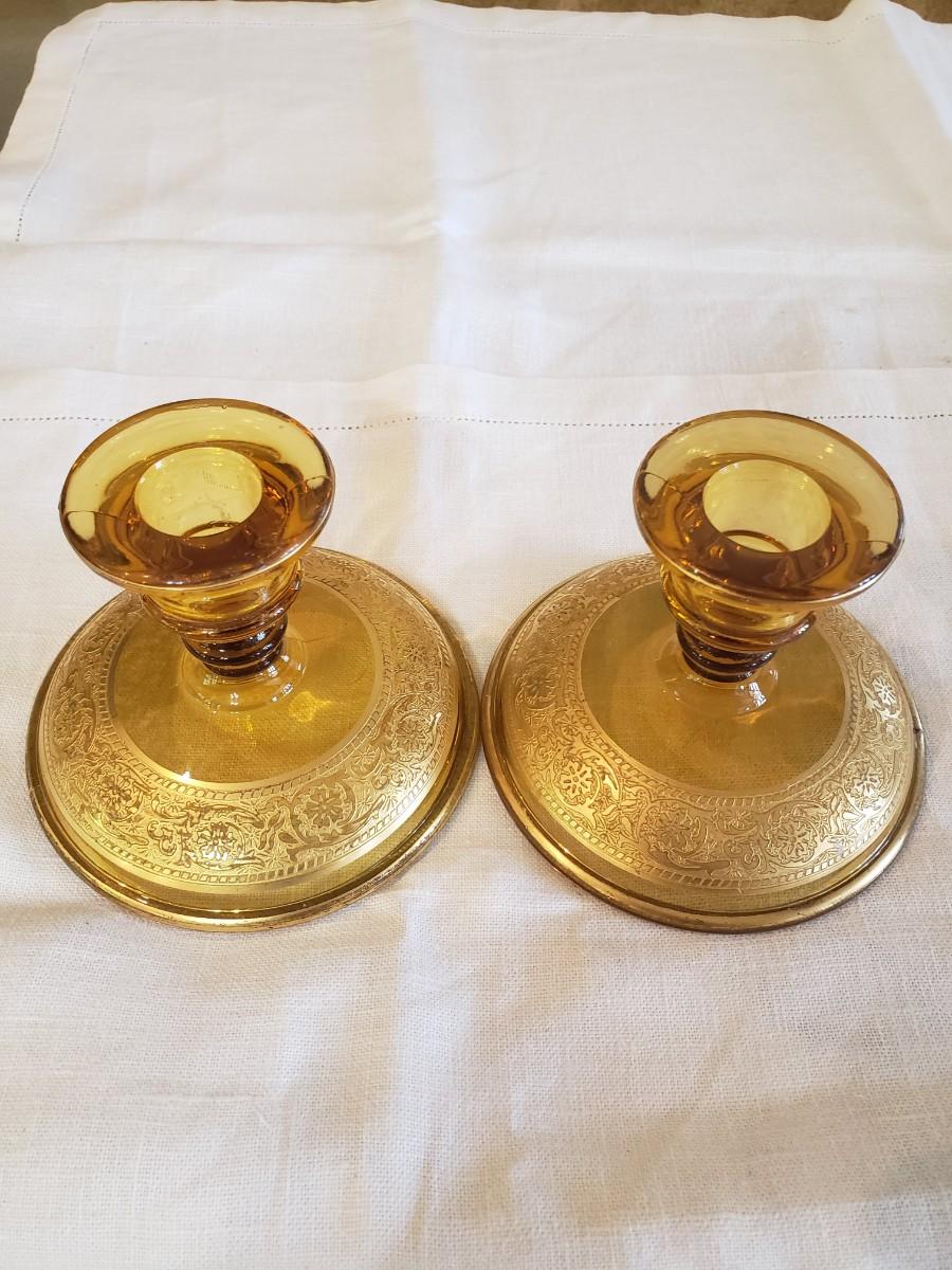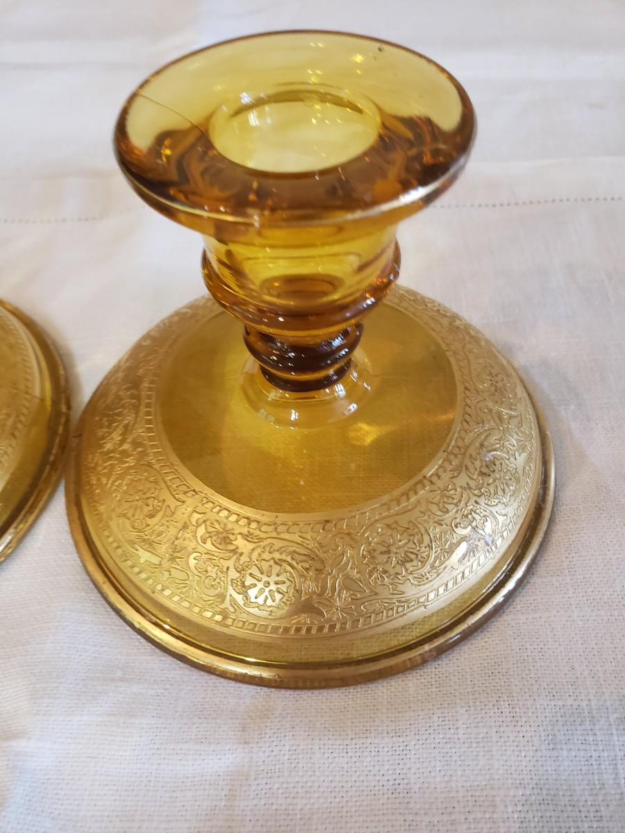 Vintage pair of amber glass Candlesticks decorated with gold trim. 4.5"W x 4"H.