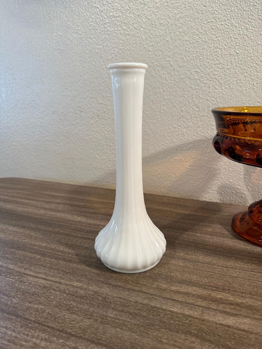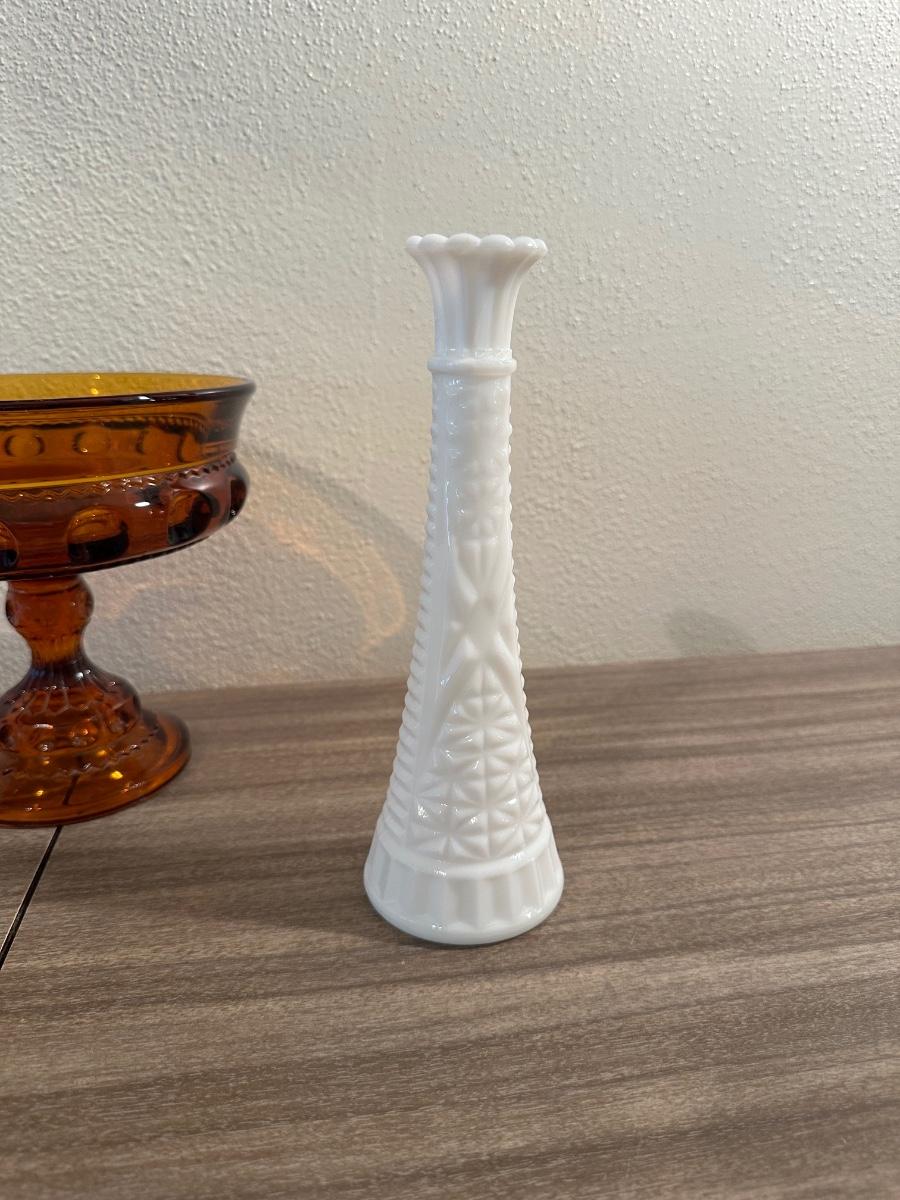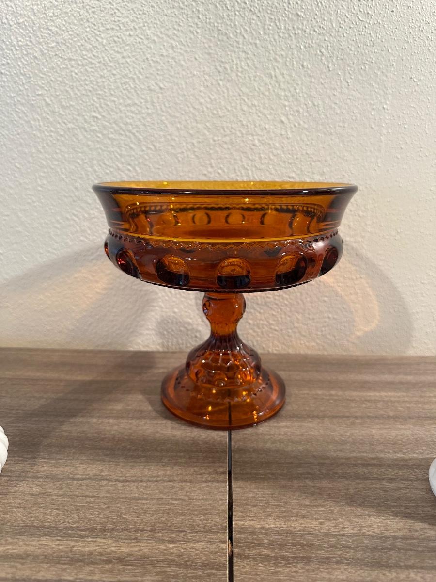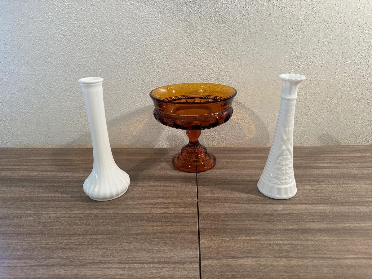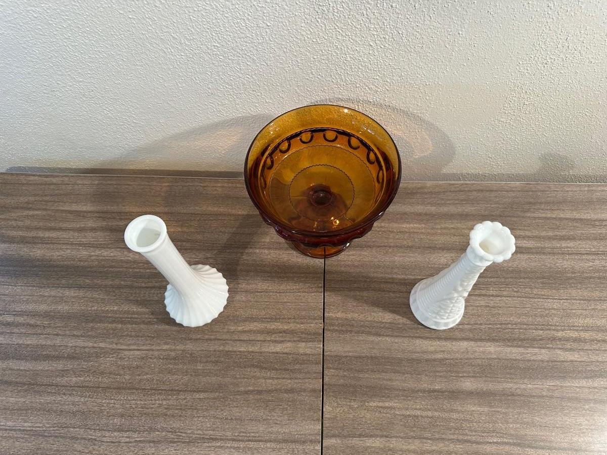 AMBER GLASS COMPOTE AND 2 MILK GLASS VASES