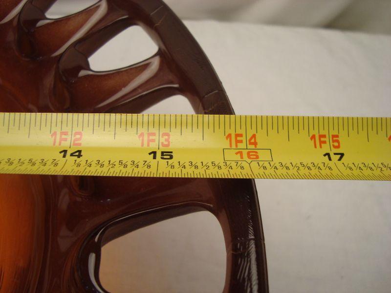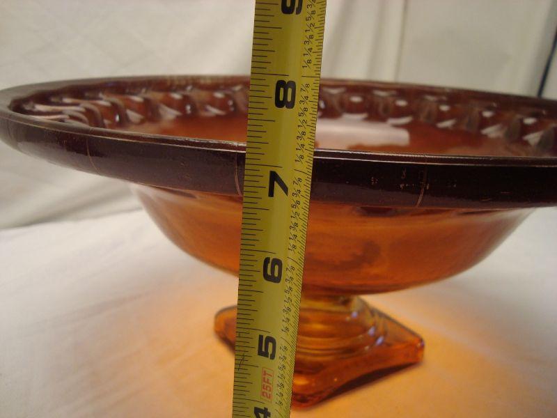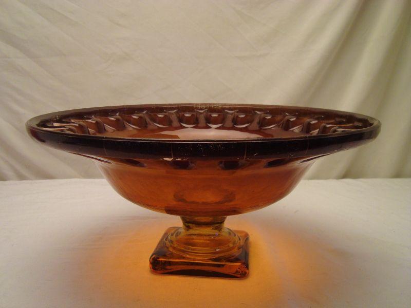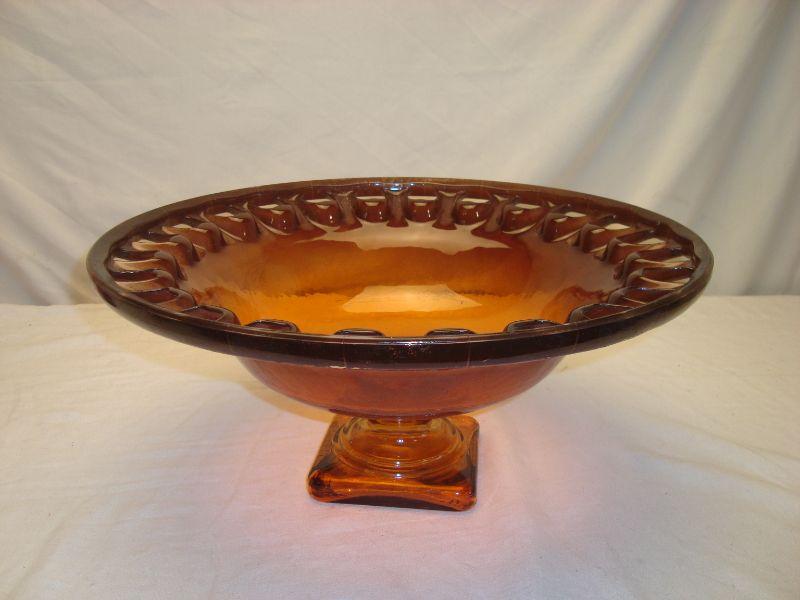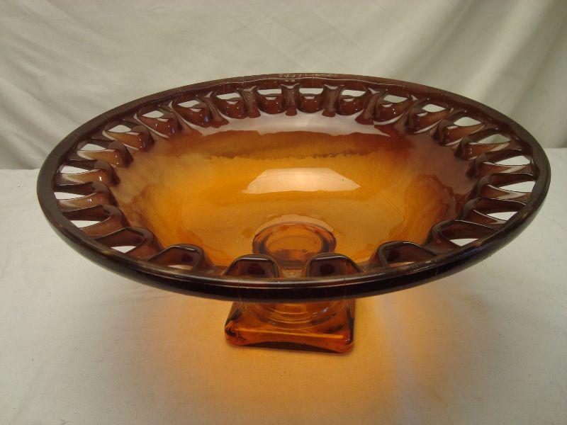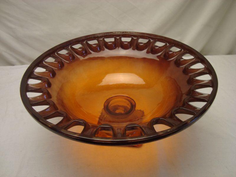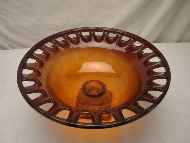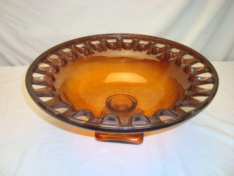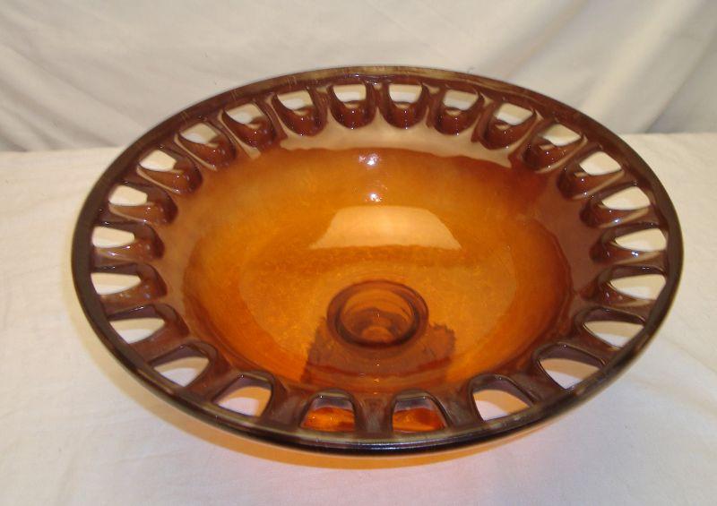 Vintage, Amber Glass Pedestal Compote/Fruit Bowl with Cutout Scalloped Edges. In Good Condition, no Chips or Cracks 16" x 16" x 7.5"