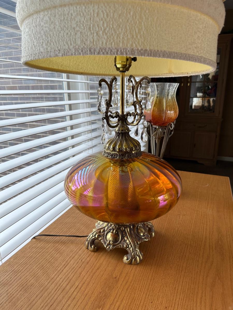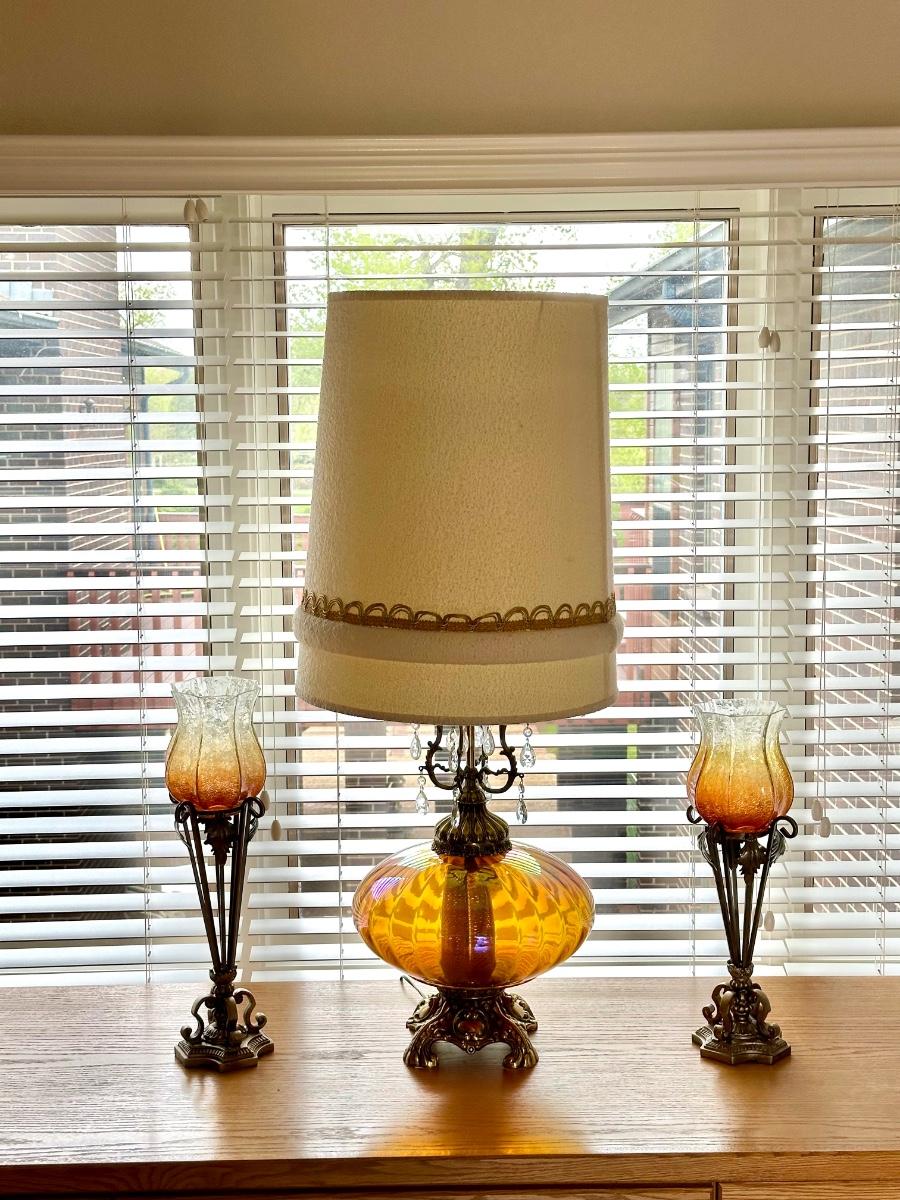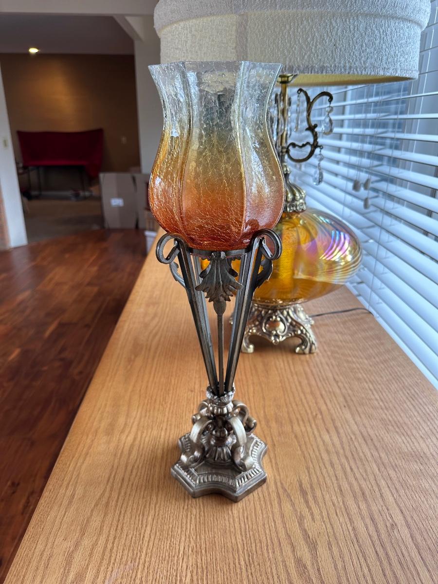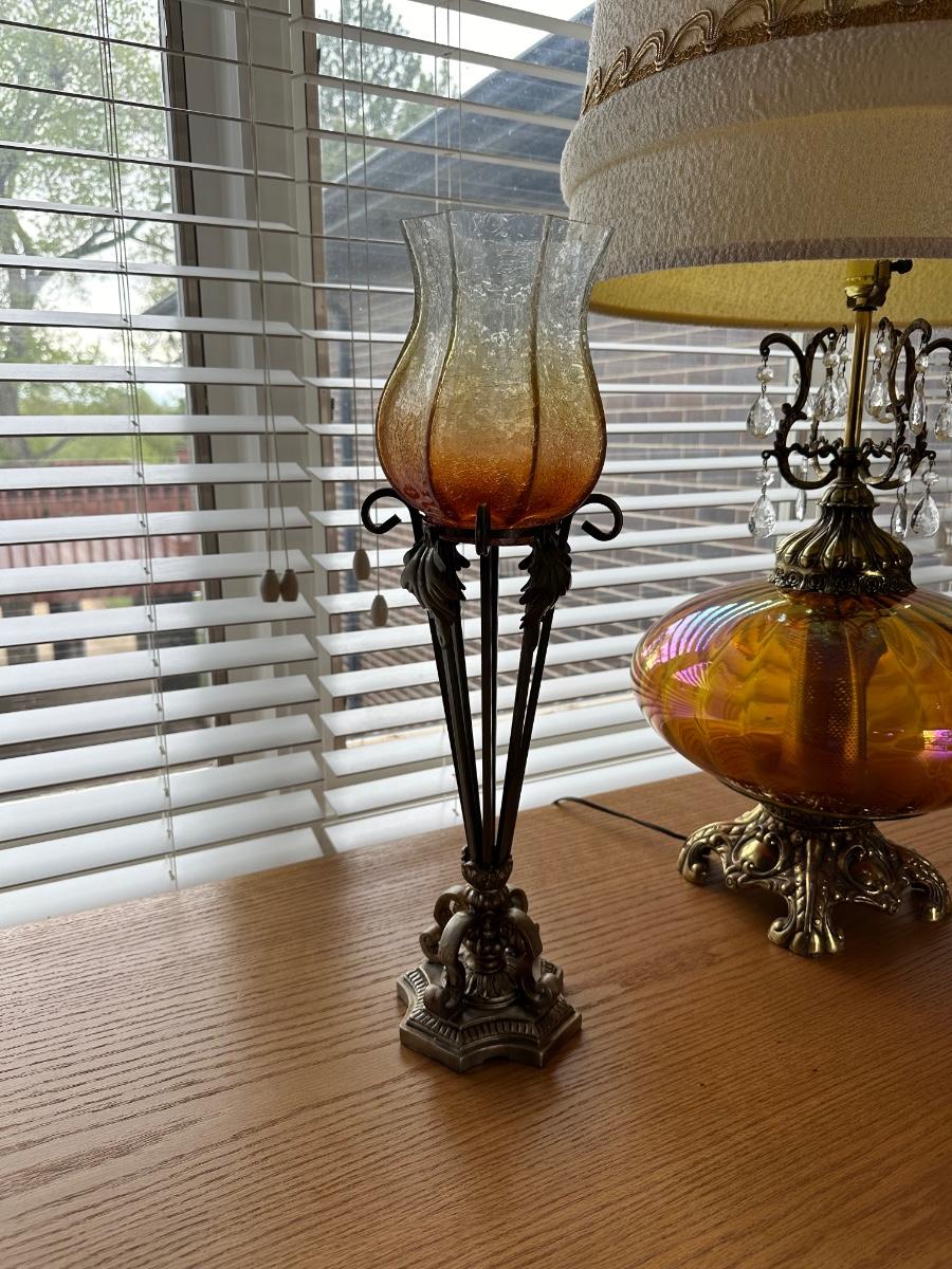 AMBER GLASS LAMP AND CRACKLE GLASS CANDLE HOLDERS