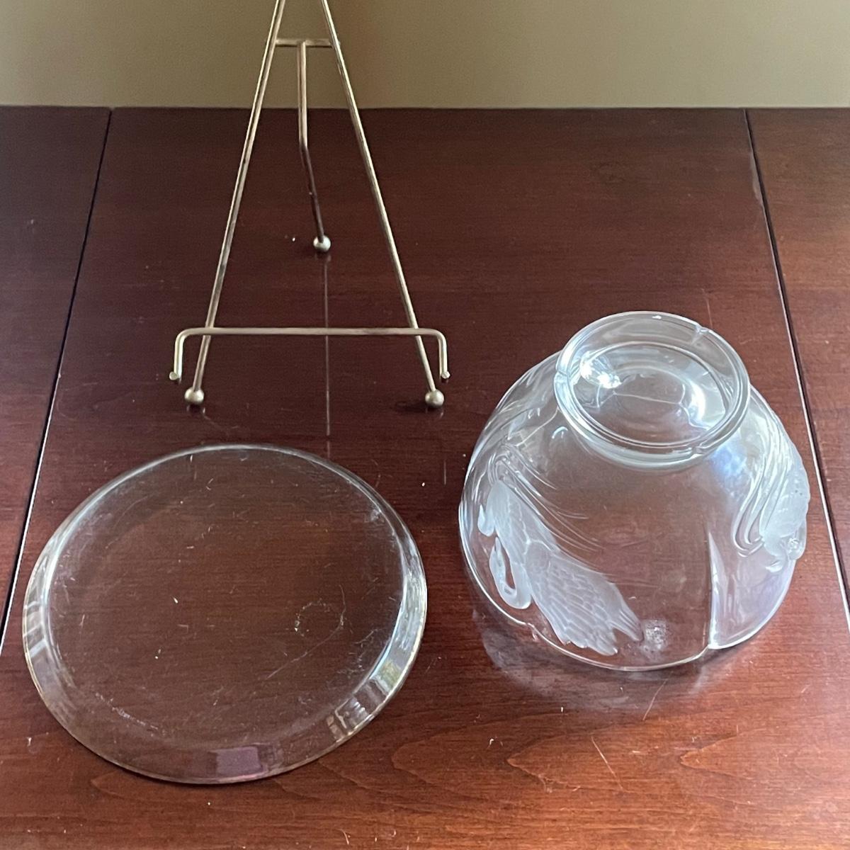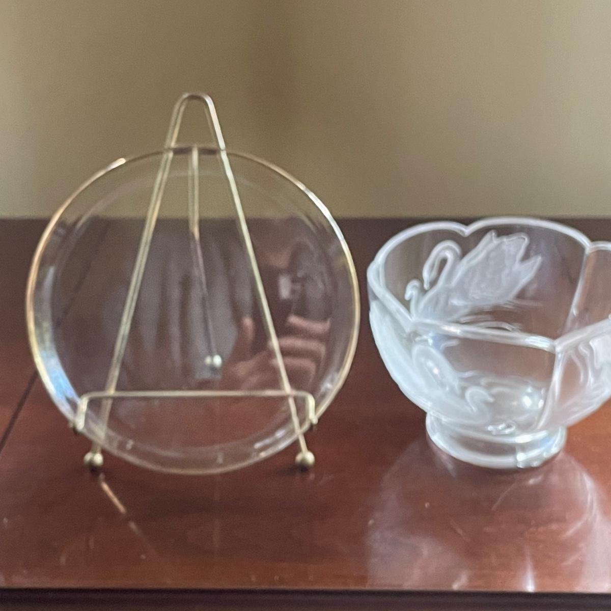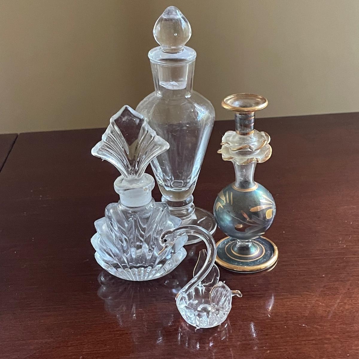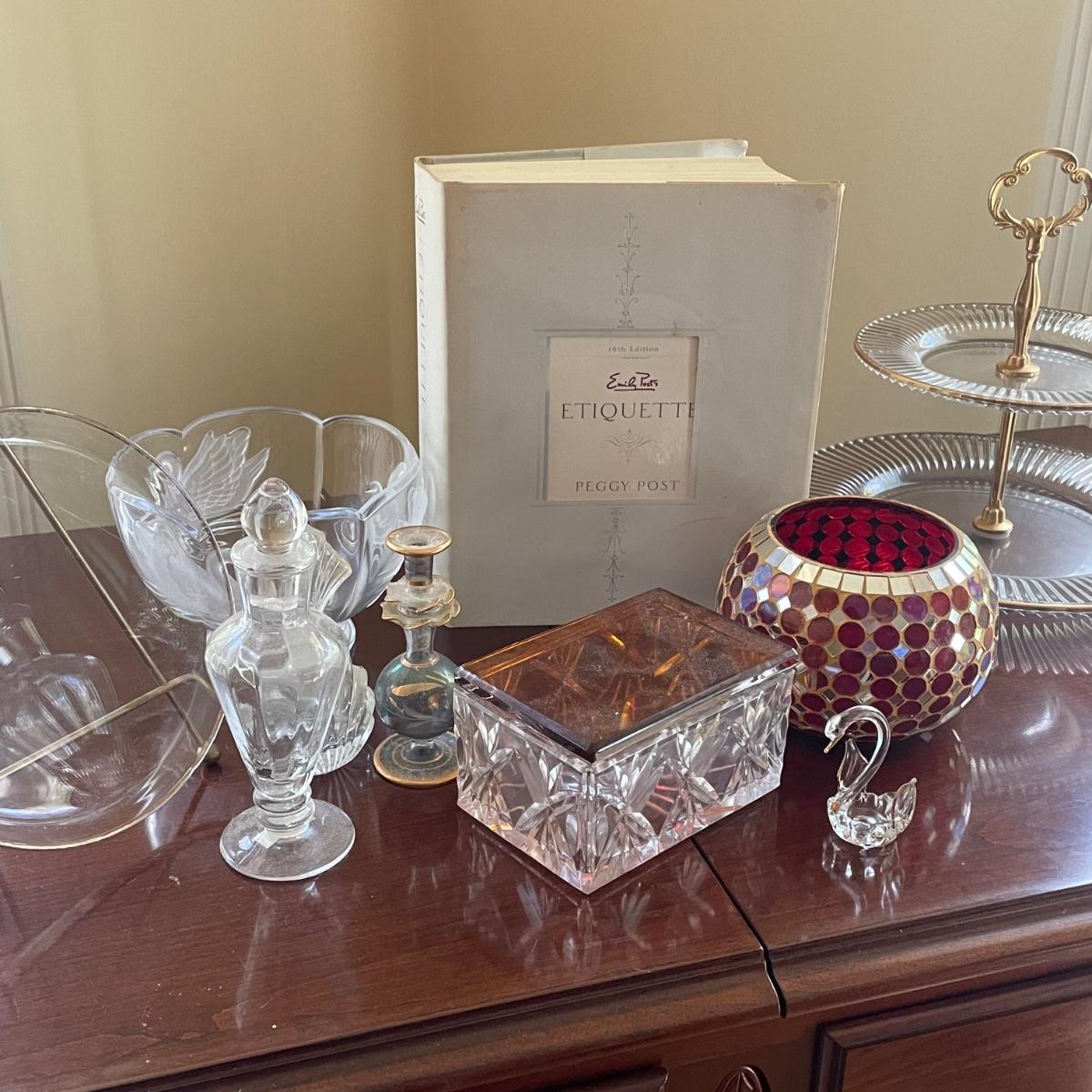 Nine items includes a small glass plate with gold colored rim that comes with a similarly colored plate stand, an amber lidded glass dish, bowl with swans, a shimmering red and silver colored bowl that is glass with mirrors on the outside and various glass perfume bottles and more. Note the glass swan has a small chip in its wing, seem image; all other items are in good condition, book has some stains, see images.