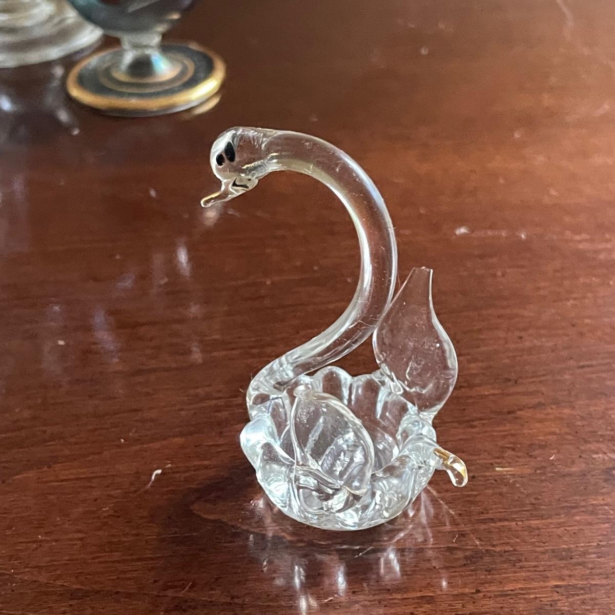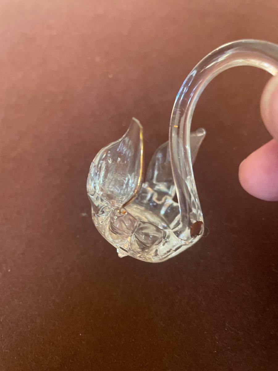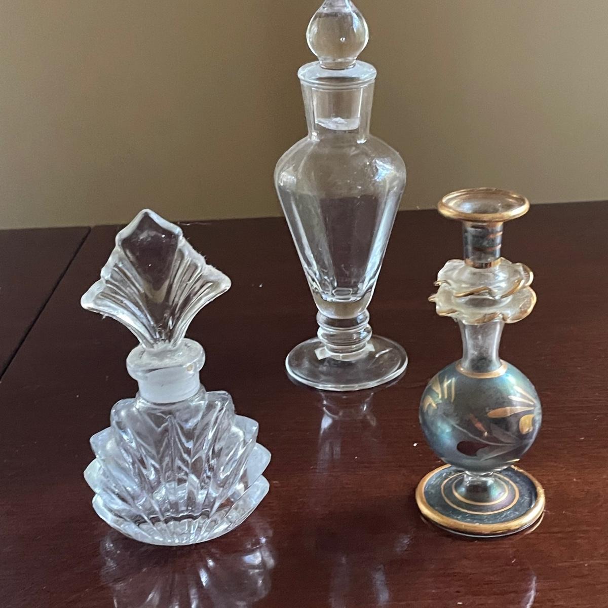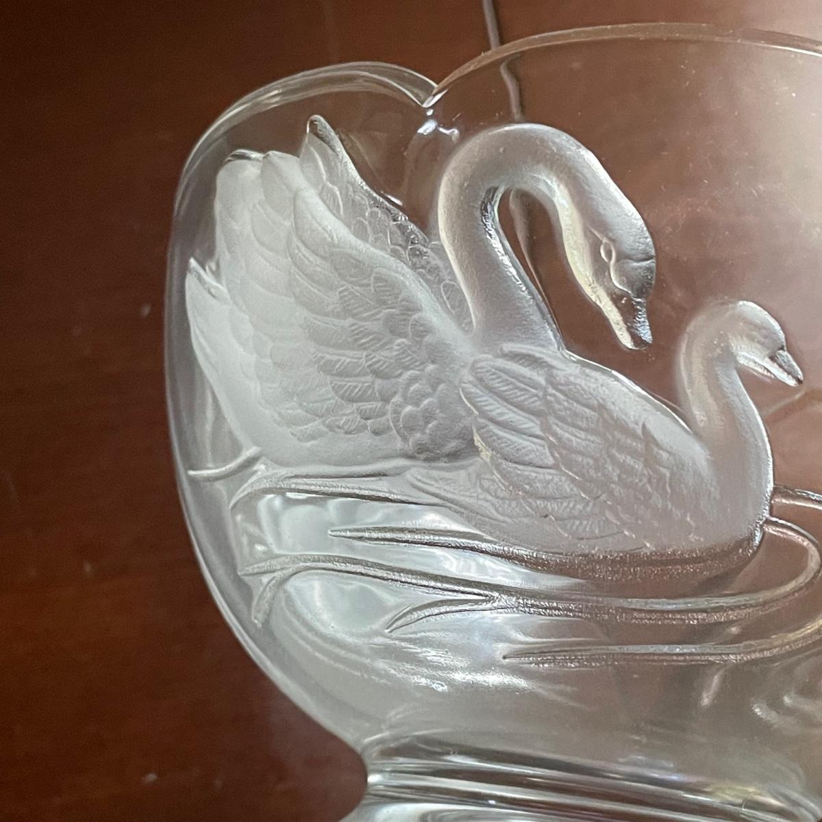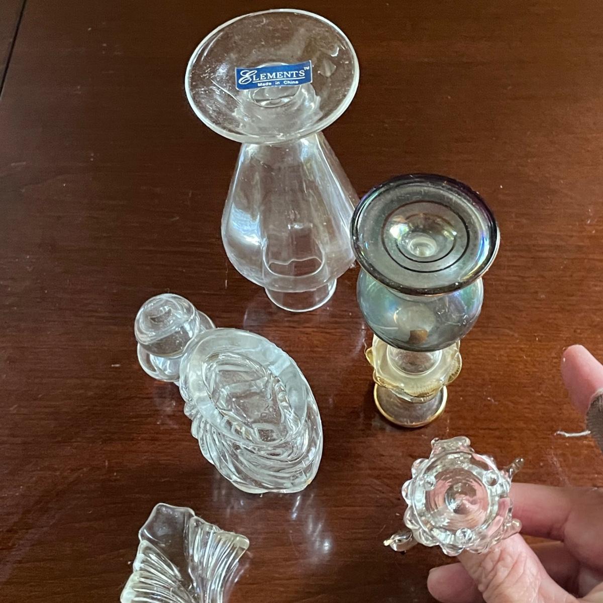 Nine items includes a small glass plate with gold colored rim that comes with a similarly colored plate stand, an amber lidded glass dish, bowl with swans, a shimmering red and silver colored bowl that is glass with mirrors on the outside and various glass perfume bottles and more. Note the glass swan has a small chip in its wing, seem image; all other items are in good condition, book has some stains, see images.