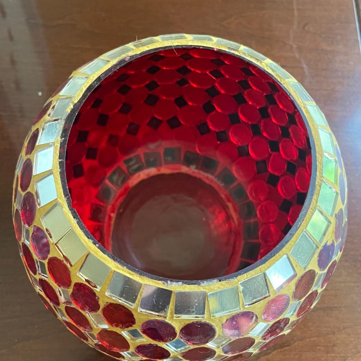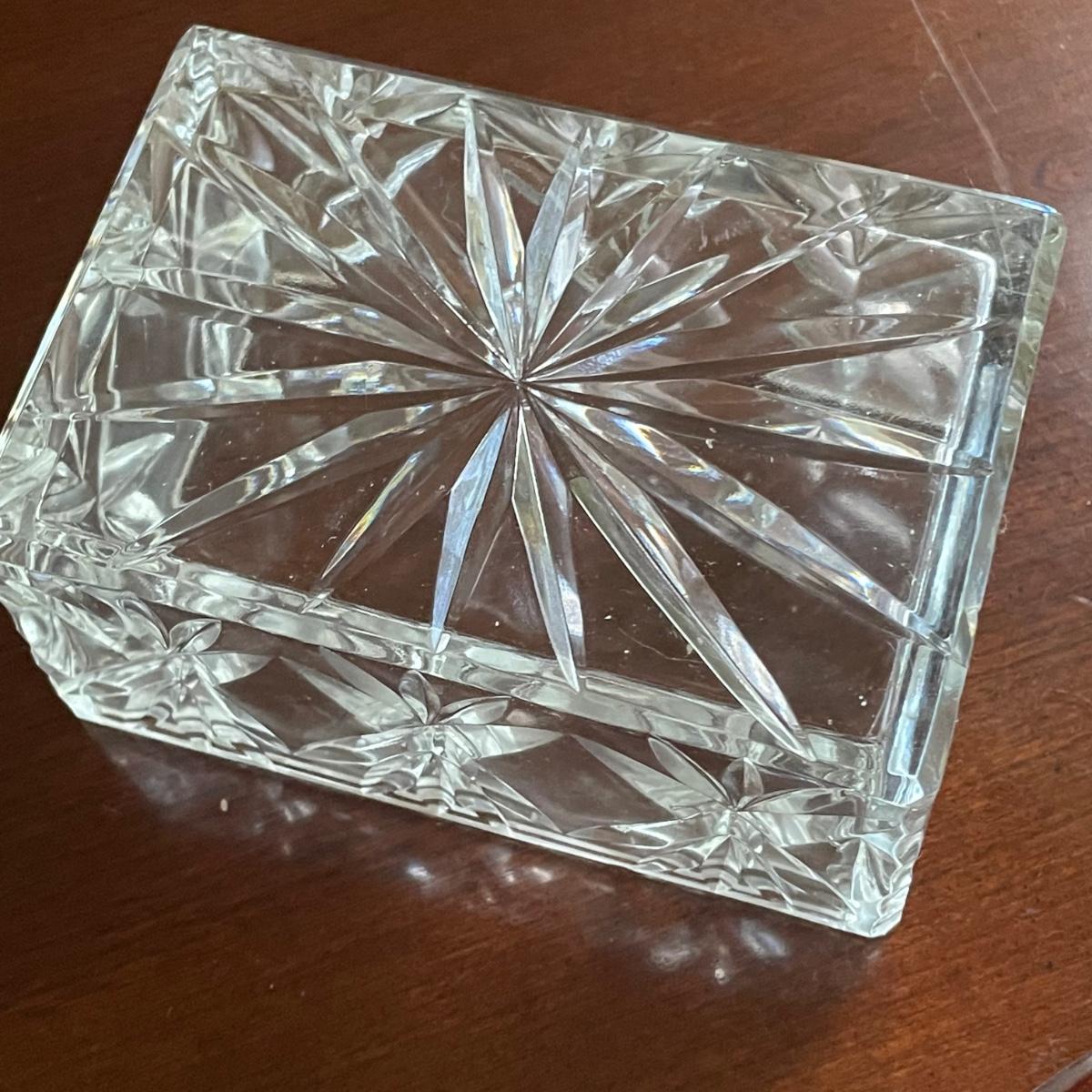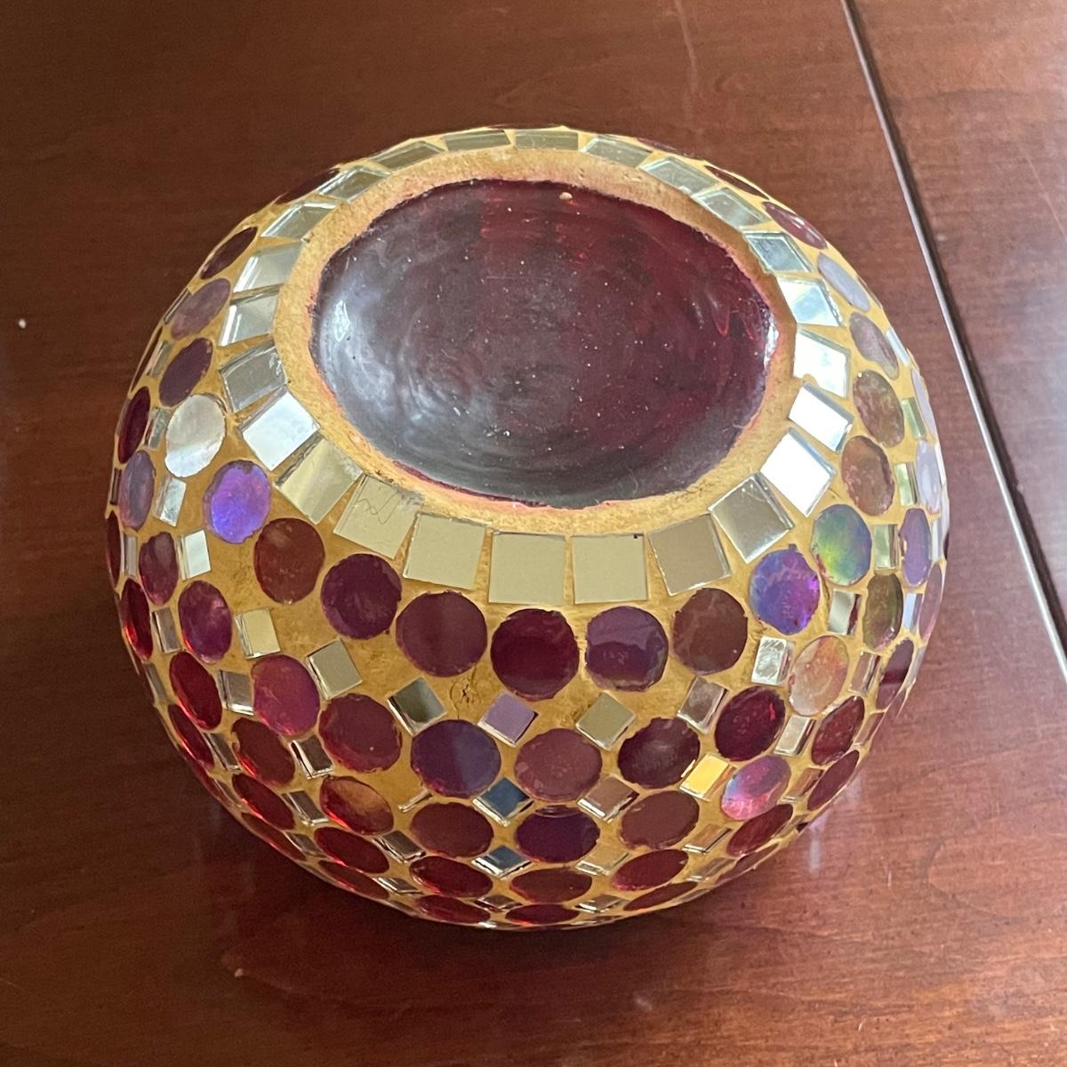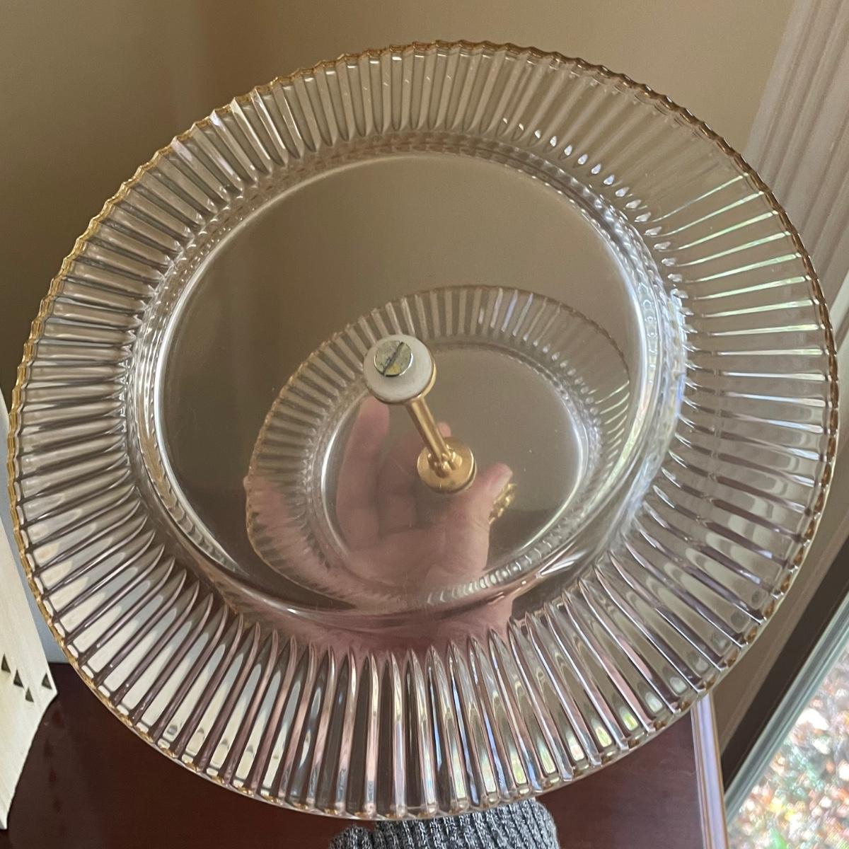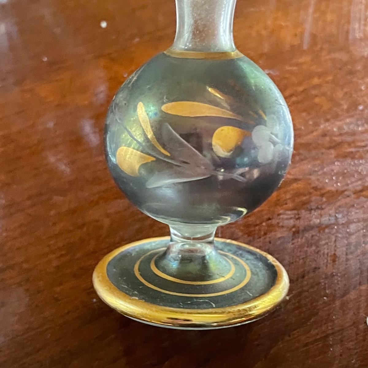 Nine items includes a small glass plate with gold colored rim that comes with a similarly colored plate stand, an amber lidded glass dish, bowl with swans, a shimmering red and silver colored bowl that is glass with mirrors on the outside and various glass perfume bottles and more. Note the glass swan has a small chip in its wing, seem image; all other items are in good condition, book has some stains, see images.