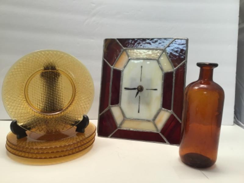 Amber Glass Lot - Vintage Bottle, Clock, 4 Pressed Glass Plates