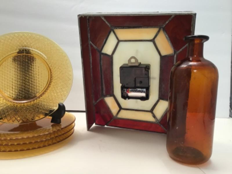 Gorgeous amber glass lot! Clock requires C battery. Stained glass with leaded glass. Very Old bottle!