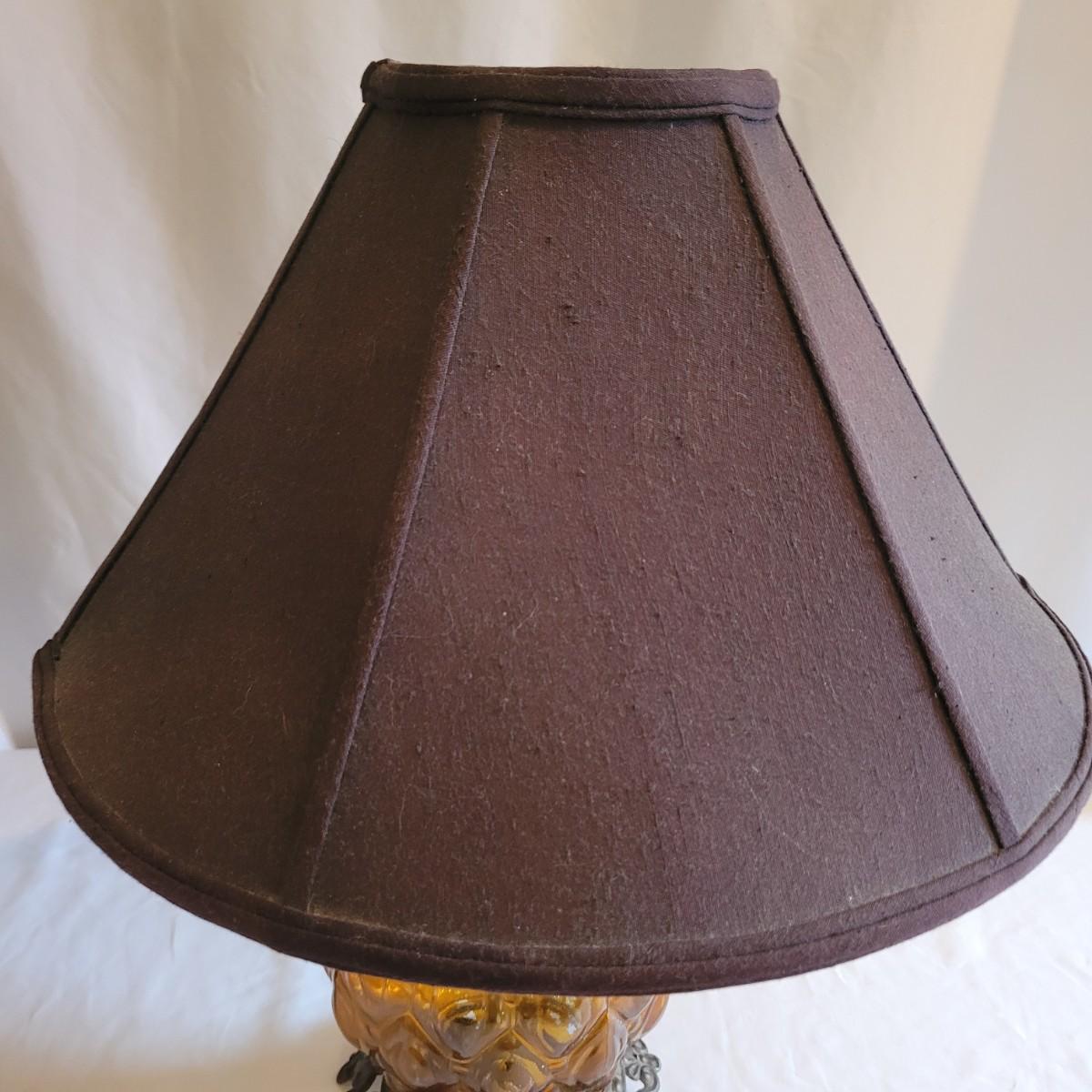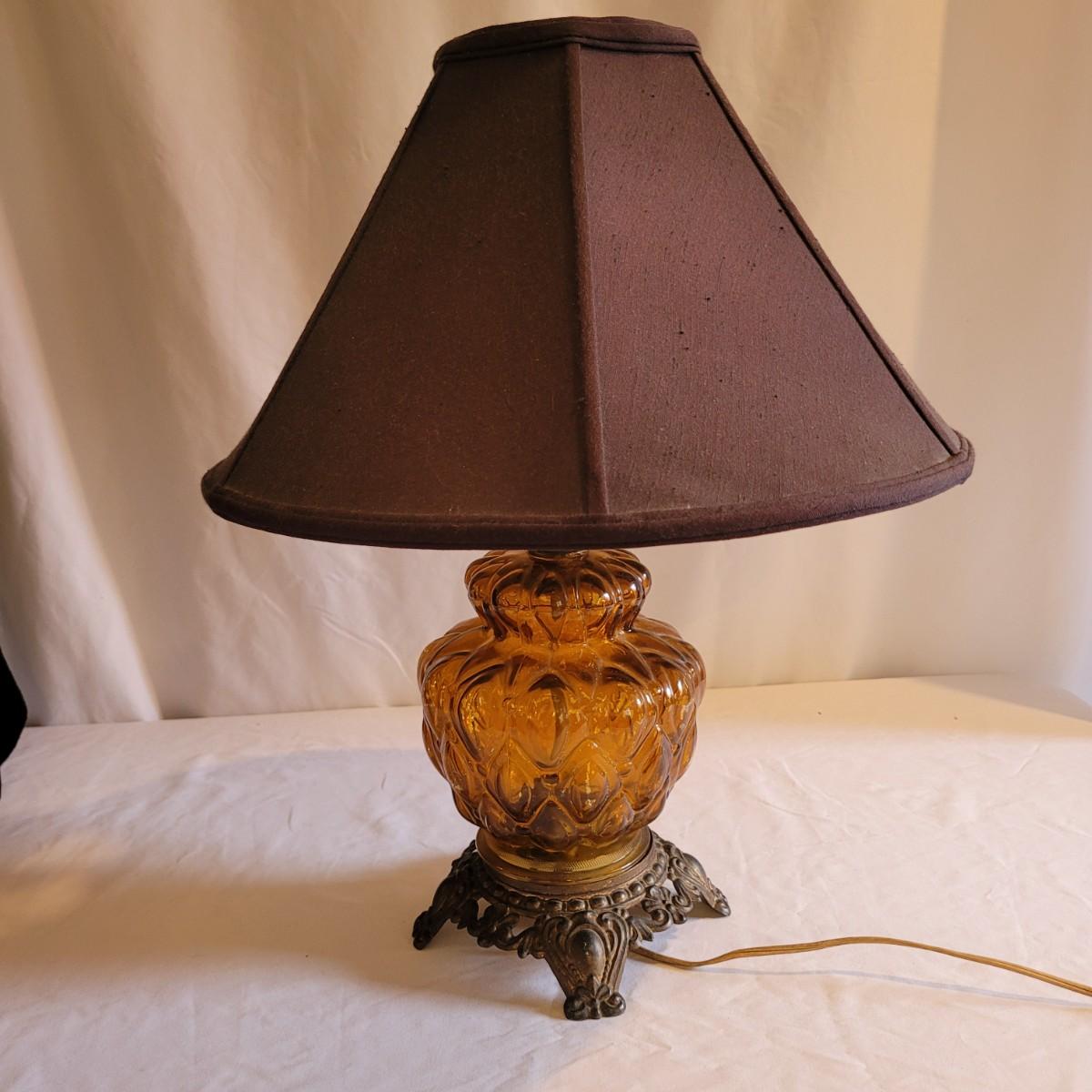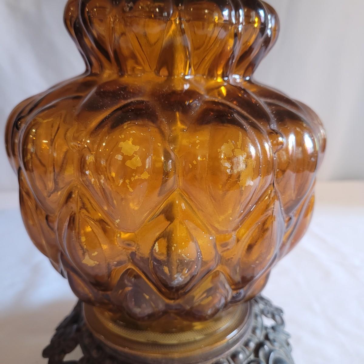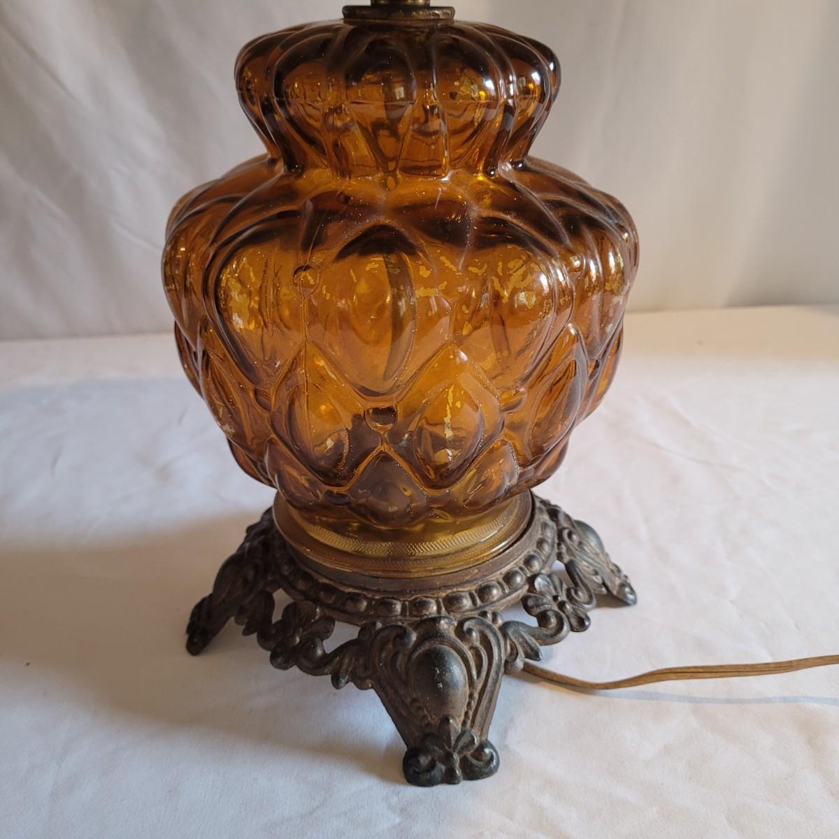 This auction is for amber glass hurricane lamp. This lamp features an amber glass bauble with textures patterns. Likely dating back to the 1960s or 70s. It features a metal base and dark fabric lamp shade. Has a key style switch and turns on when plugged in. Amber glass has some scuffs. Includes light bulb. Lamp measures 7" x 7" x 20.5"H.