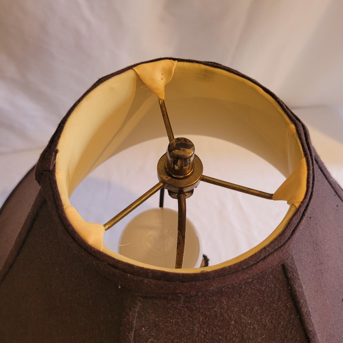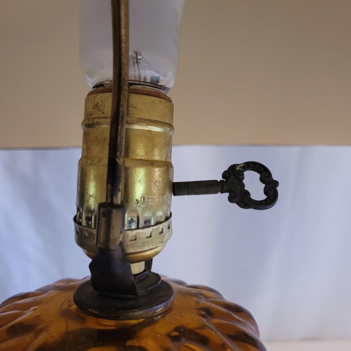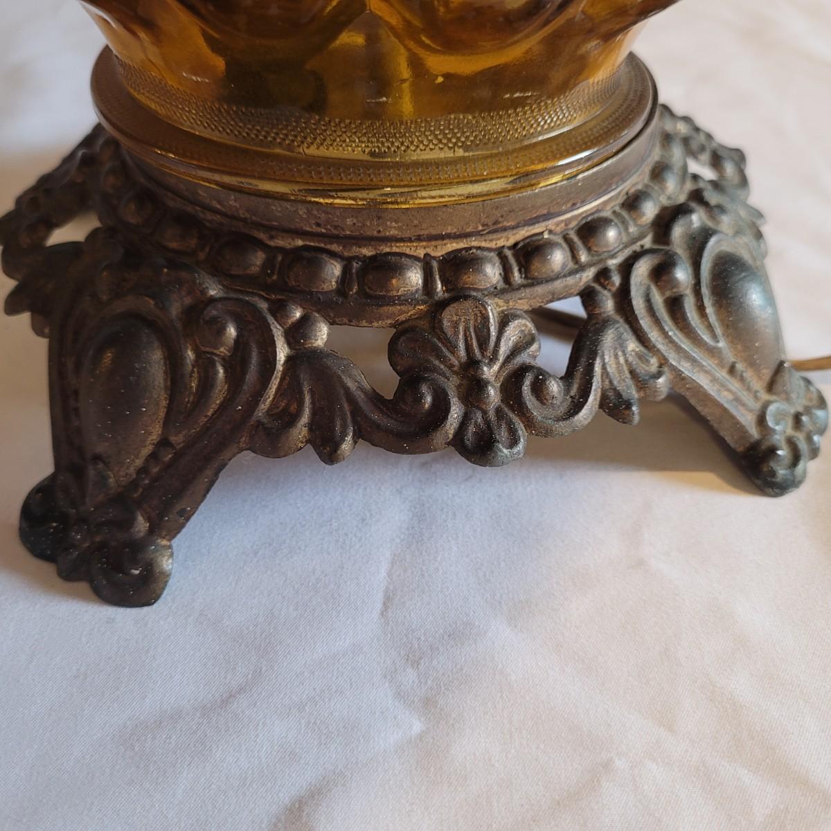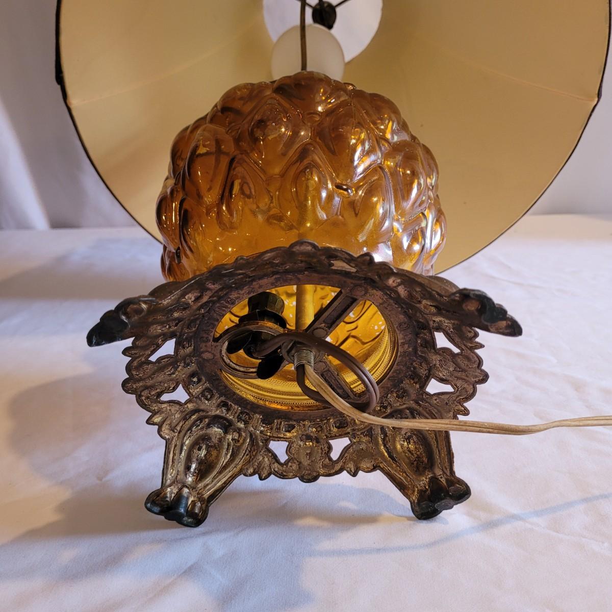 This auction is for amber glass hurricane lamp. This lamp features an amber glass bauble with textures patterns. Likely dating back to the 1960s or 70s. It features a metal base and dark fabric lamp shade. Has a key style switch and turns on when plugged in. Amber glass has some scuffs. Includes light bulb. Lamp measures 7" x 7" x 20.5"H.