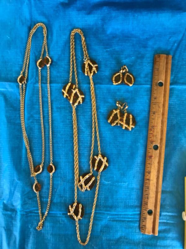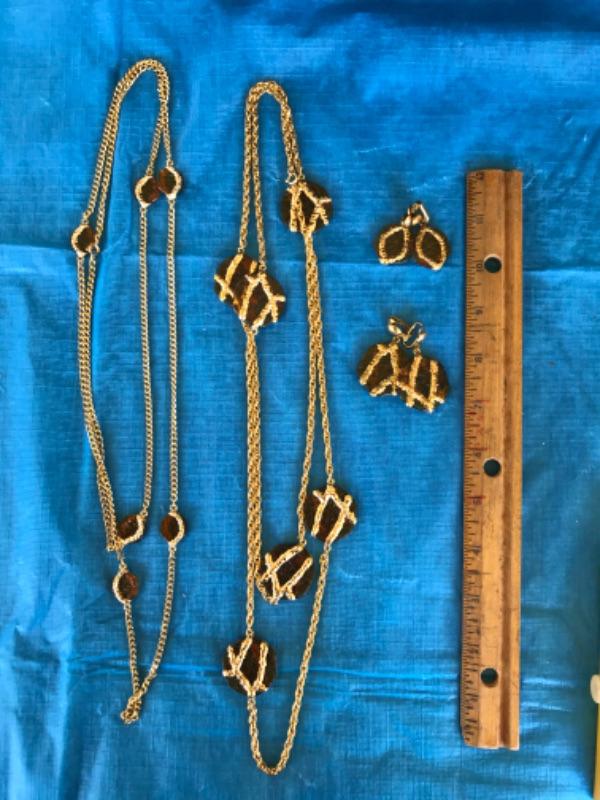 4 mix & match jewelry pieces. 2 necklaces and 2 pairs of clip earrings. Goldtone metal with plastic amber pieces.