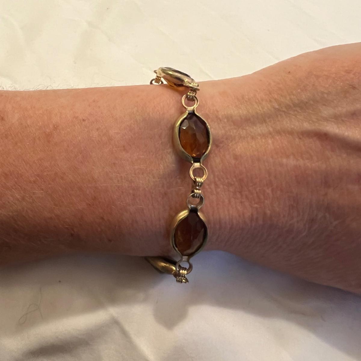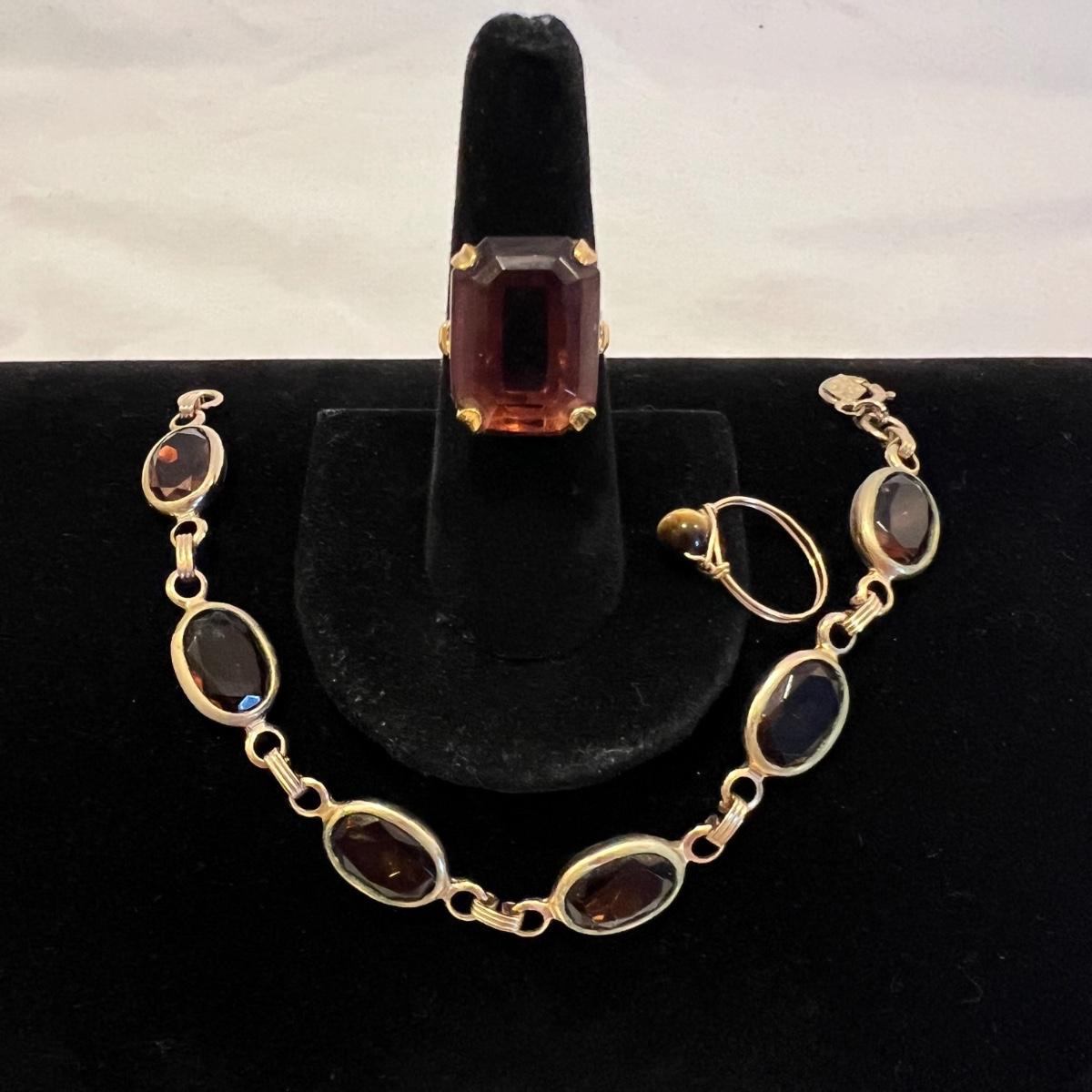 A collection of gold colored jewelry with amber colored gemstones that are likely faux. See images for sizes.
